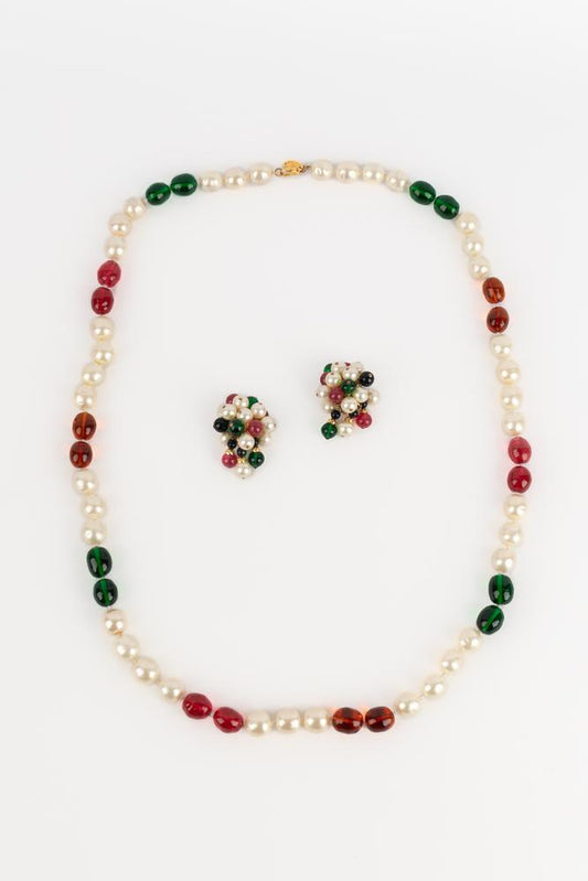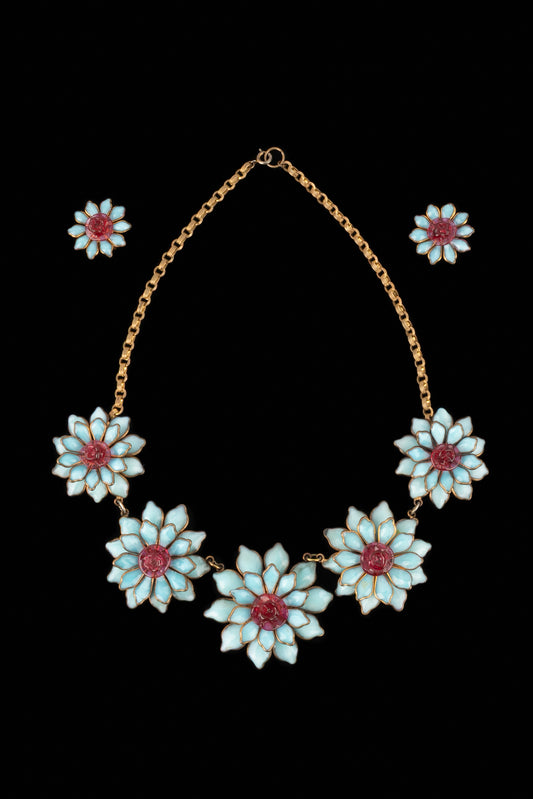 Earrings and brooch set in gilded metal and glass paste representing flowers