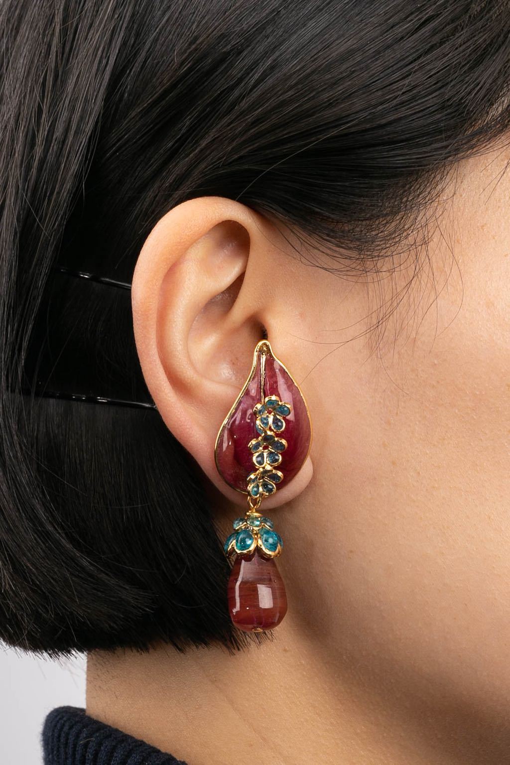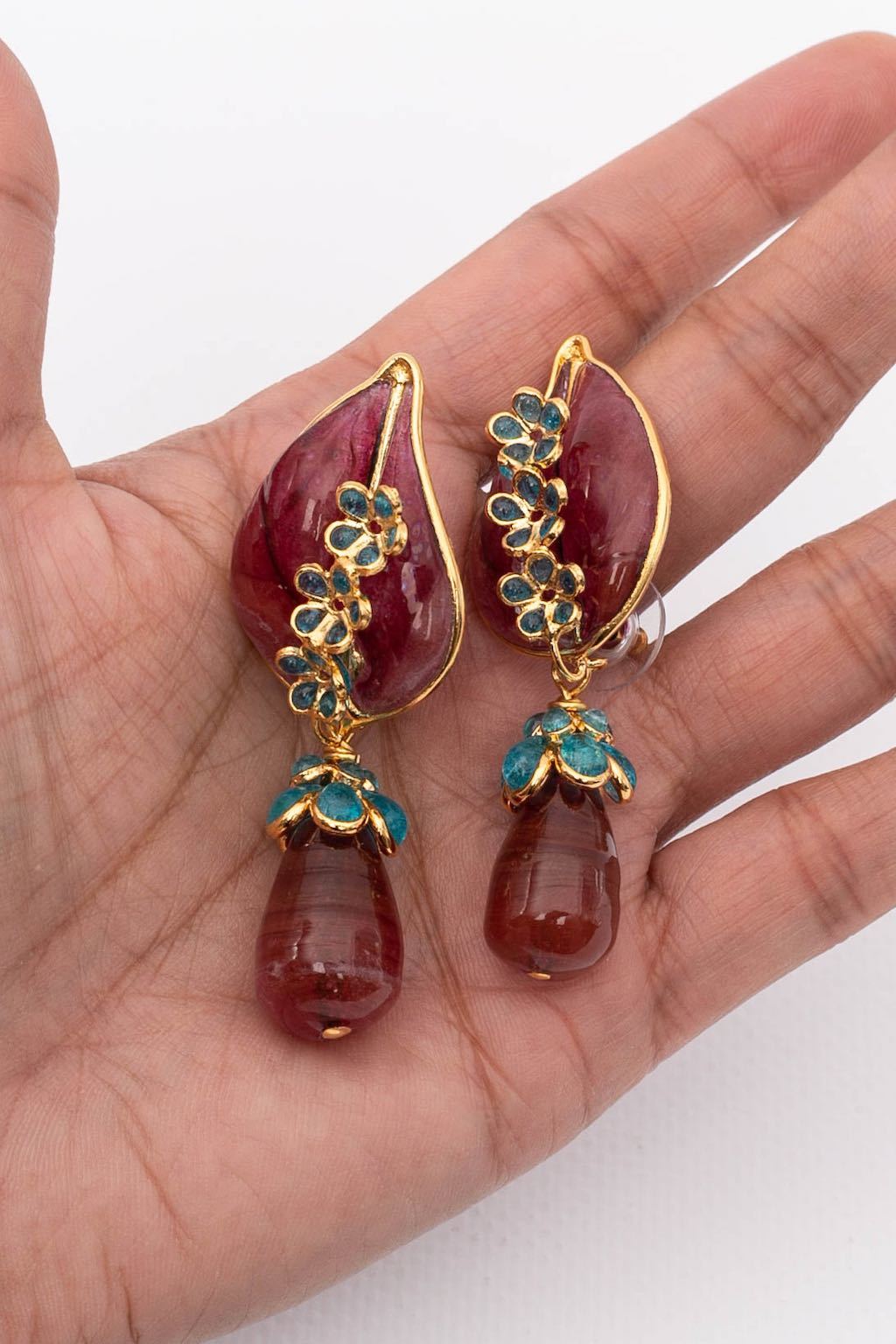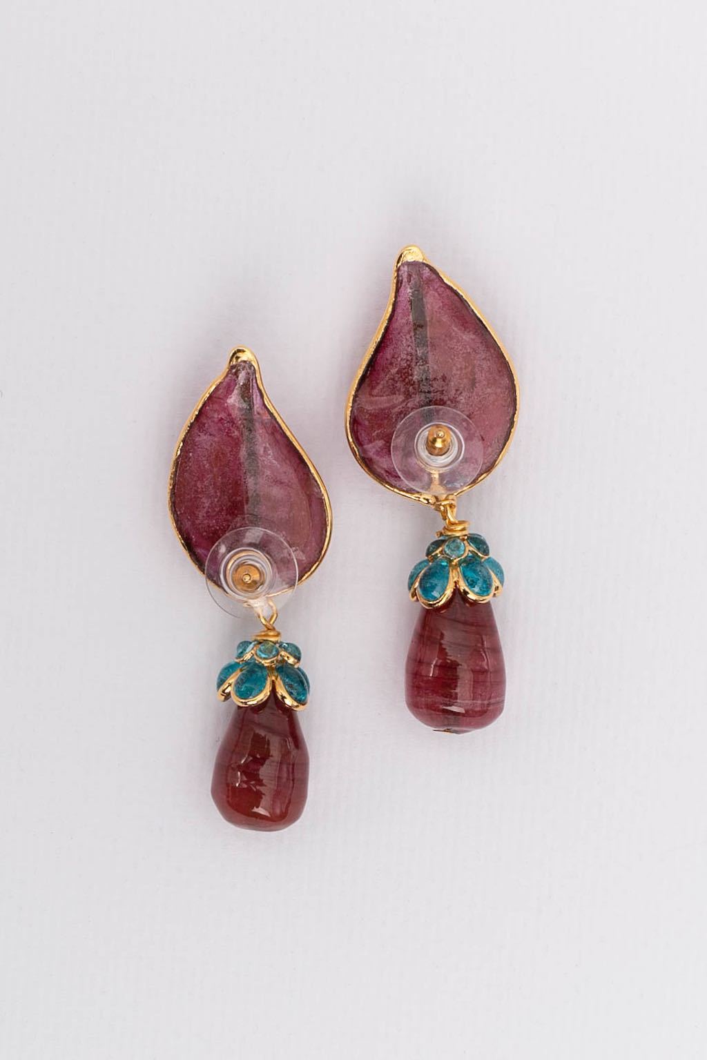 AUGUSTINE - Golen metal earrings with pink glass paste. Signature engraved into the pin.