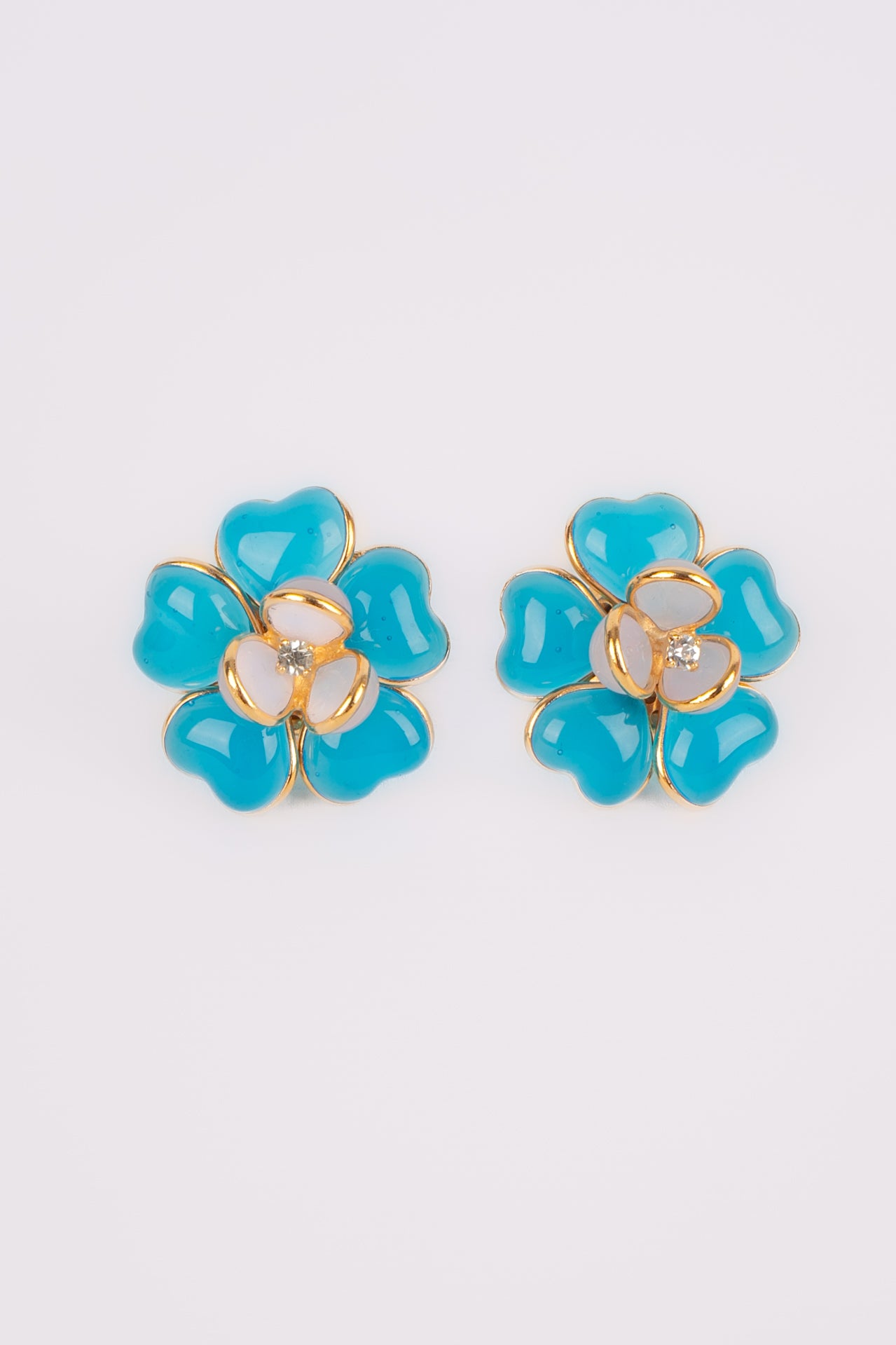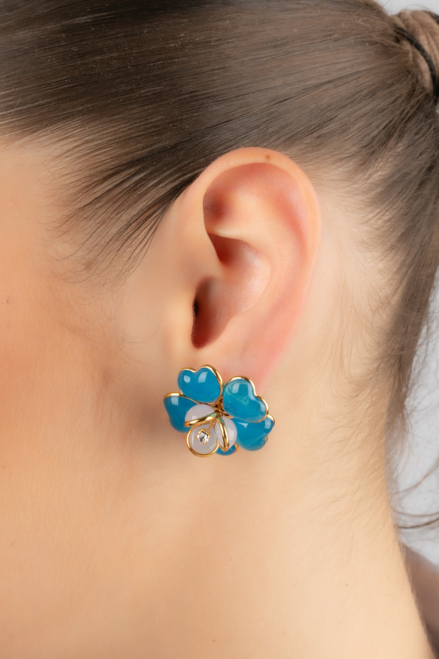 AUGUSTINE - (Made in France) Golden metal two-tone flower earrings with glass paste and decorated with a rhinestone.