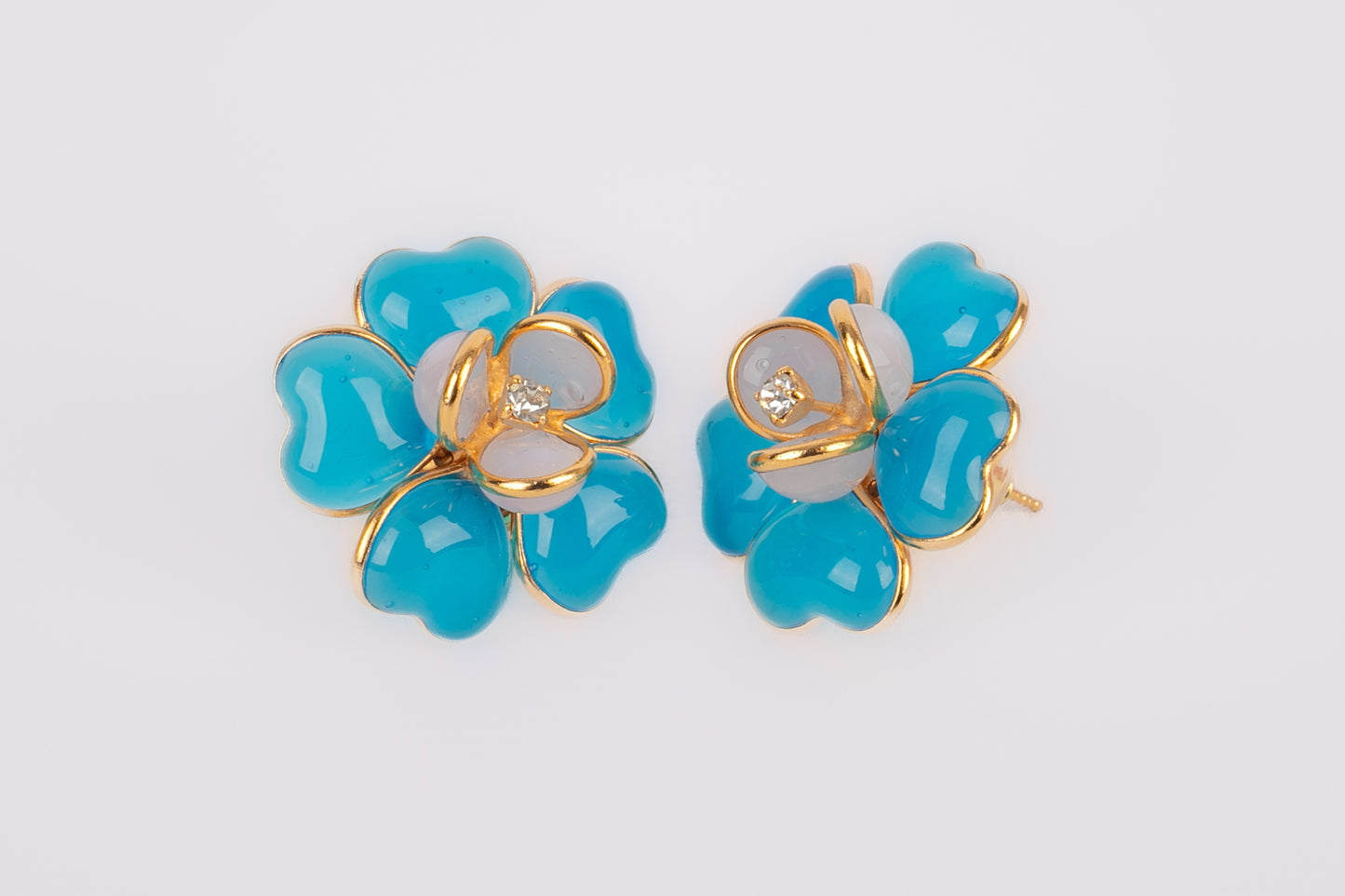 Developed by Gripoix in the 19th century, the glass paste technique uses coloured glass pieces, finely shaped, bringing a touch of art and sophistication to the creations of Augustine.