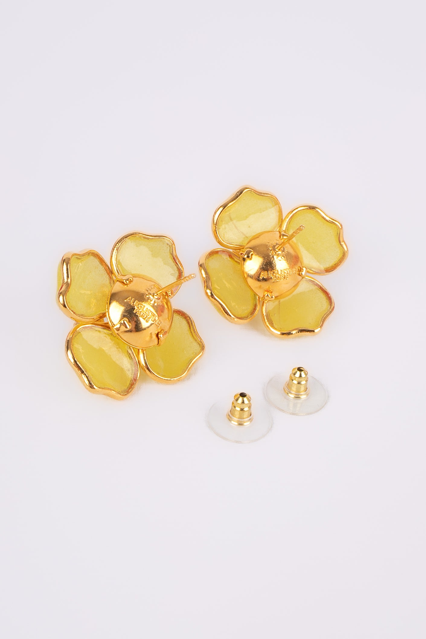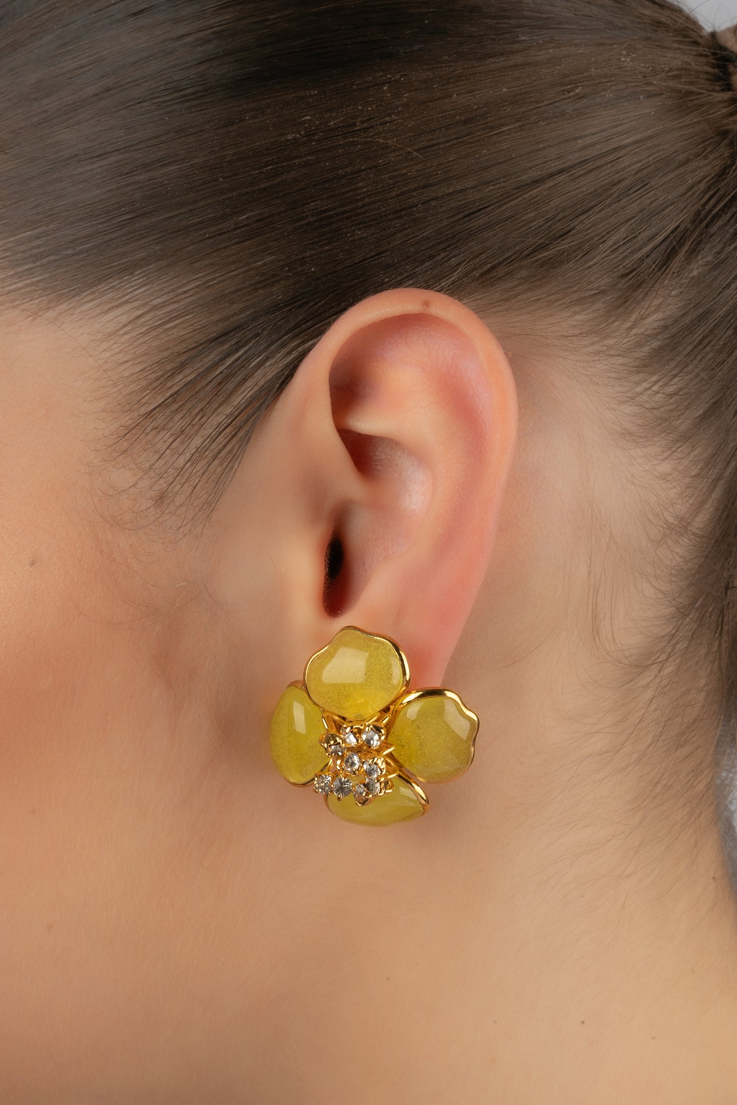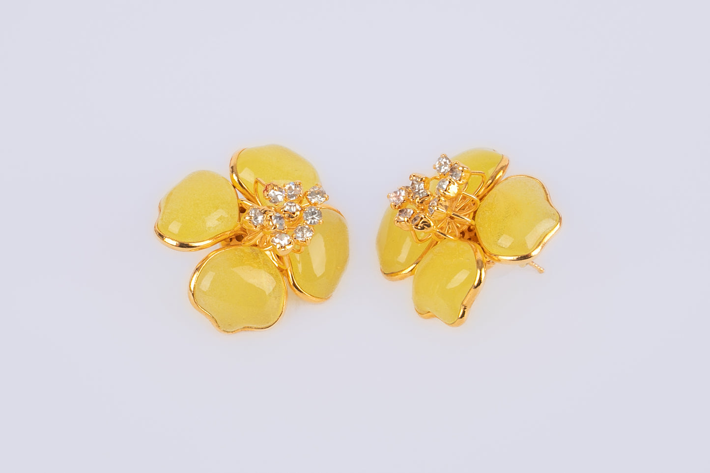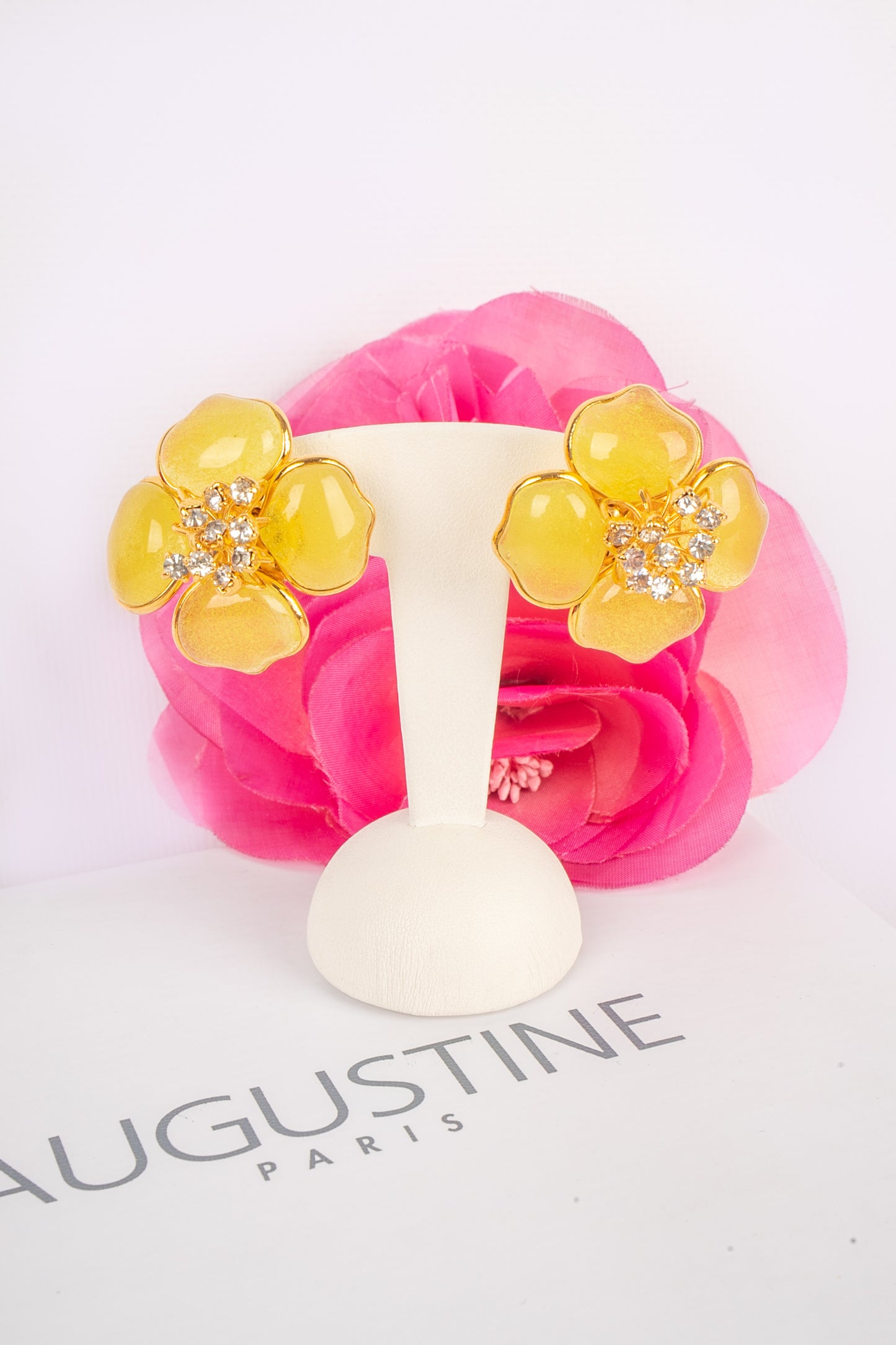 AUGUSTINE - (Made in France) Golden metal flower earrings with yellow glass paste and decorated with rhinestones.