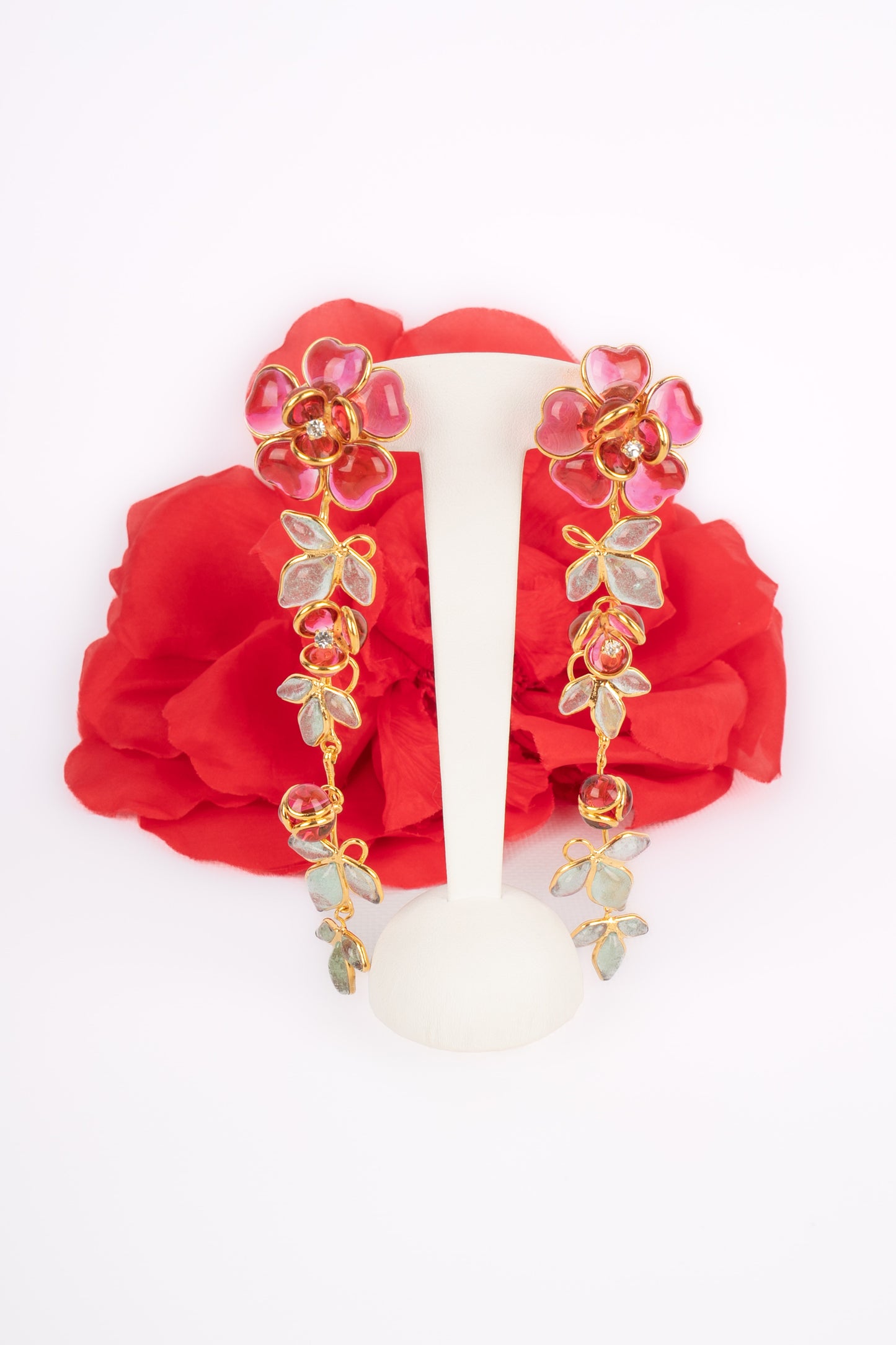 AUGUSTINE - (Made in France) Long golden metal earrings with pink glass paste.