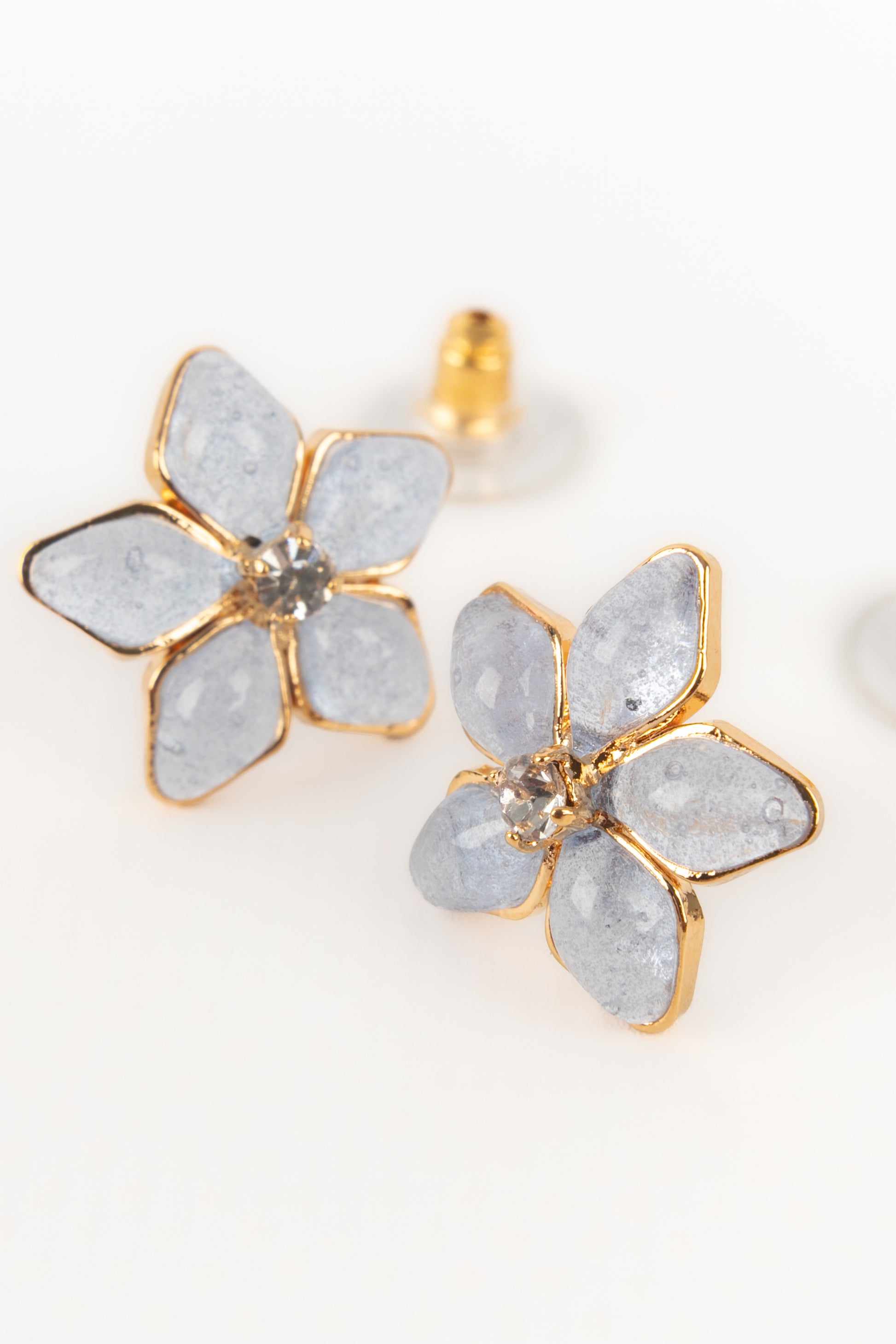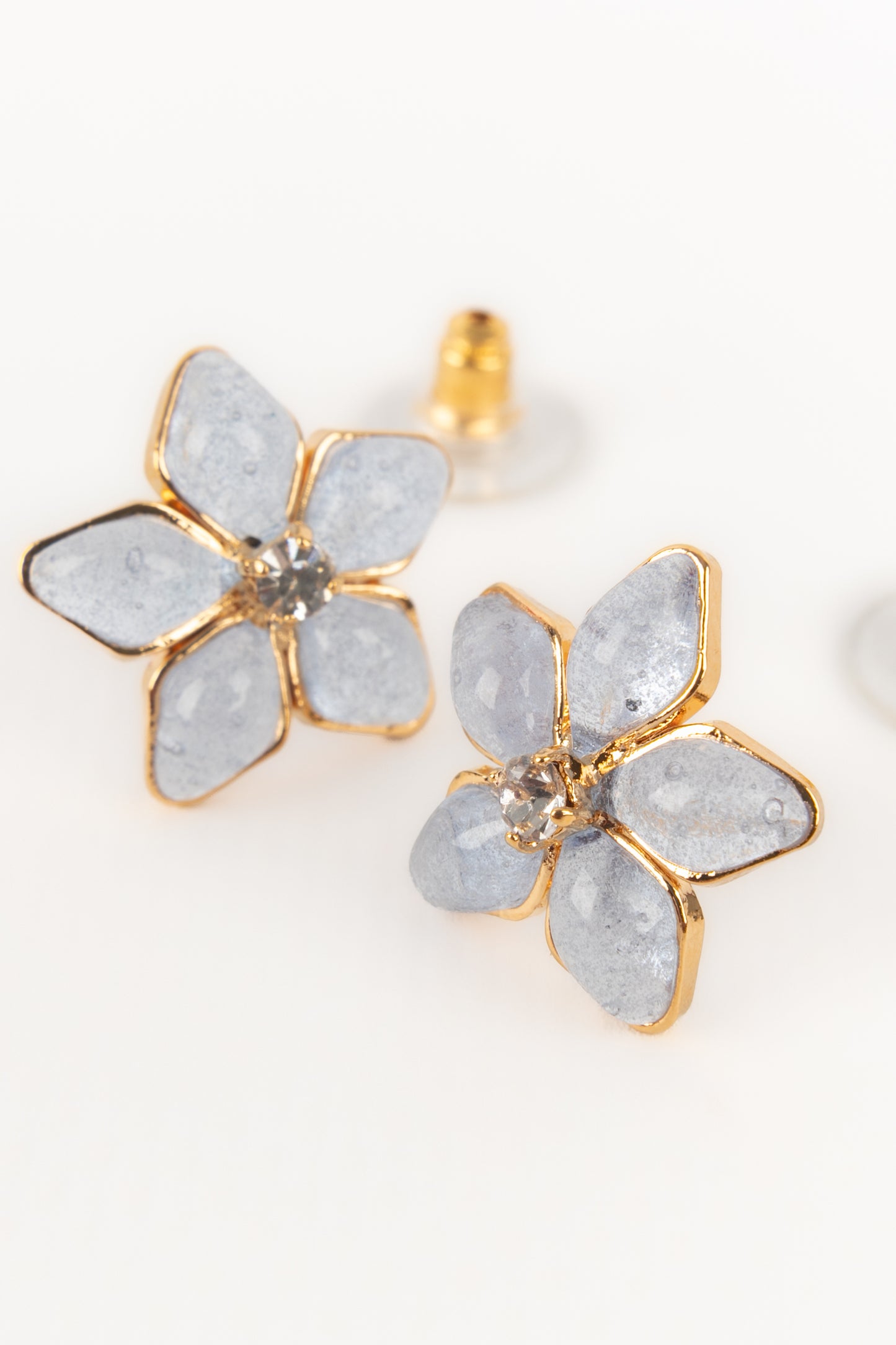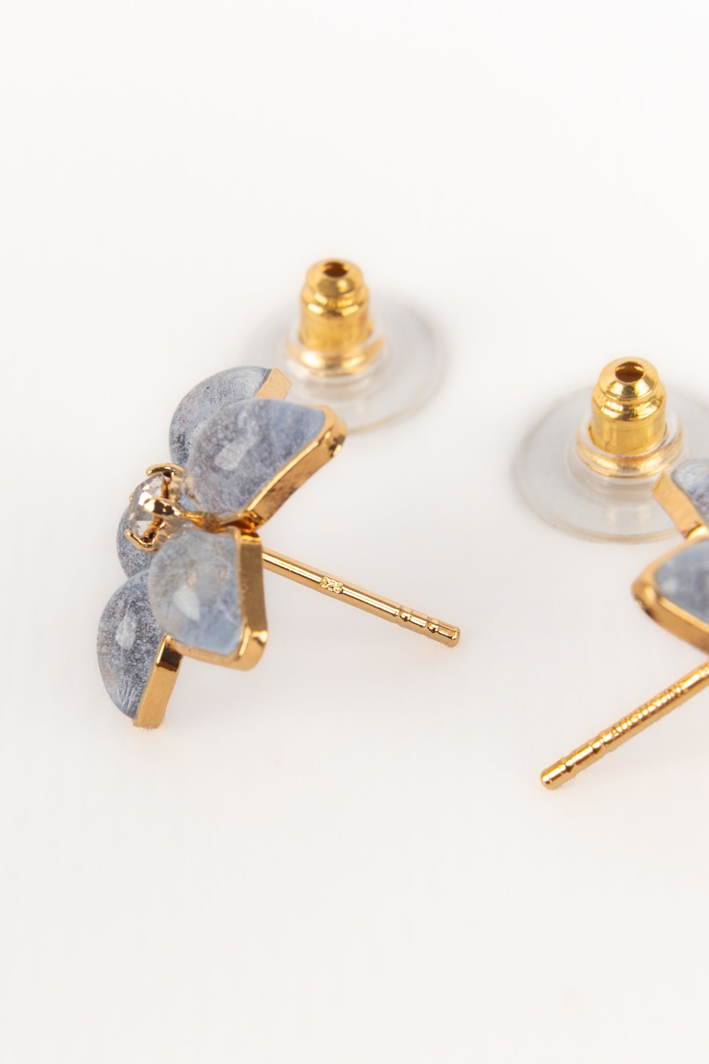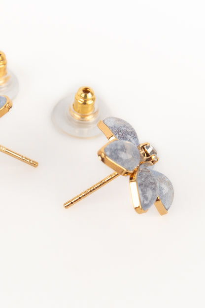 AUGUSTINE - (Made in France) Golden metal earrings with rhinestones and greyish-blue transparent glass paste.