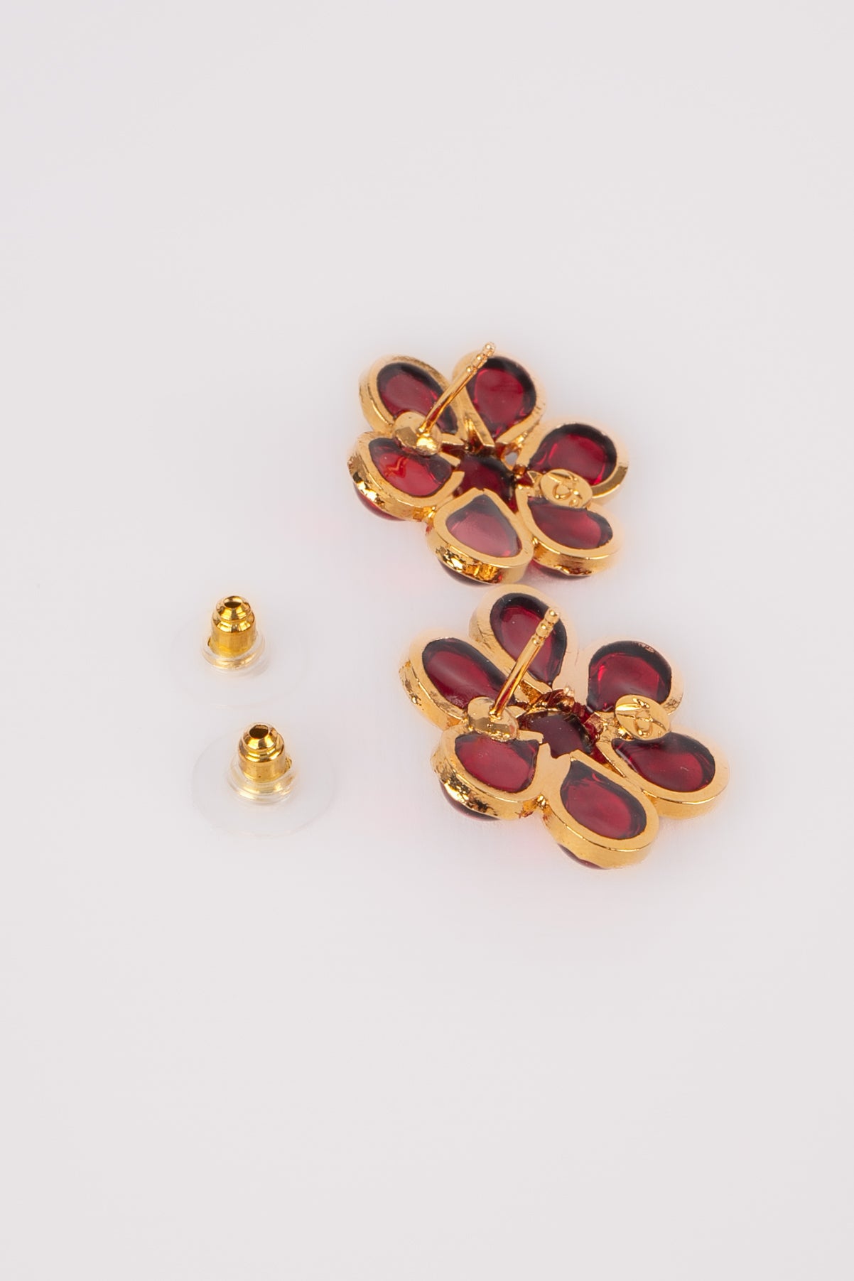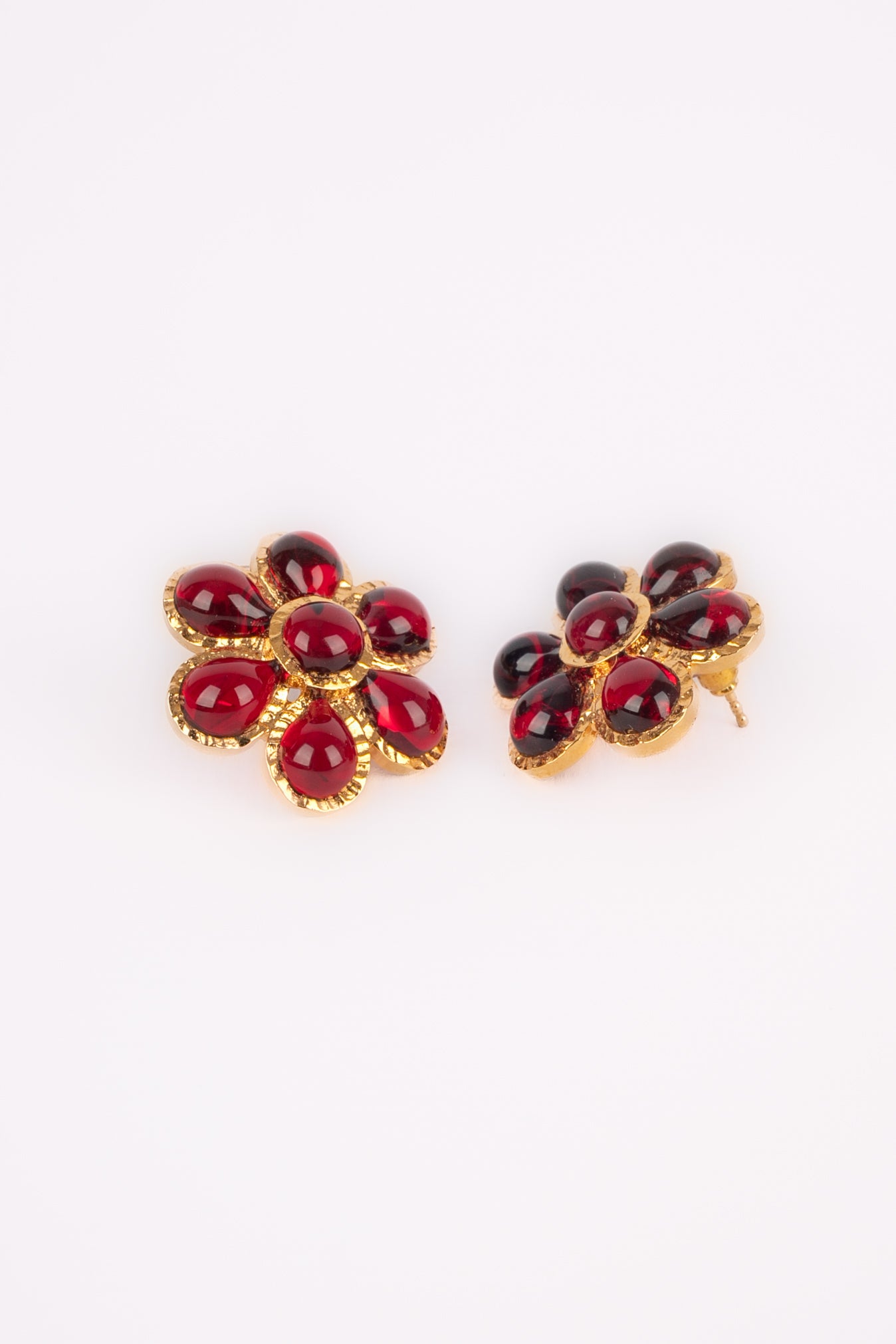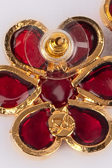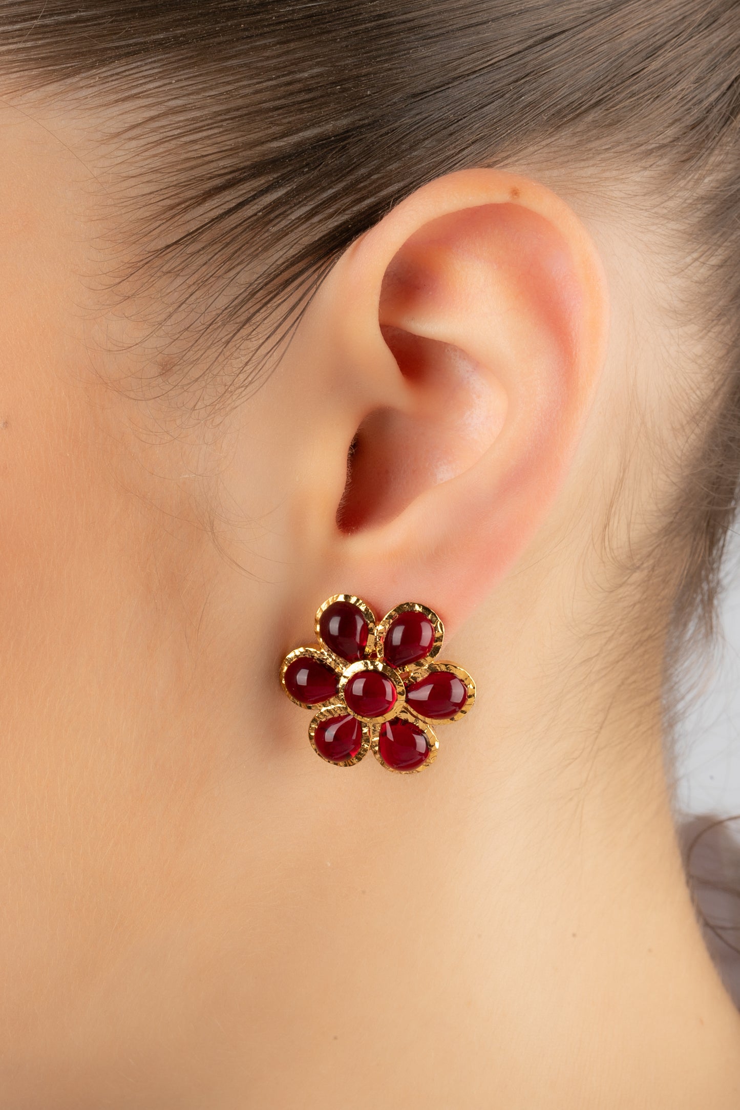AUGUSTINE - (Made in France) Golden metal flower earrings with red glass paste.