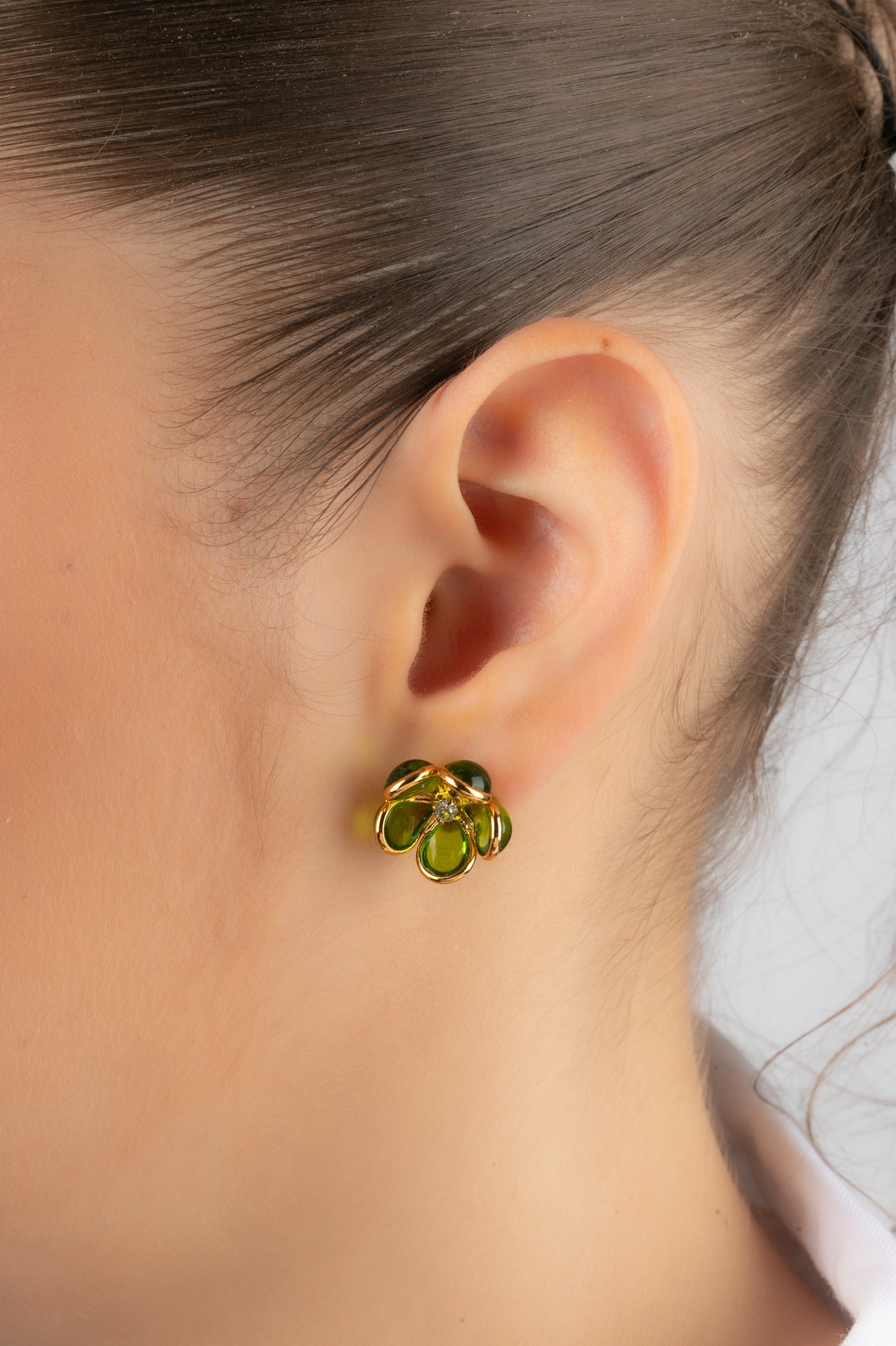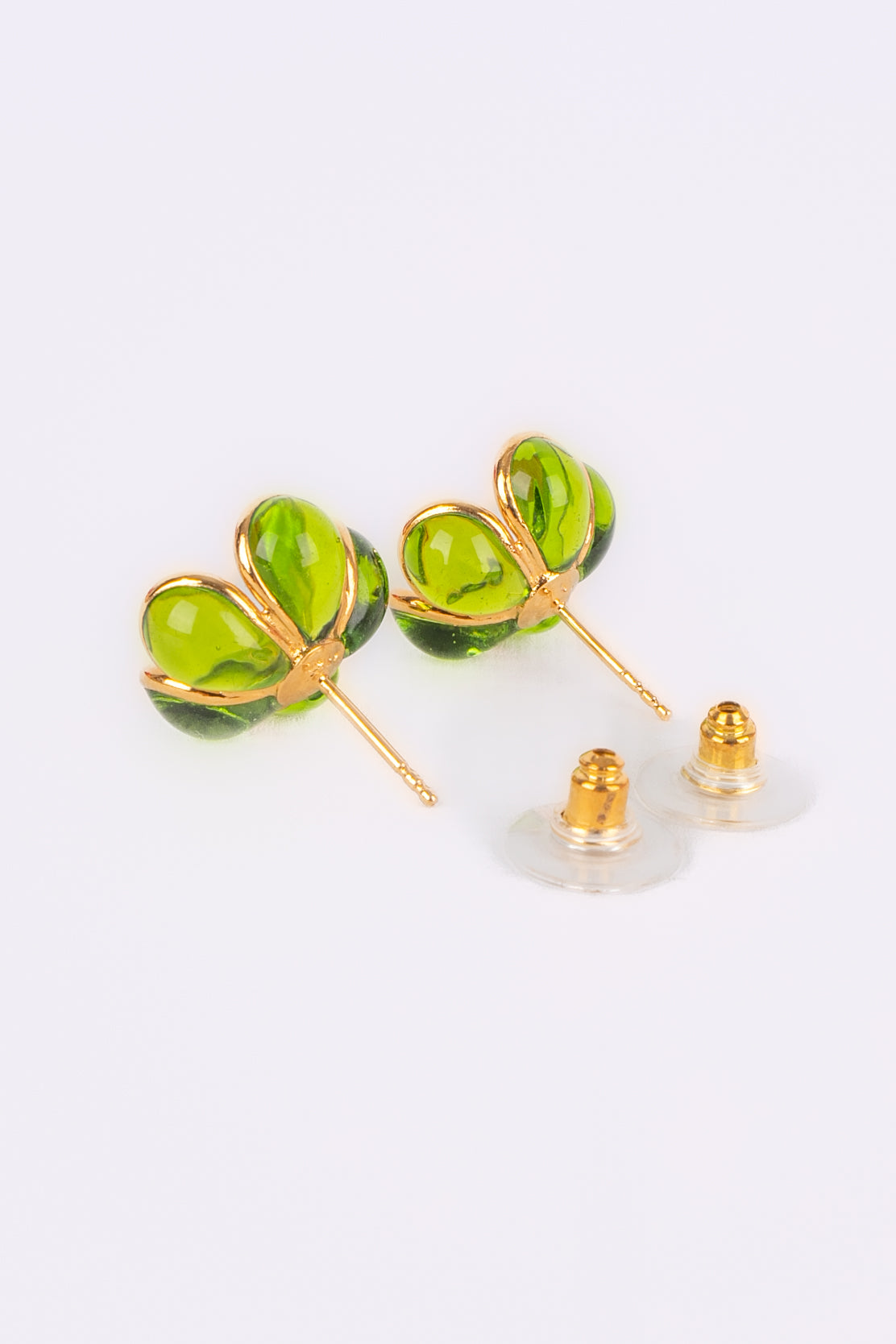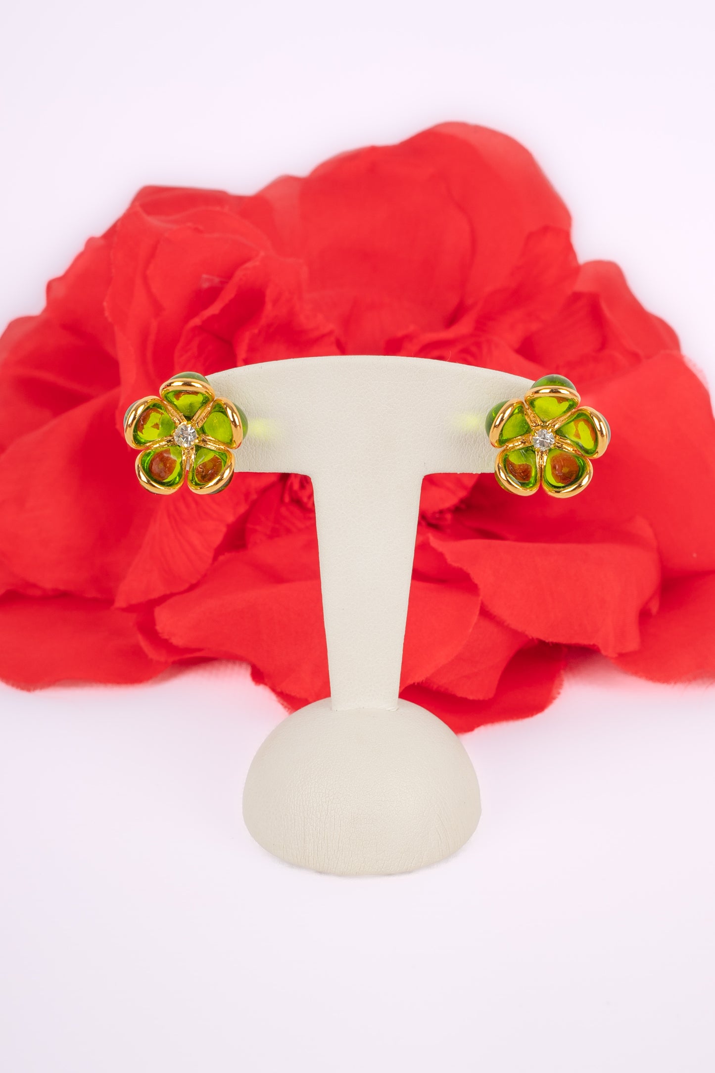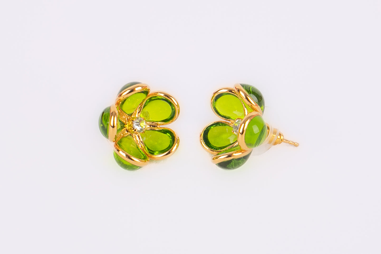 AUGUSTINE - (Made in France) Golden metal flower earrings with rhinestones and green glass paste.