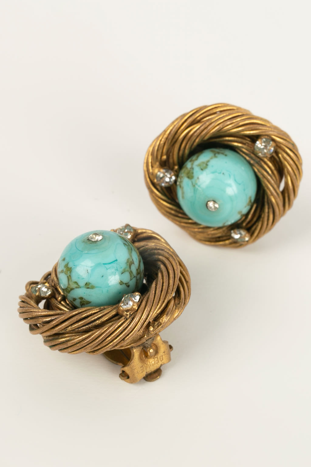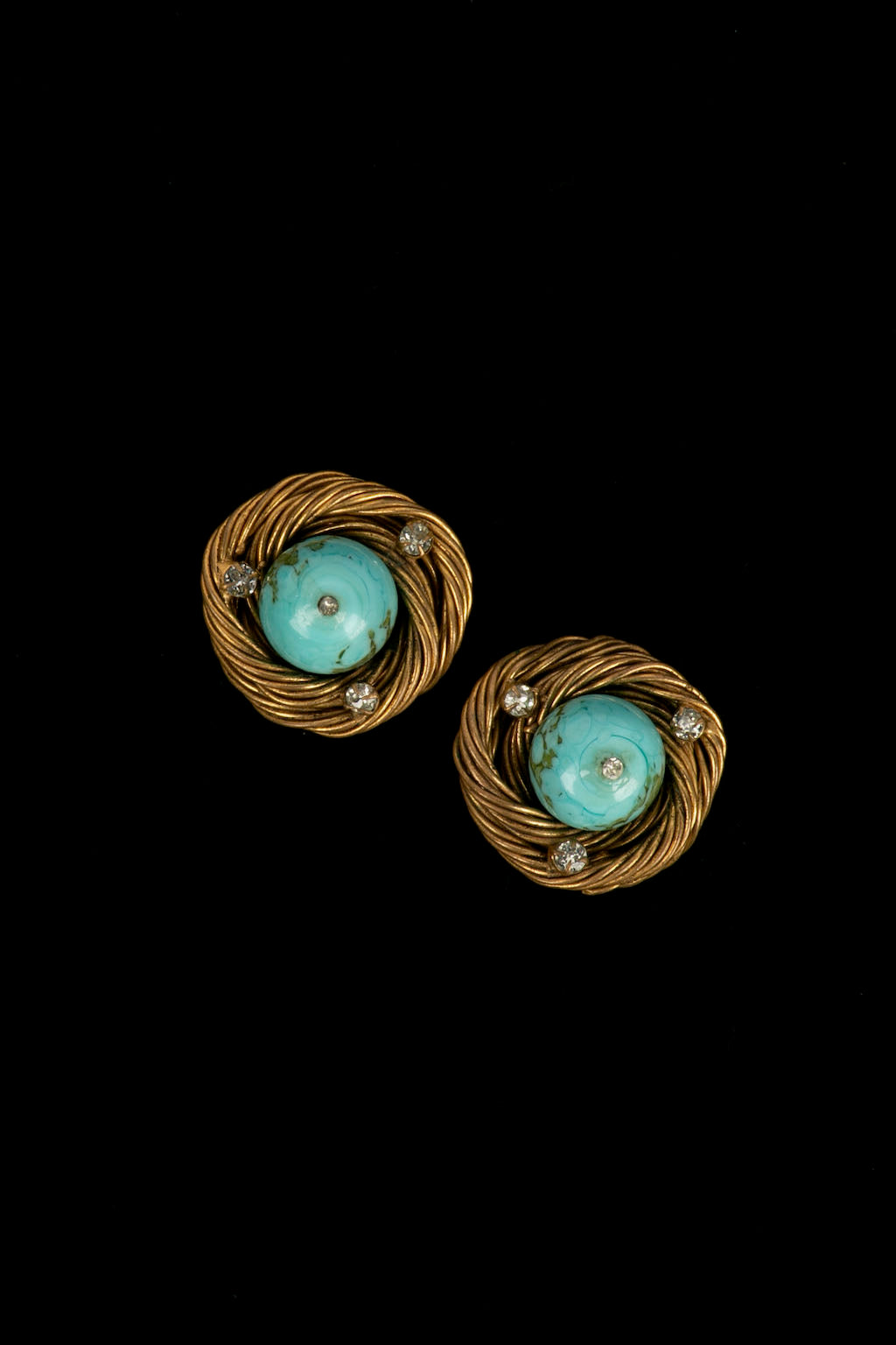 CHANEL -Golden metal and rhinestone clip-on earrings, topped with a turquoise pearl.