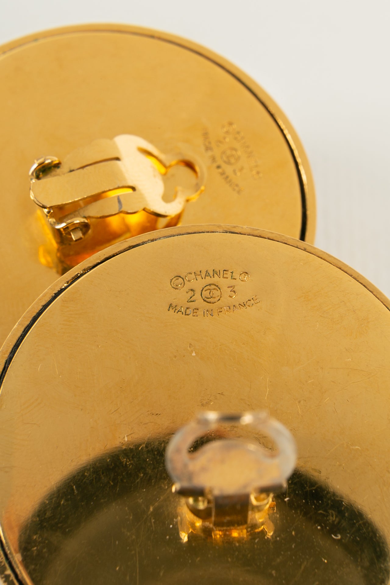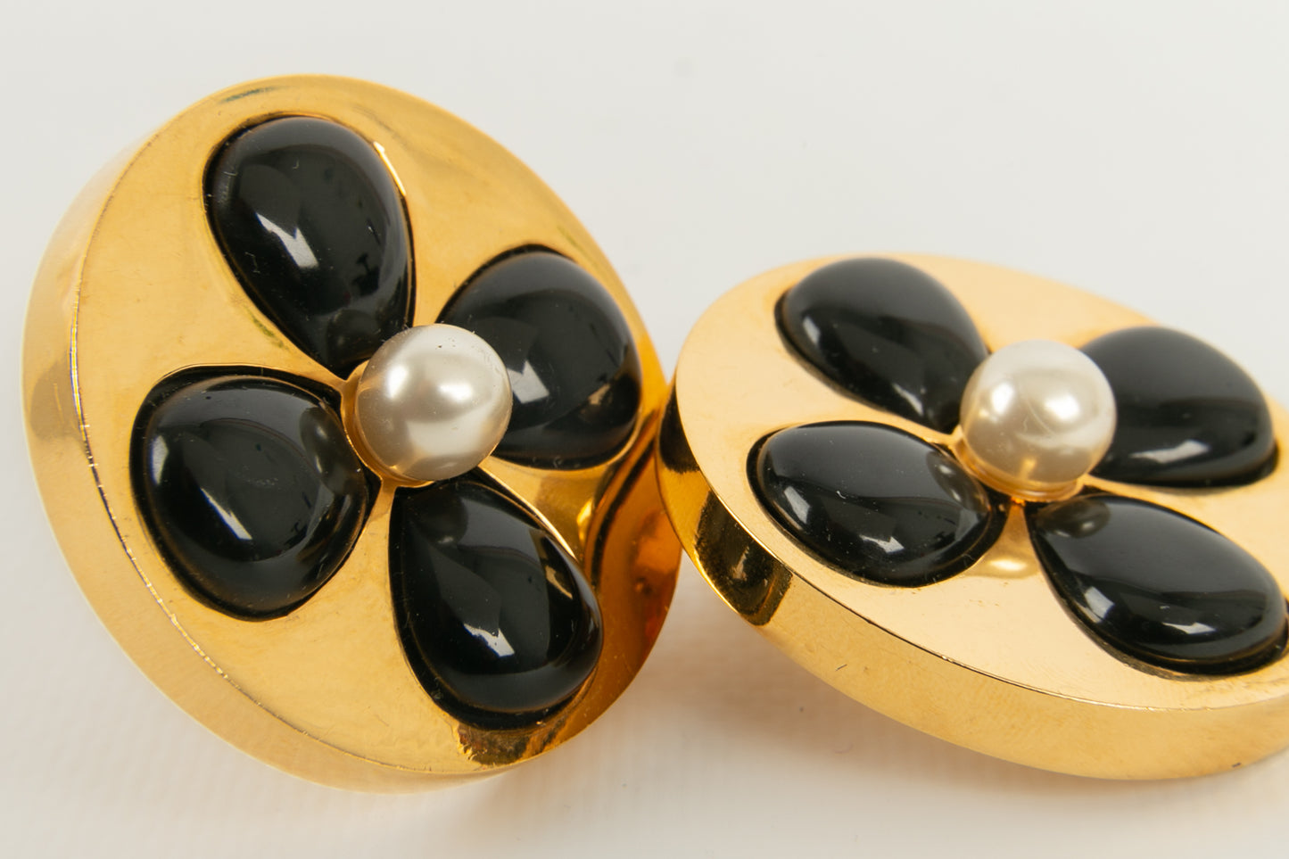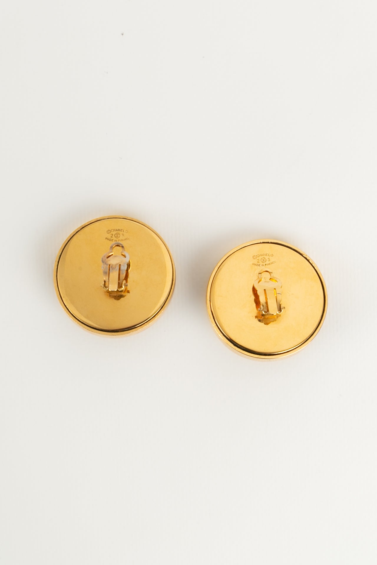 CHANEL - (Made in France) Clip-on earrings in golden metal, resin, and pearly cabochon. 2cc3 Collection.