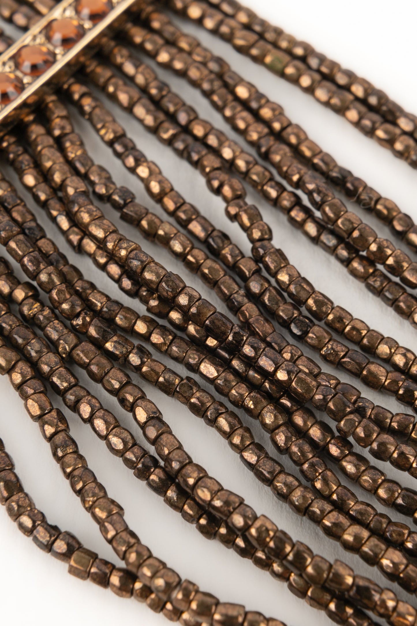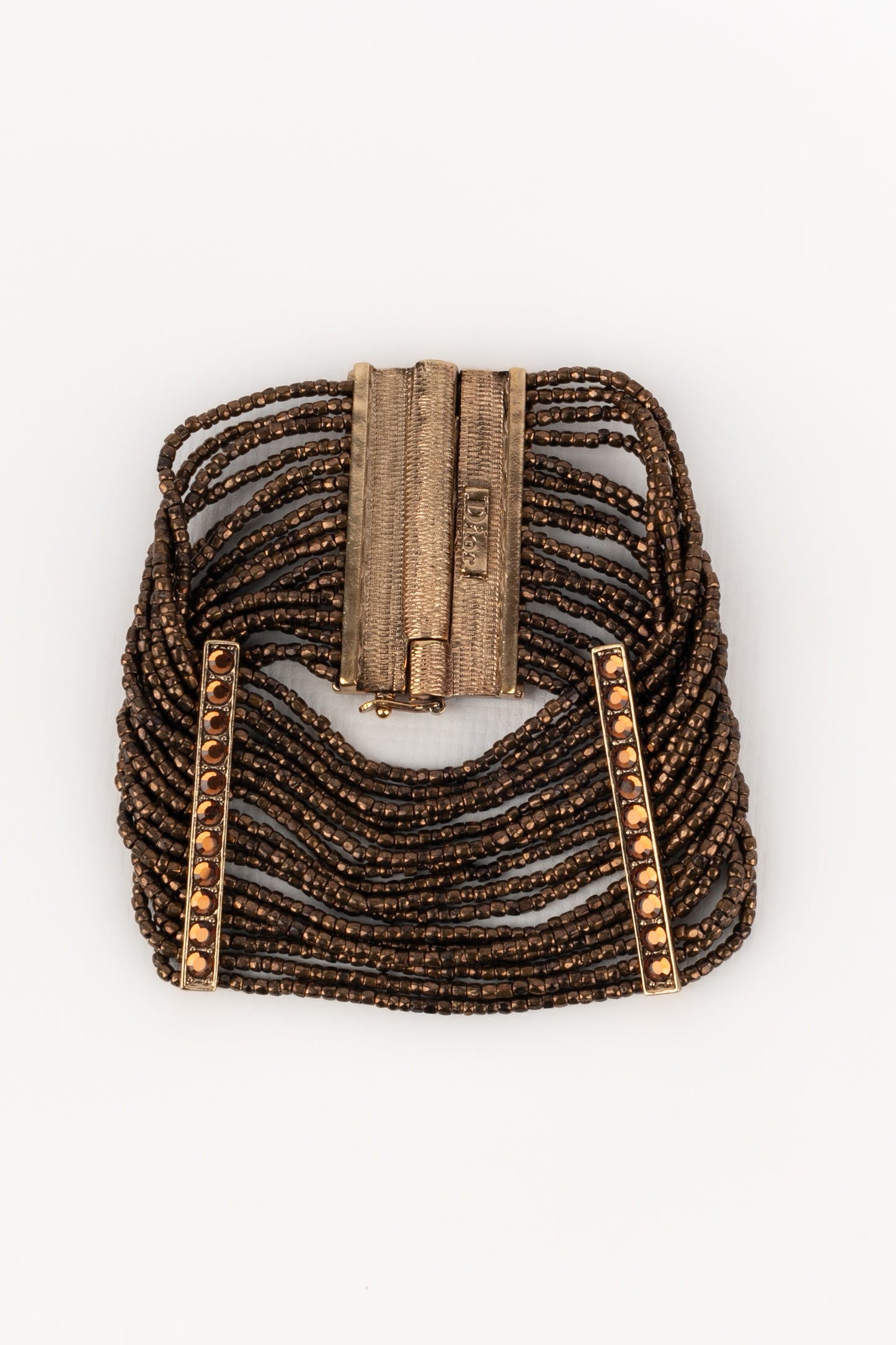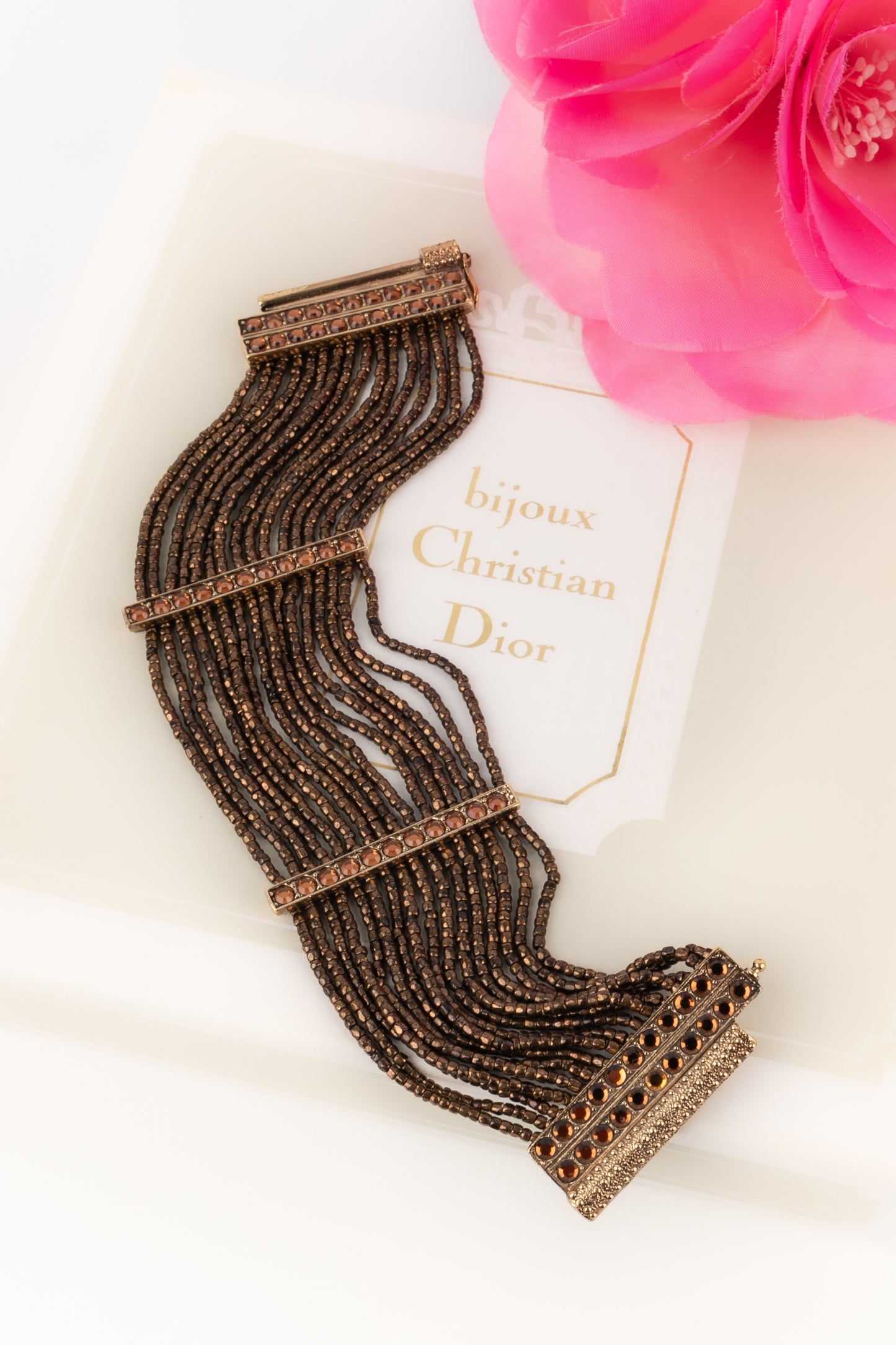 DIOR - Golden metal bracelet ornamented with orange rhinestones and rows of coppery pearls.