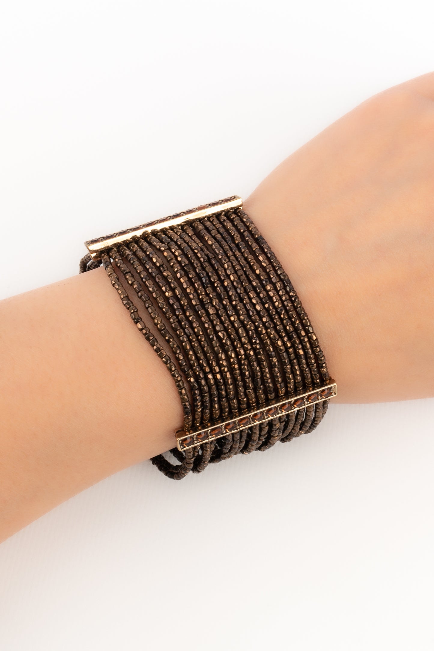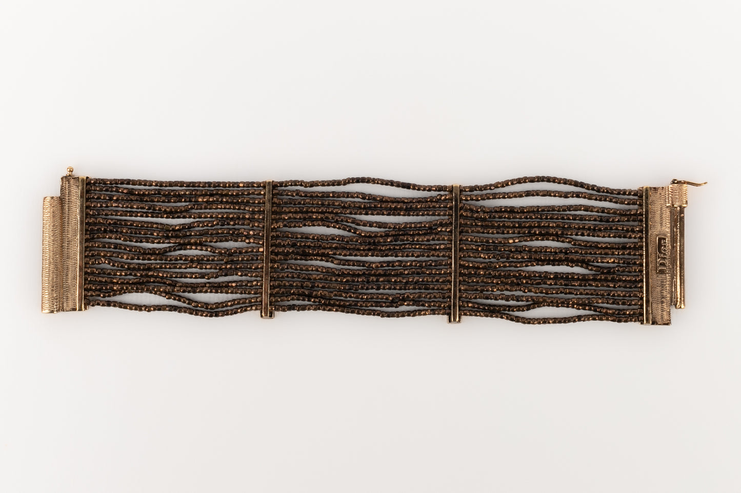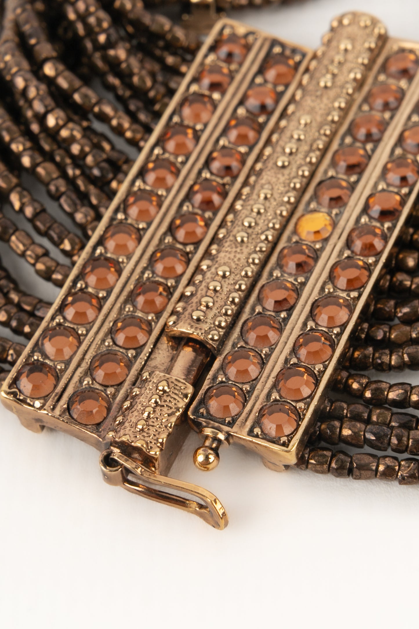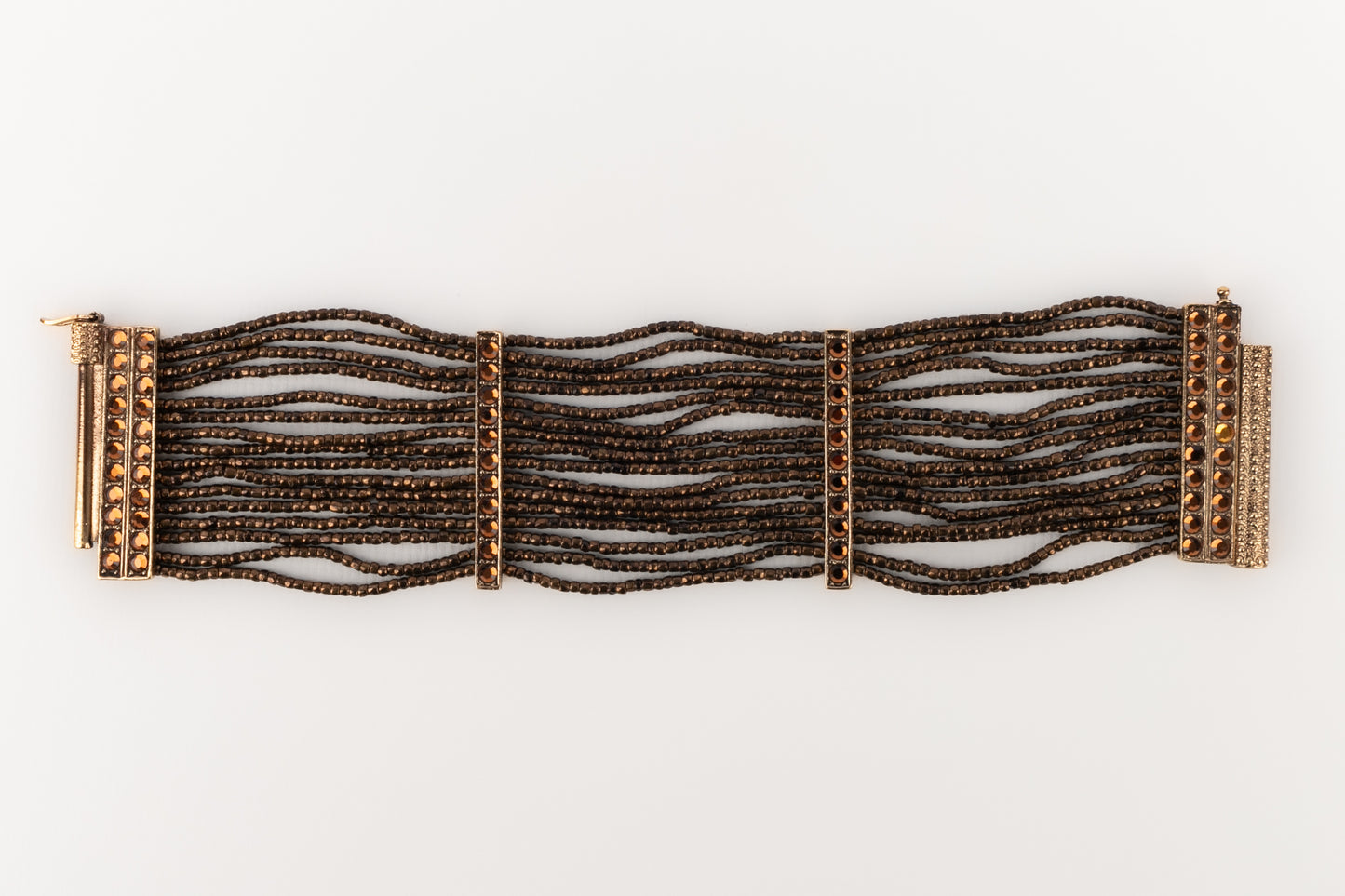 DIOR - Golden metal bracelet ornamented with orange rhinestones and rows of coppery pearls.