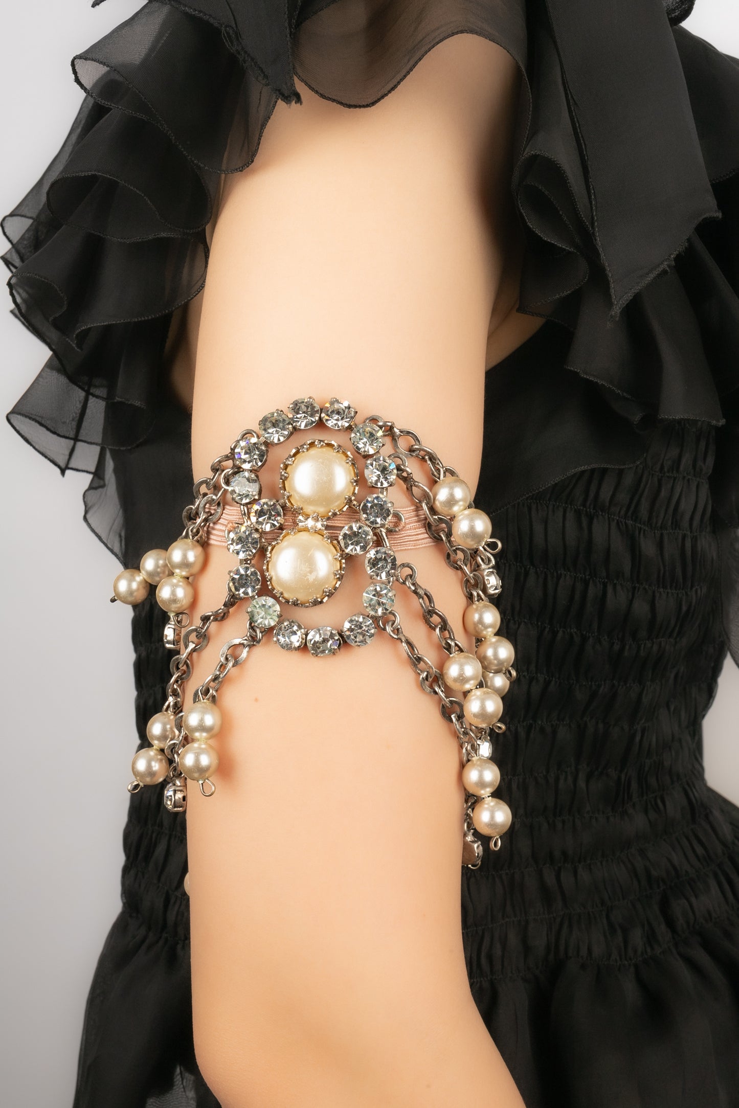 THEATER - Silvery metal arm bracelet with rhinestones, pearls and pearly cabochons. Jewelry from drama or cabaret performances from the 1920s.
