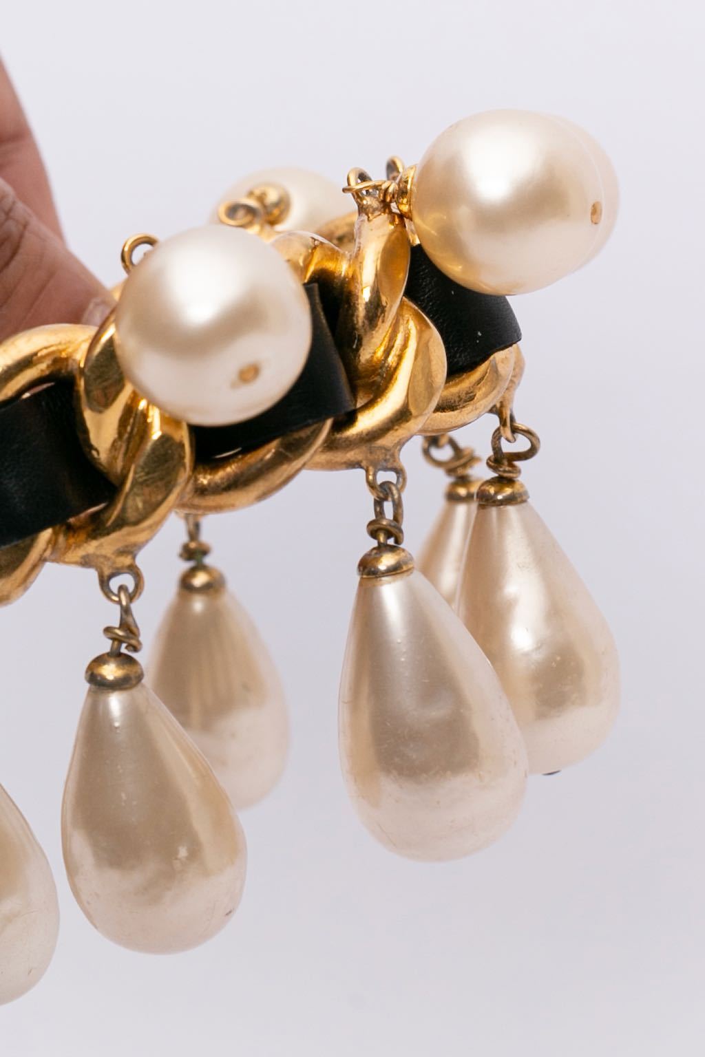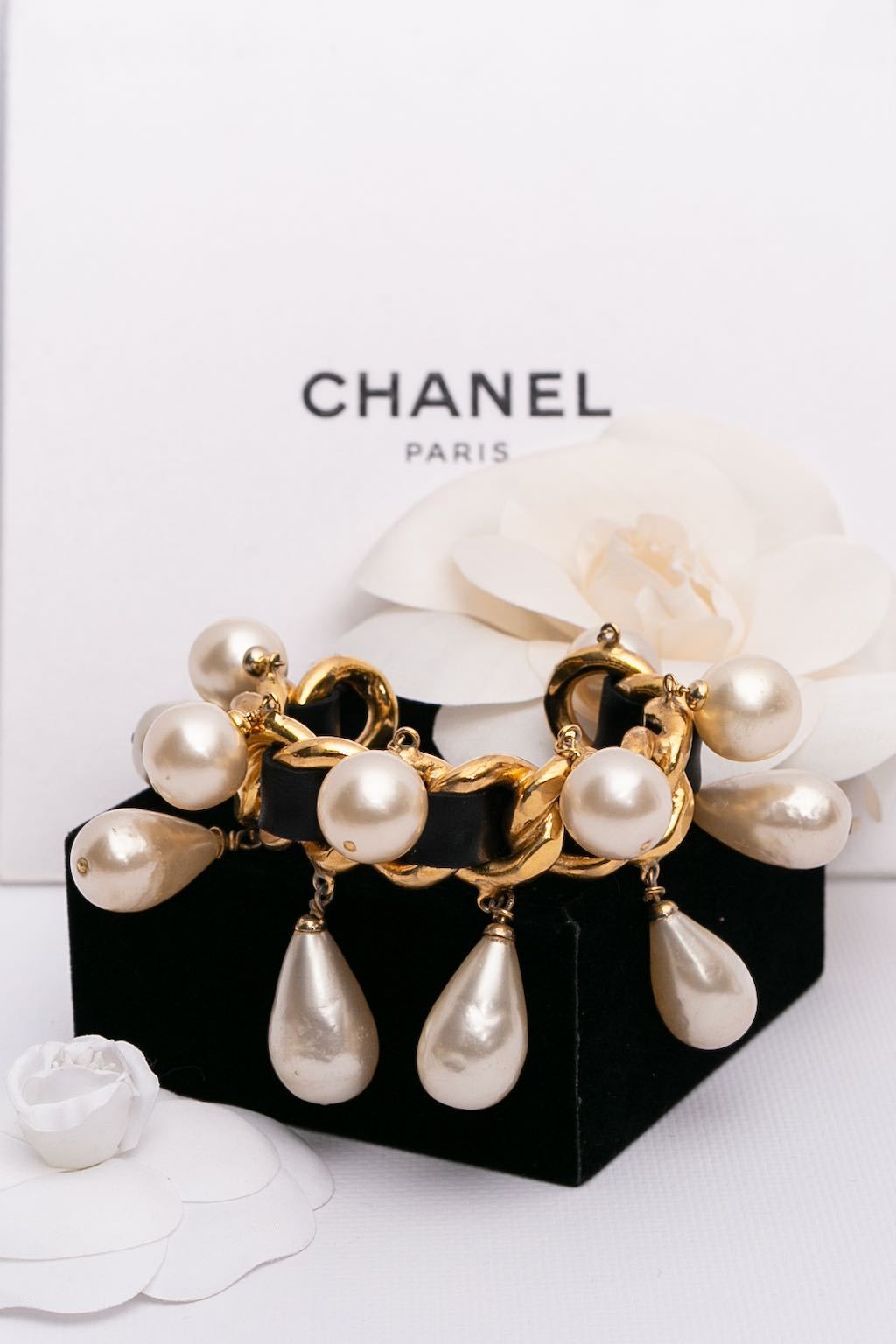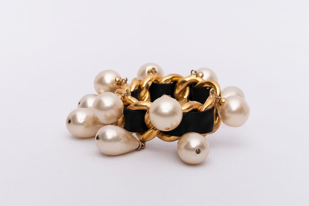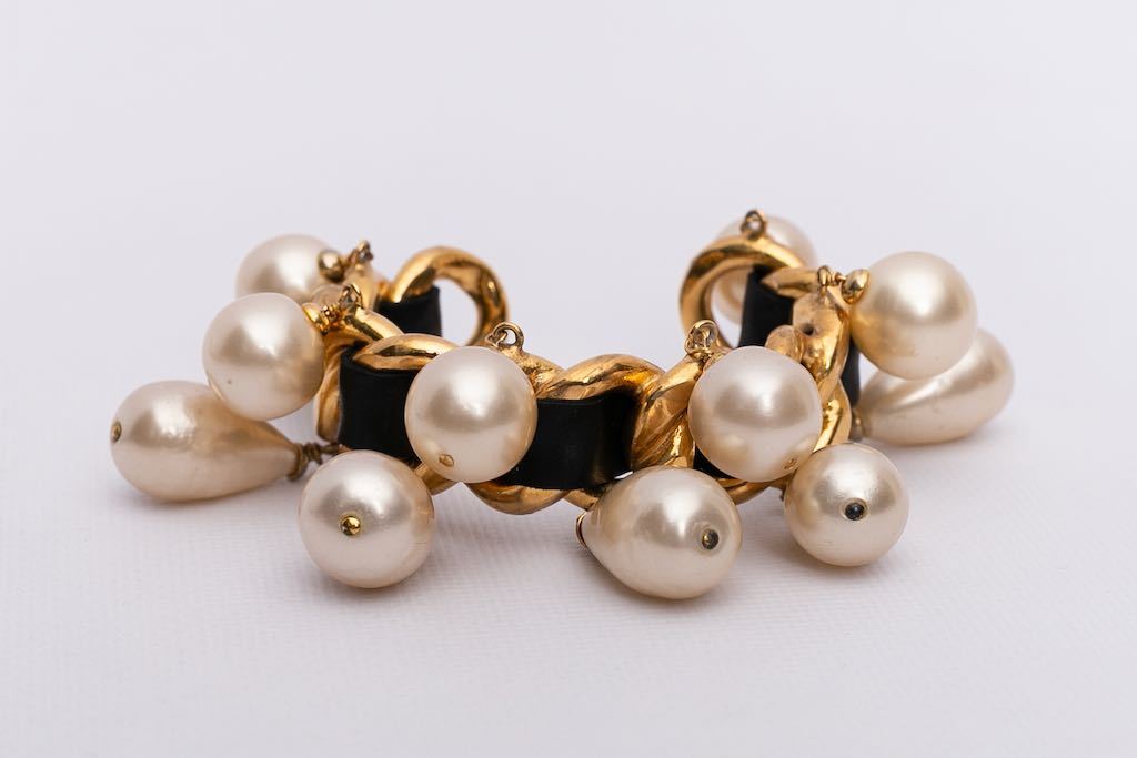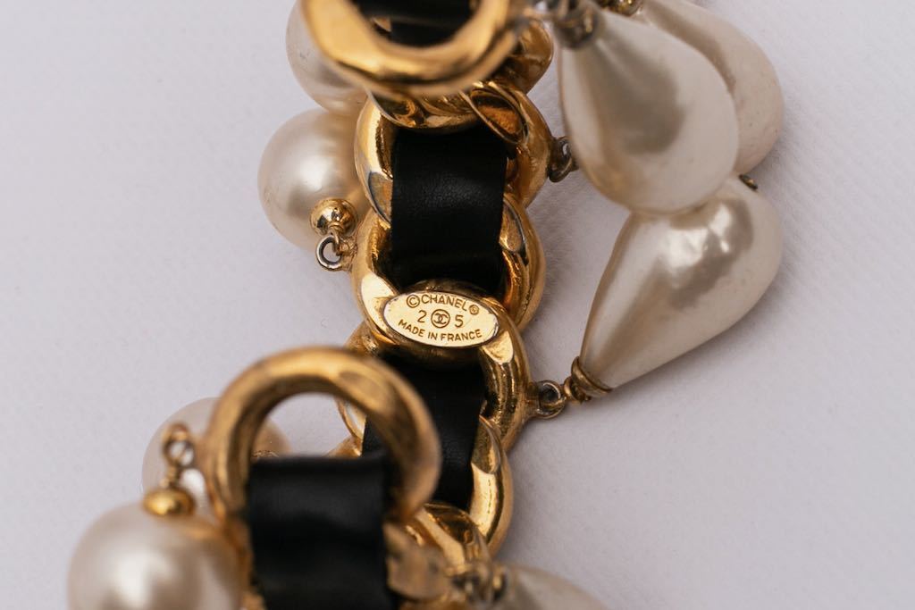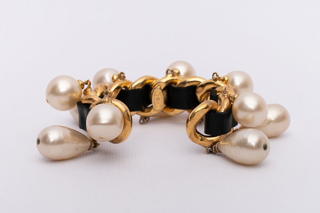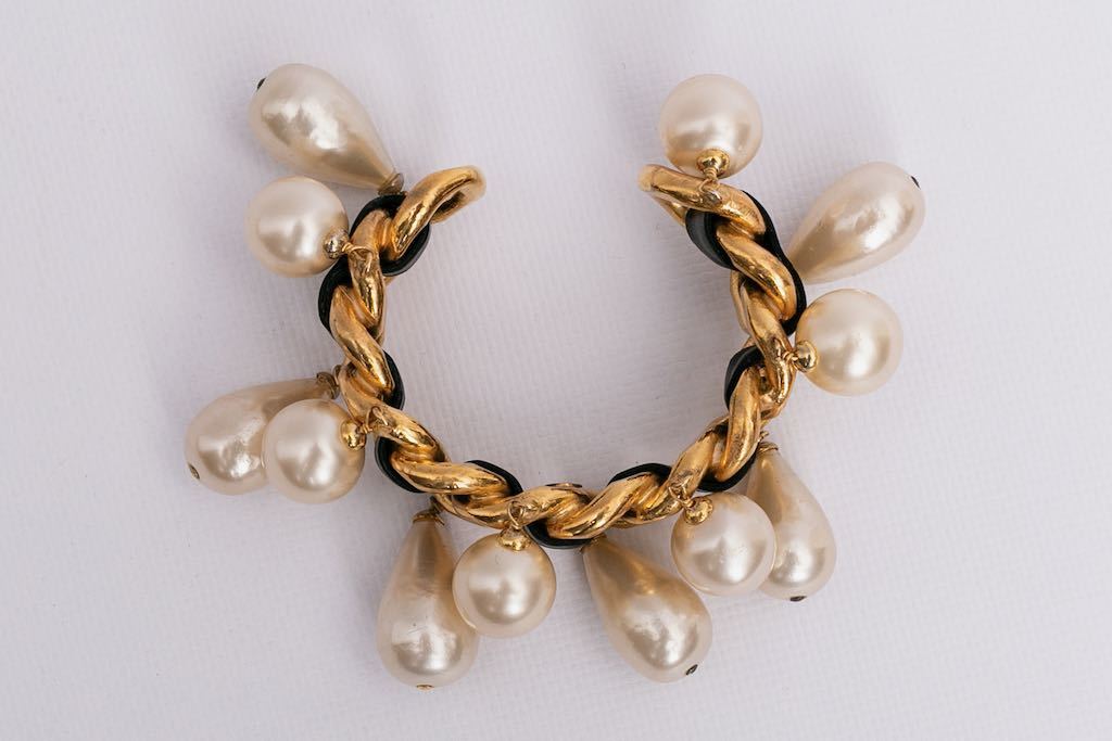 CHANEL- (Made in France) Hard golden metal bracelet entwined with black leather, end decorated with pearly drops. 2cc5 Collection.