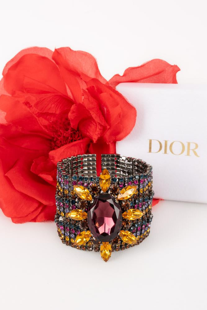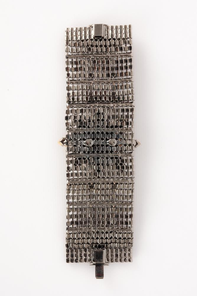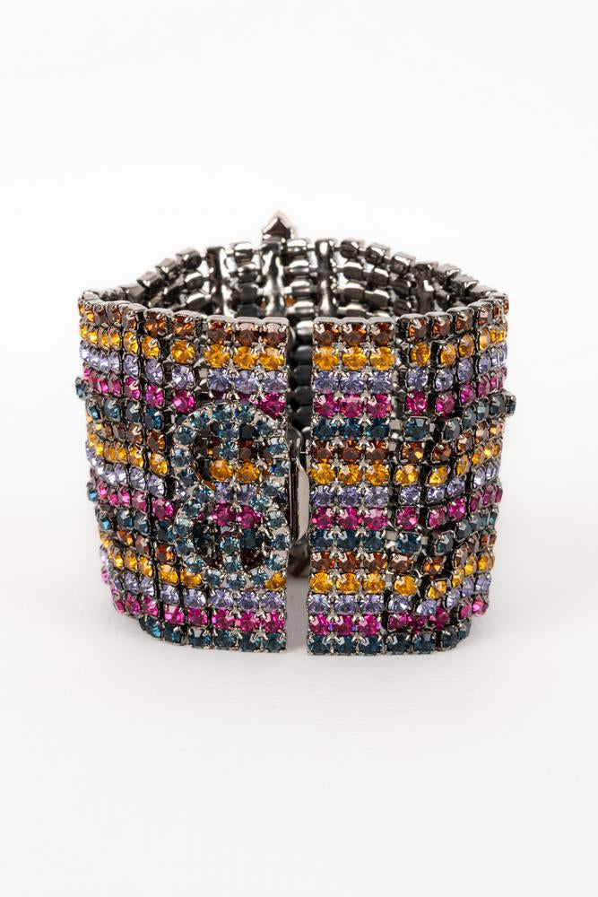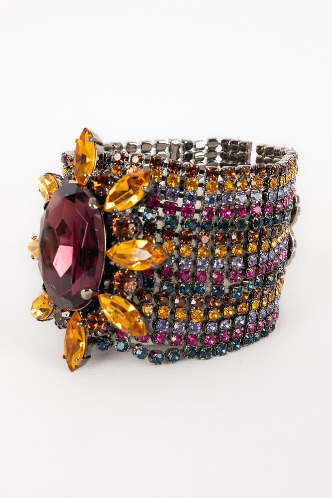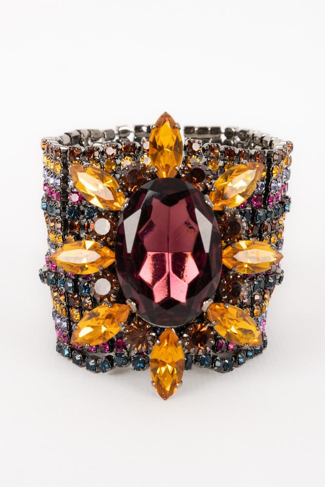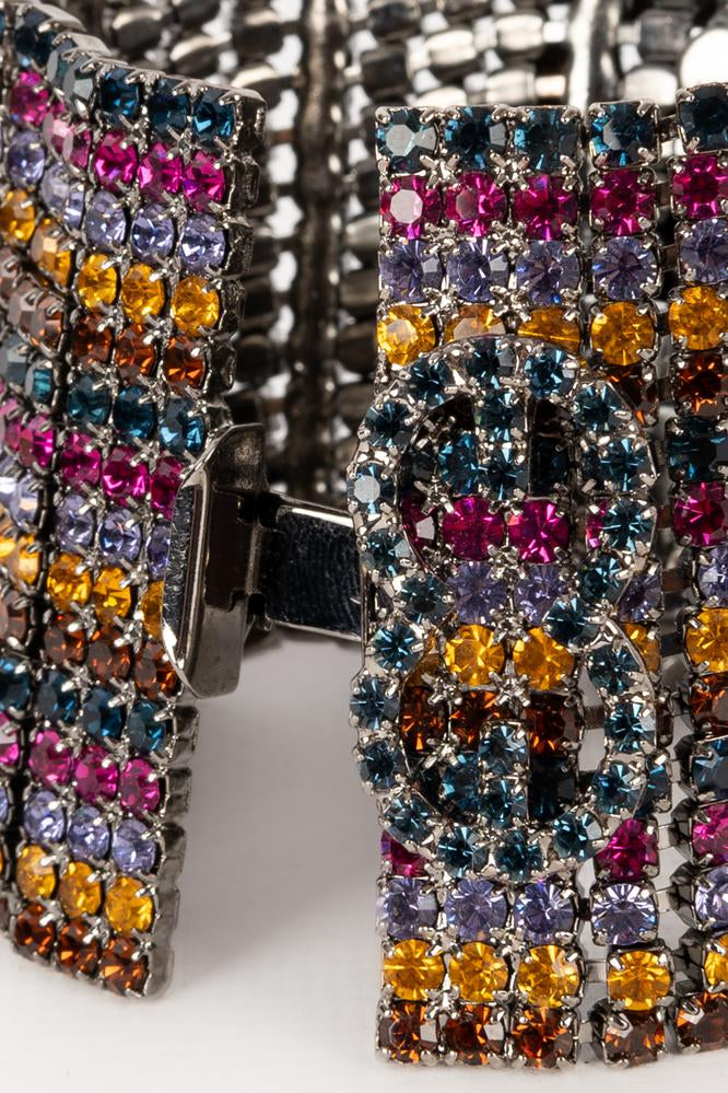 ESCADA - (Attributed to) Dark-silvery metal articulated bracelet ornamented with multicolored rhinestones. Not signed.