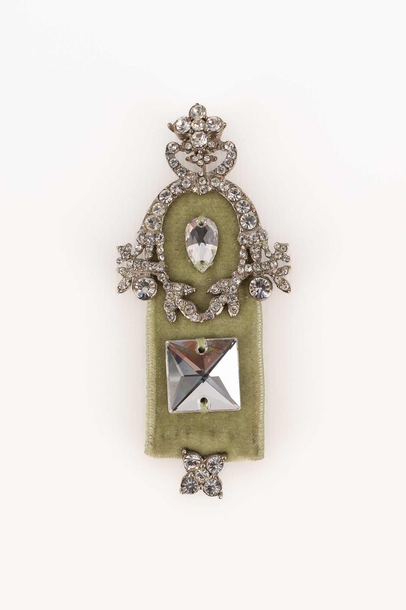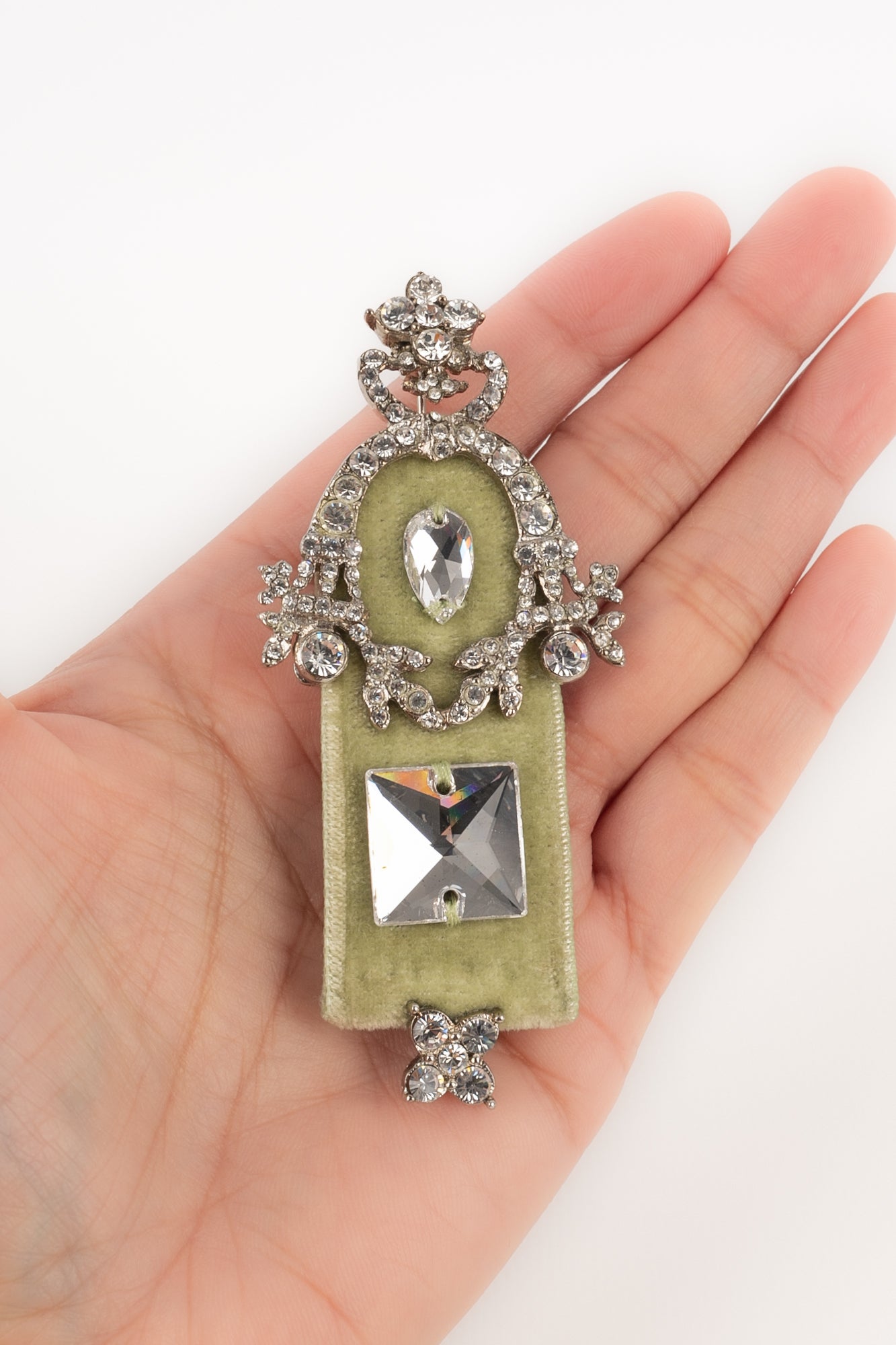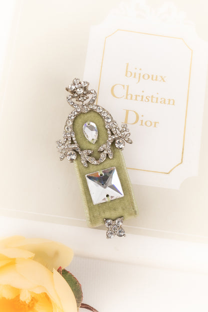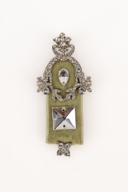 DIOR - Silvery metal brooch with rhinestones and green velvet. 2000 circa Collection, under the artistic direction of John Galliano.