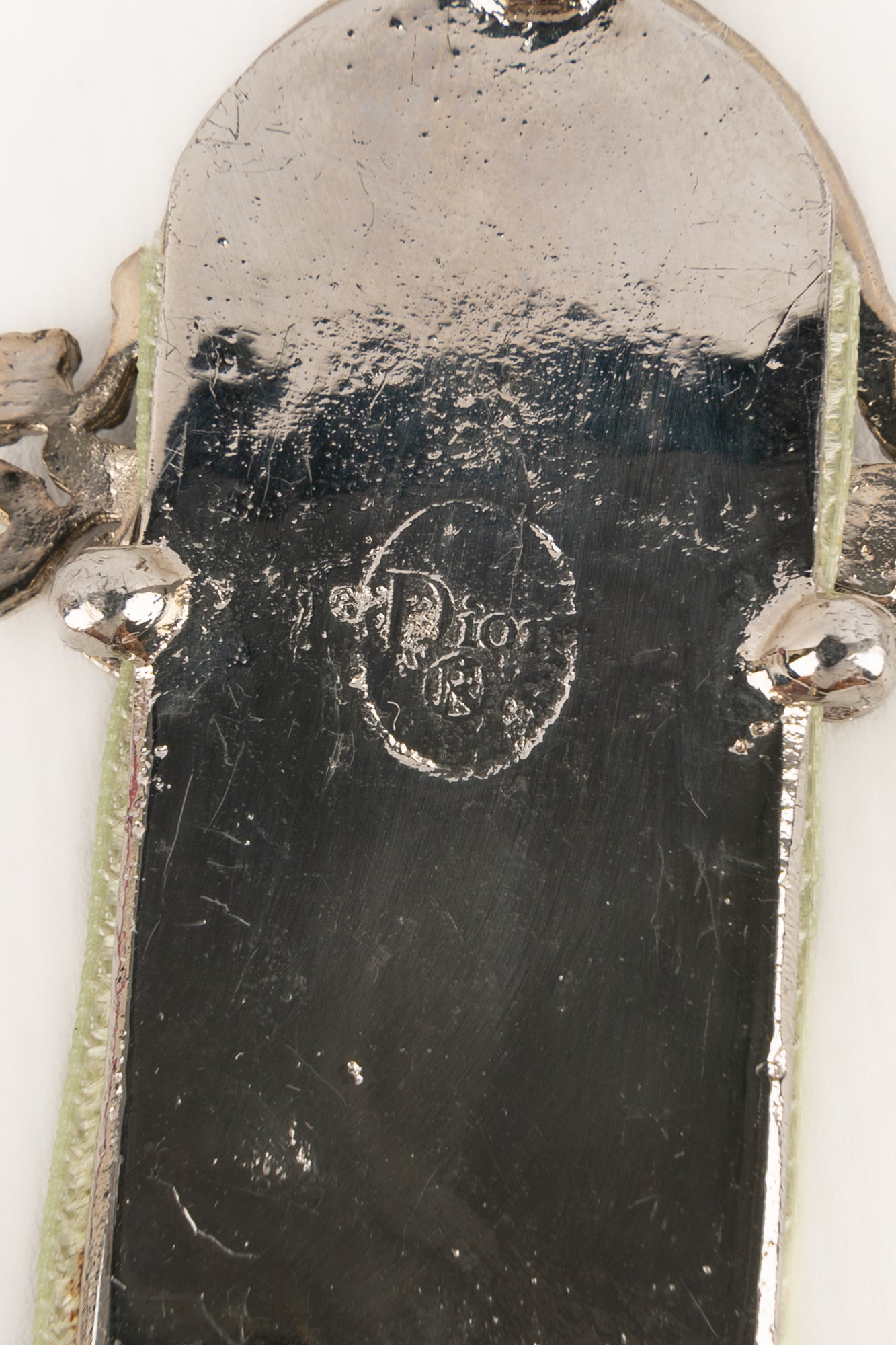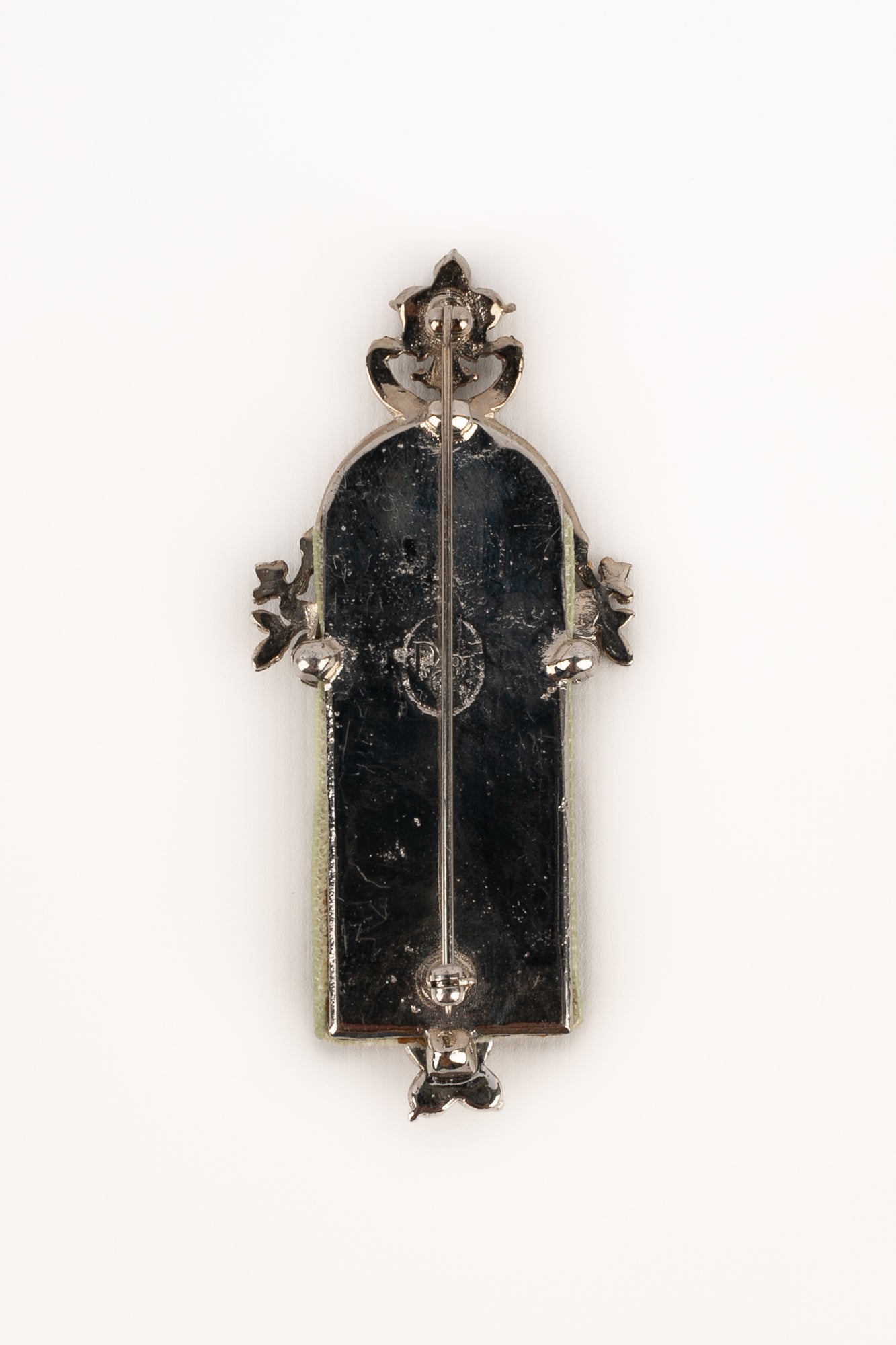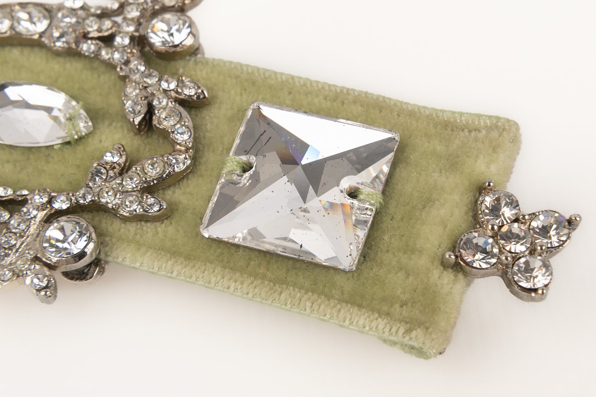 DIOR - Silvery metal brooch with rhinestones and green velvet. 2000 circa Collection, under the artistic direction of John Galliano.