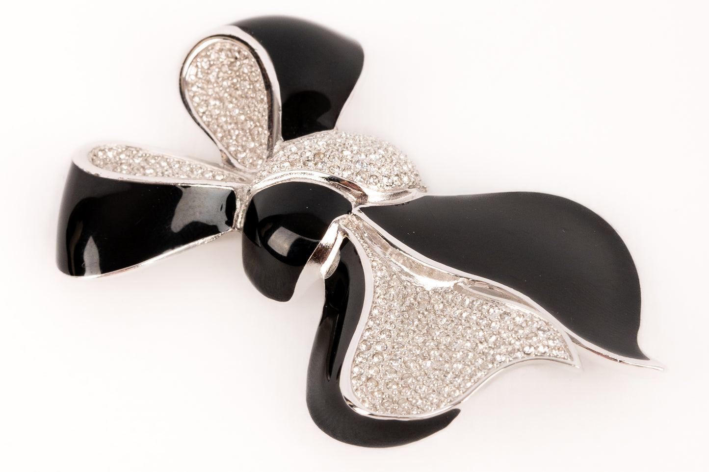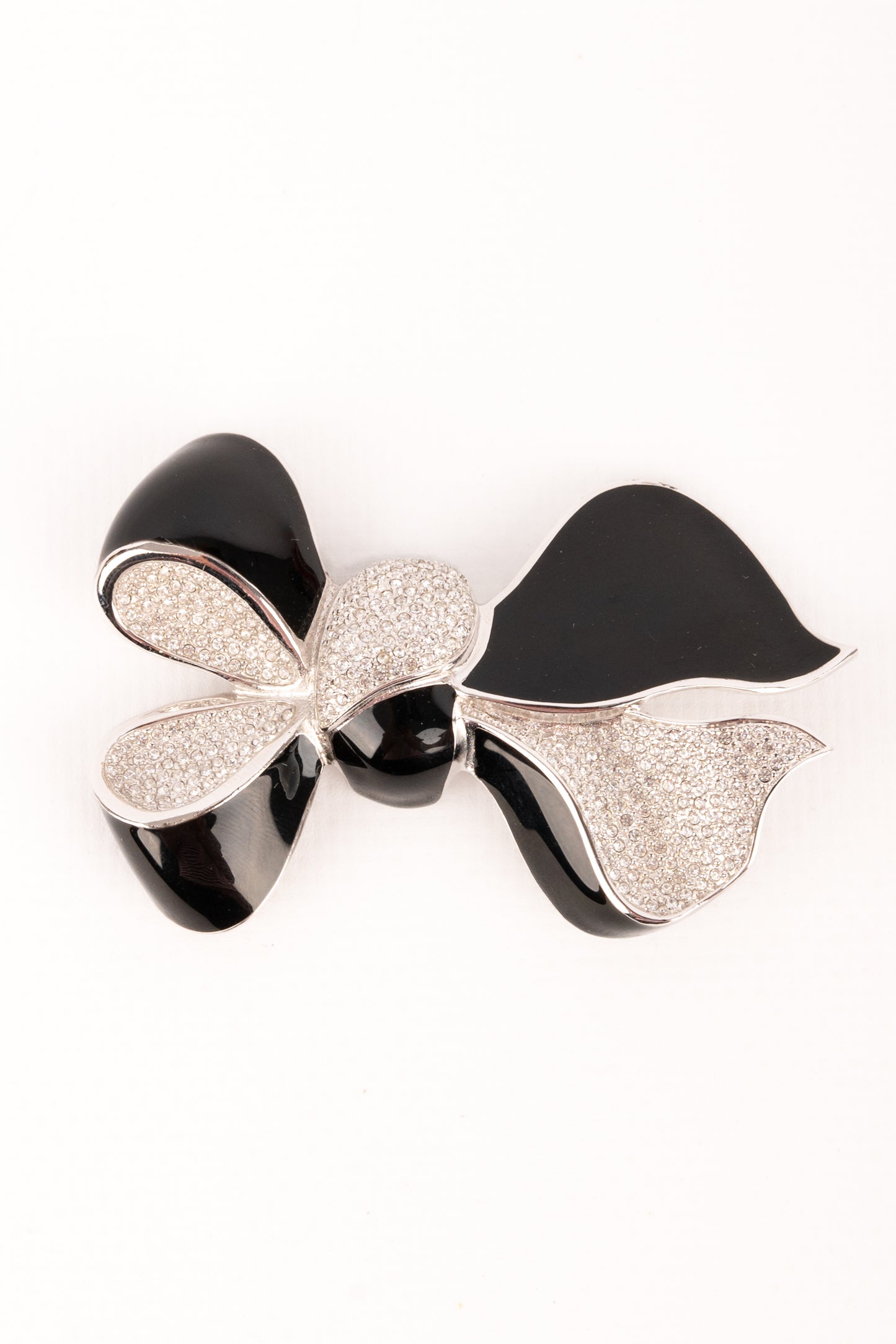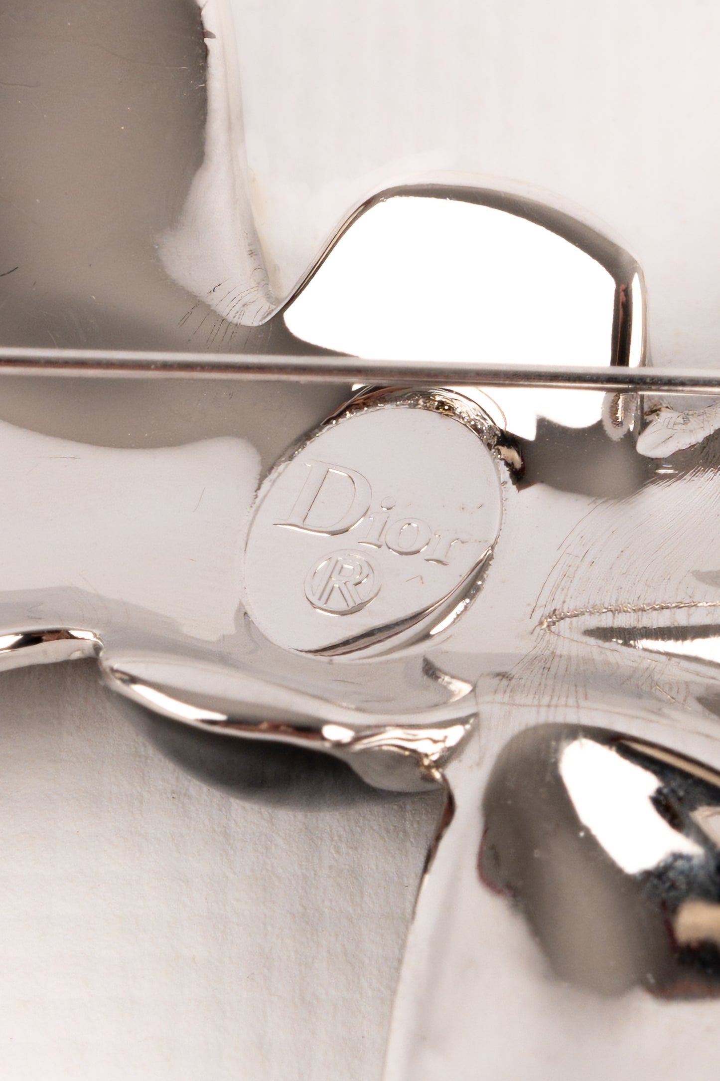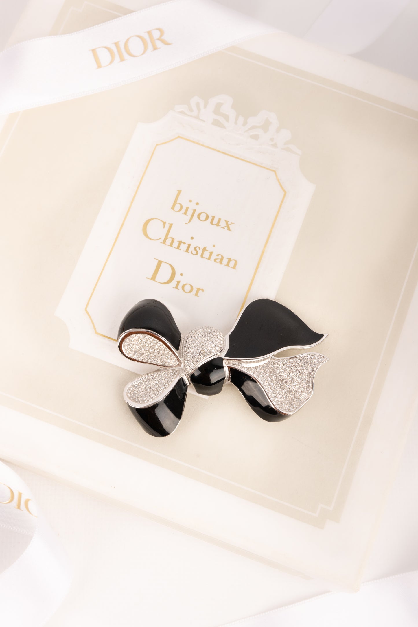 DIOR - Silvery metal brooch ornamented with black rhinestones and enamel.