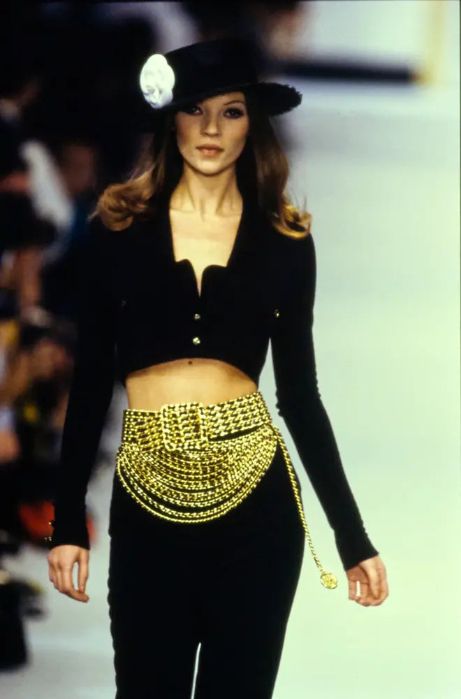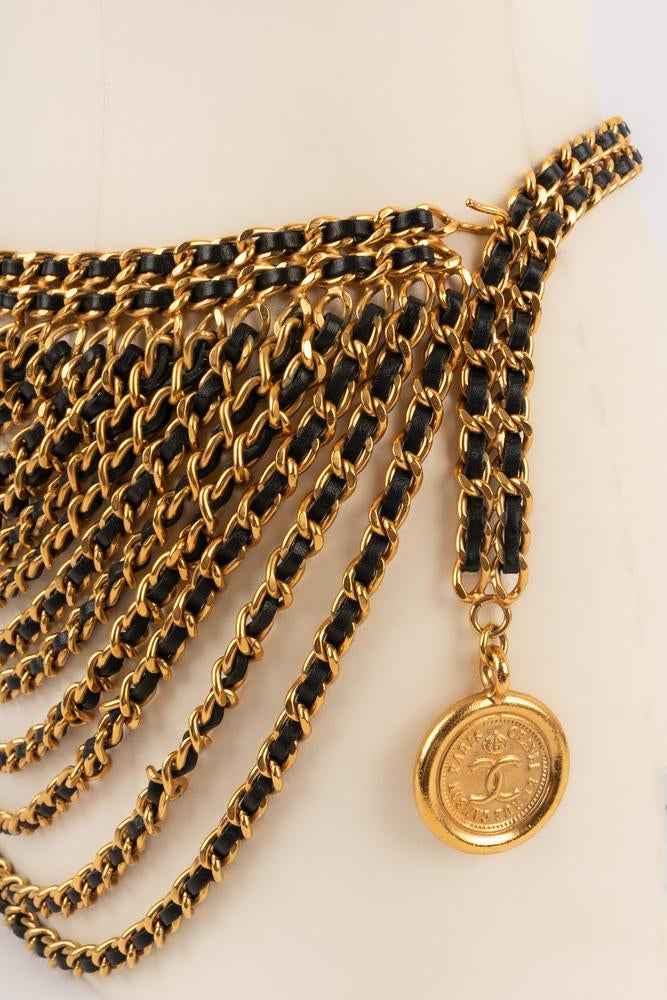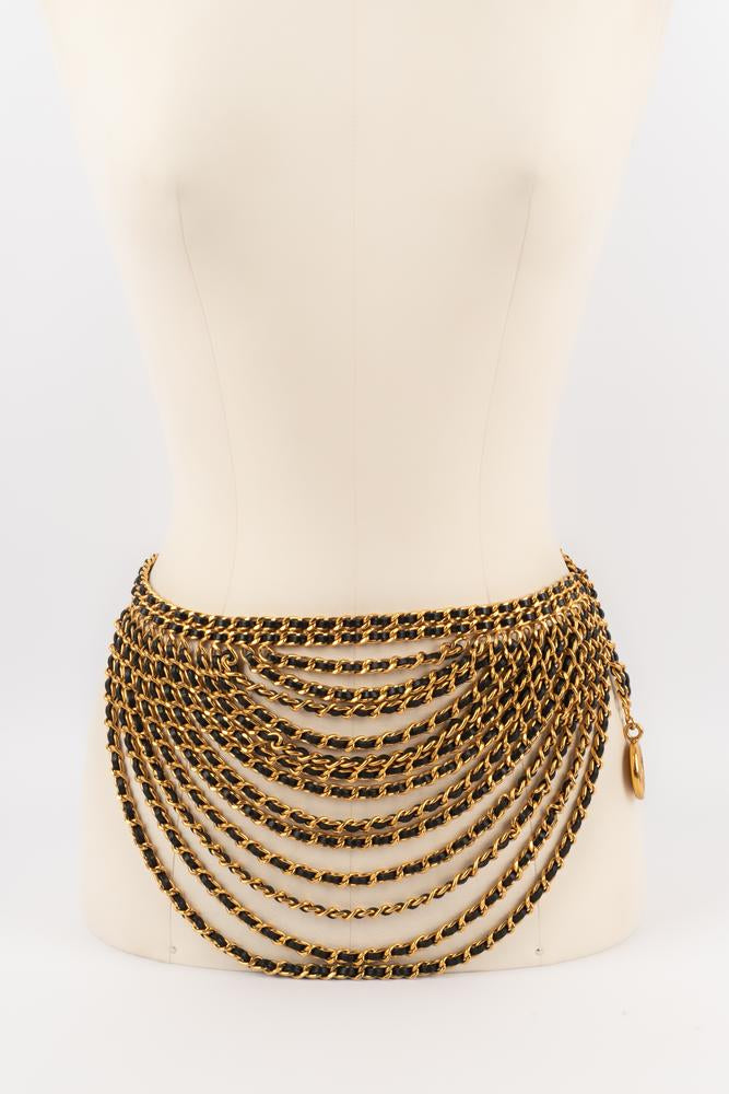 CHANEL - (Made in France) Golden metal chain belt interlaced with black leather. 1993 Spring-Summer Collection.