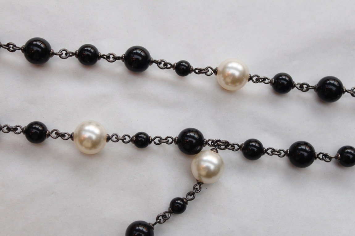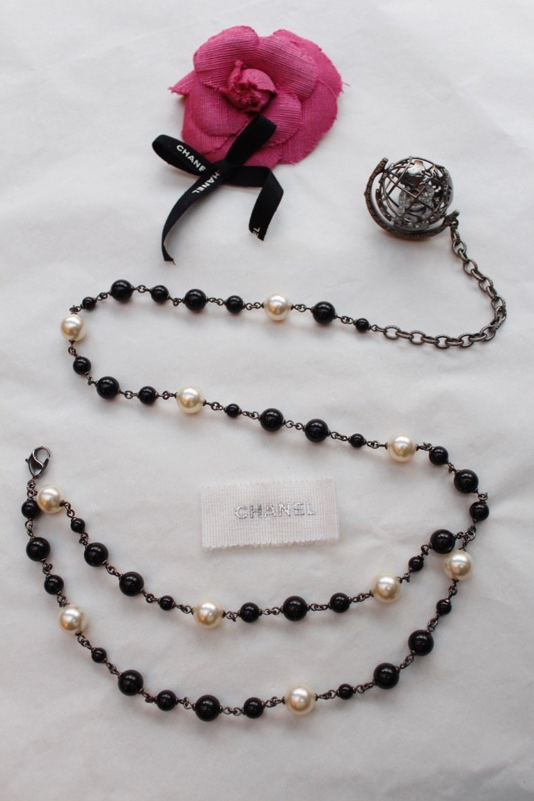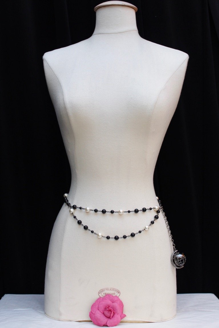 CHANEL (Made in France) Belt composed of Pearly beads and black glass beads, finishing with a world globe. 2013 Collection.