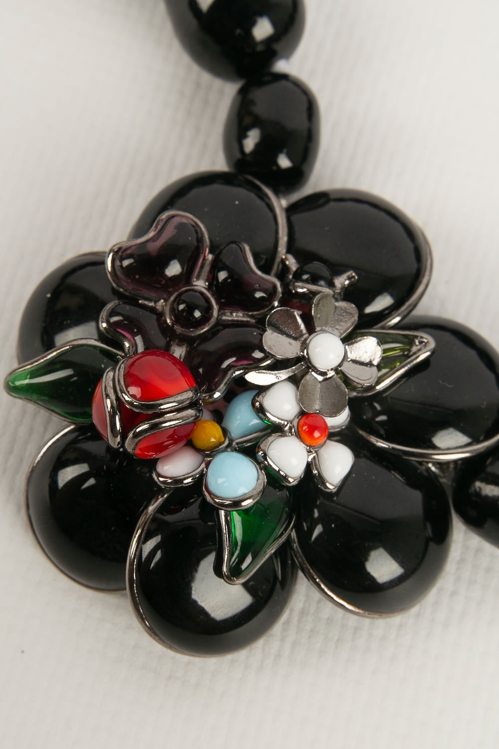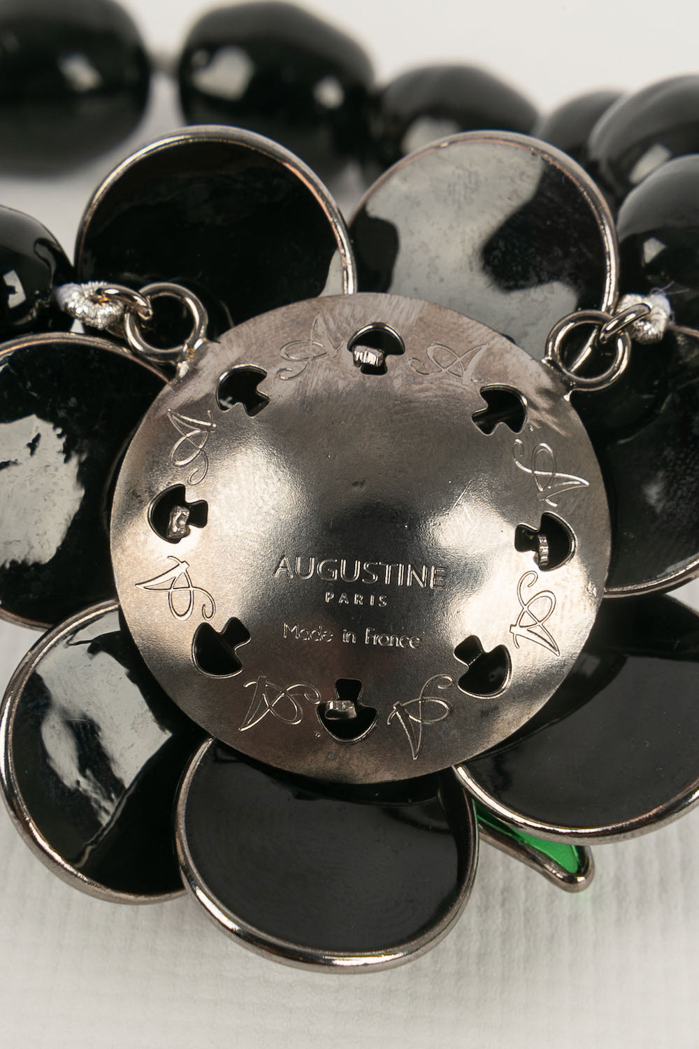 Developed by Gripoix in the 19th century, the glass paste technique uses coloured glass pieces, finely shaped, bringing a touch of art and sophistication to the creations of Augustine.