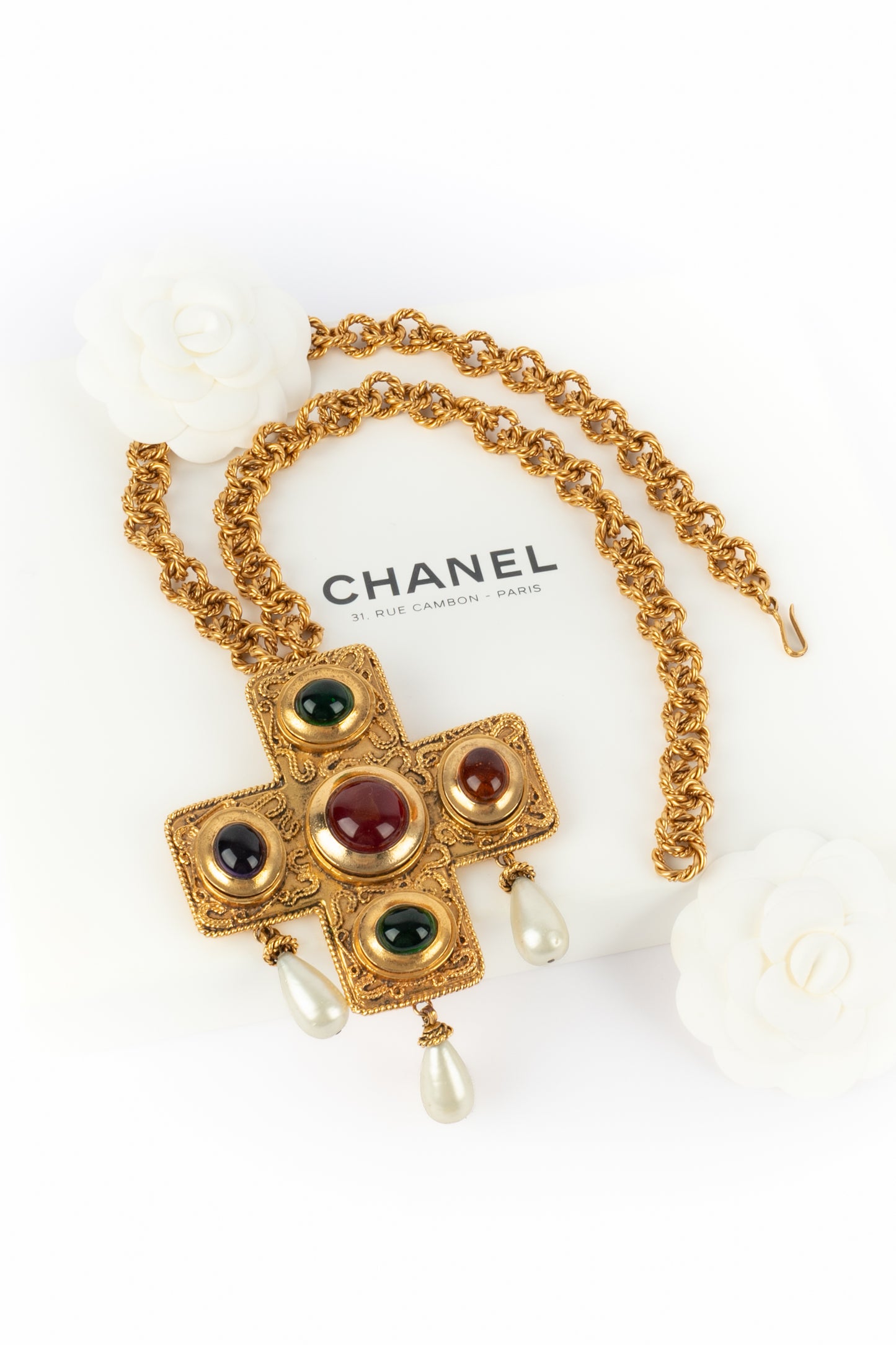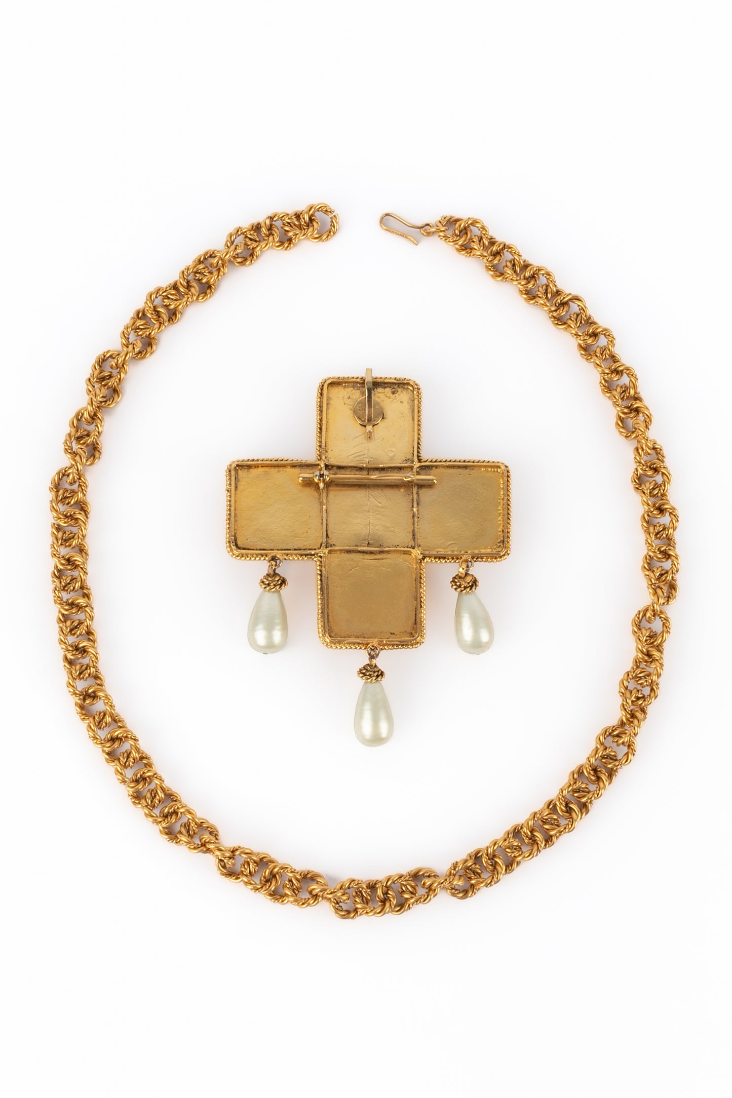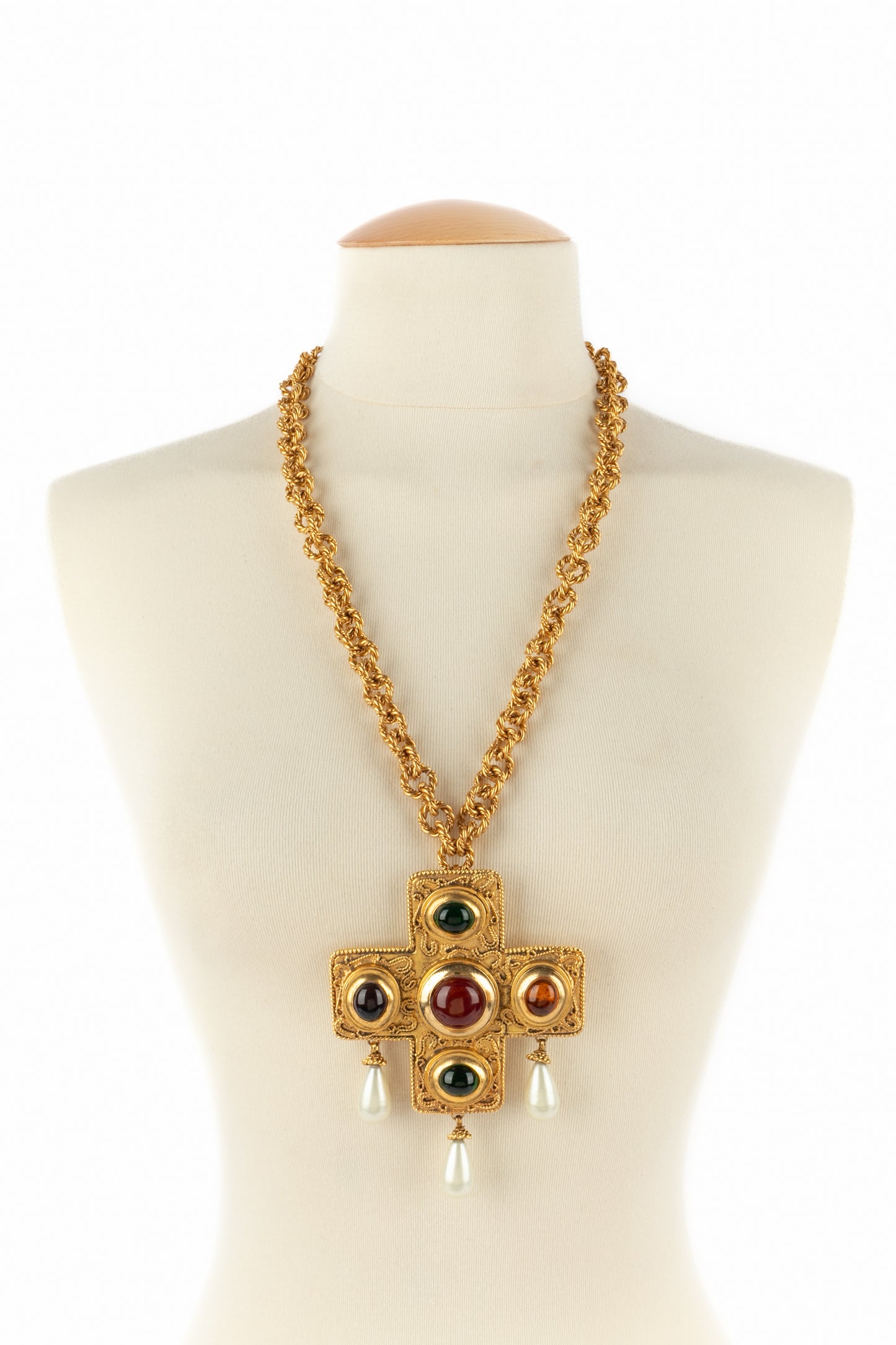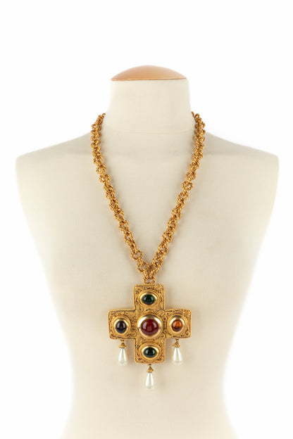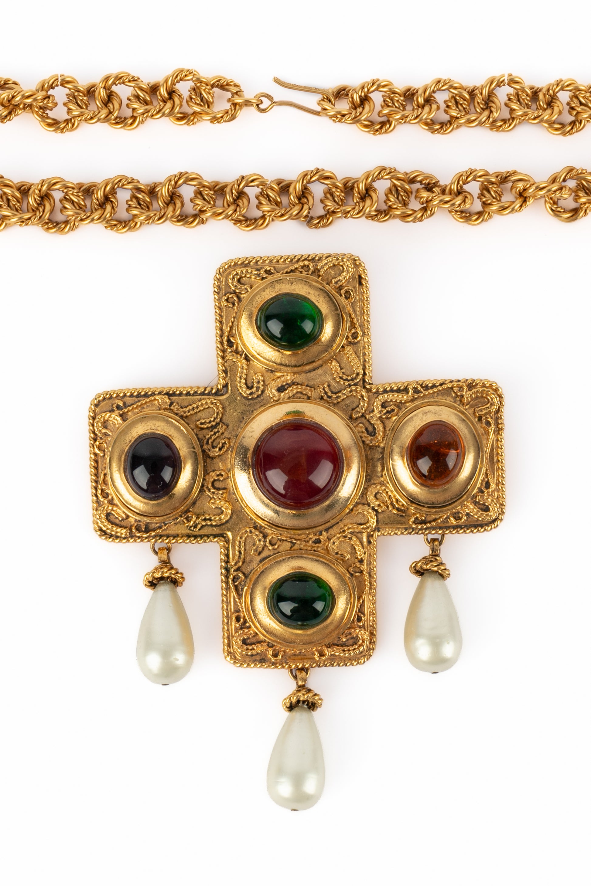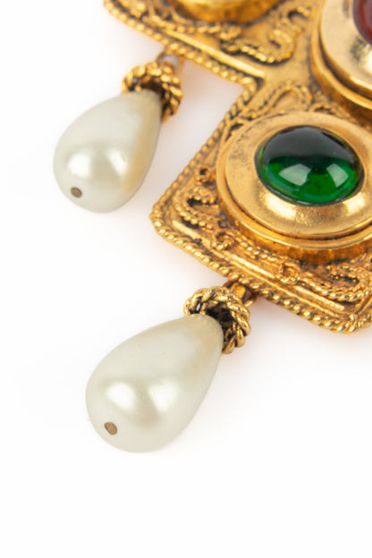 CHANEL - (Made in France) Golden metal pendant necklace with glass paste and costume pearly drops. 1990/1991 Fall-Winter Collection under the artistic direction of Karl Lagerfeld.