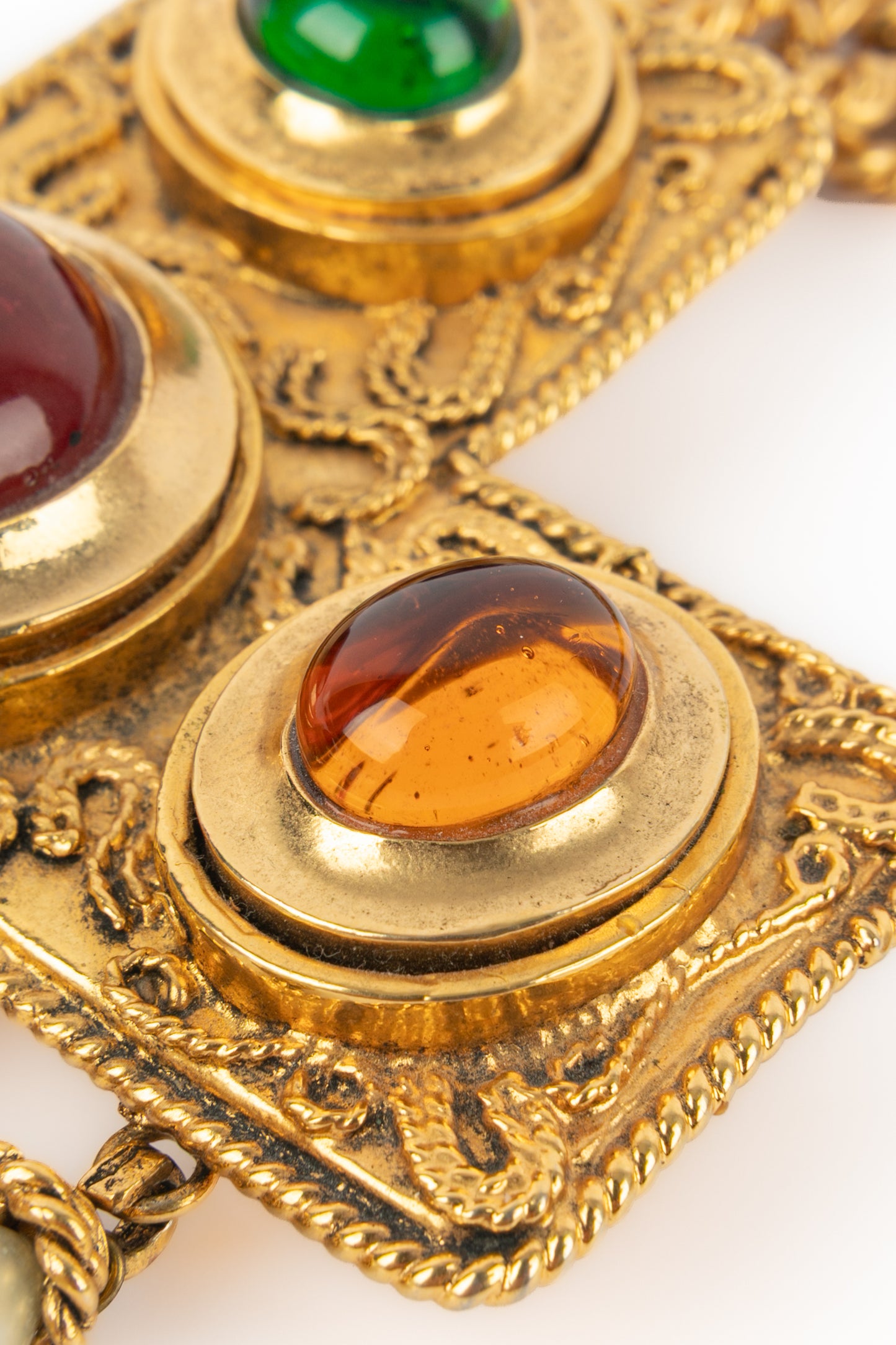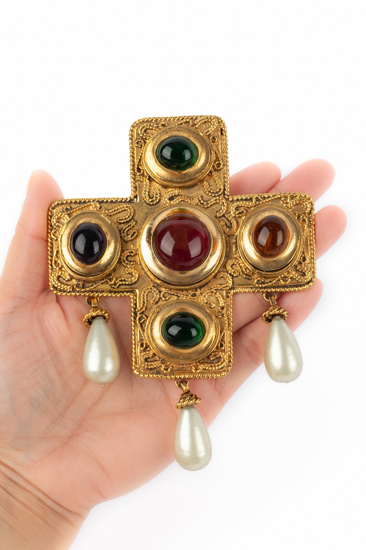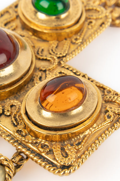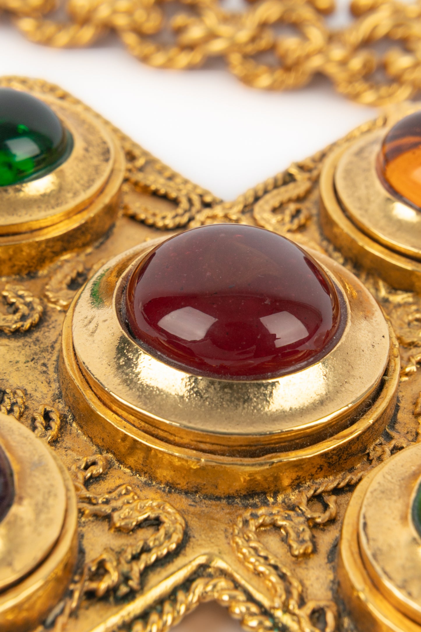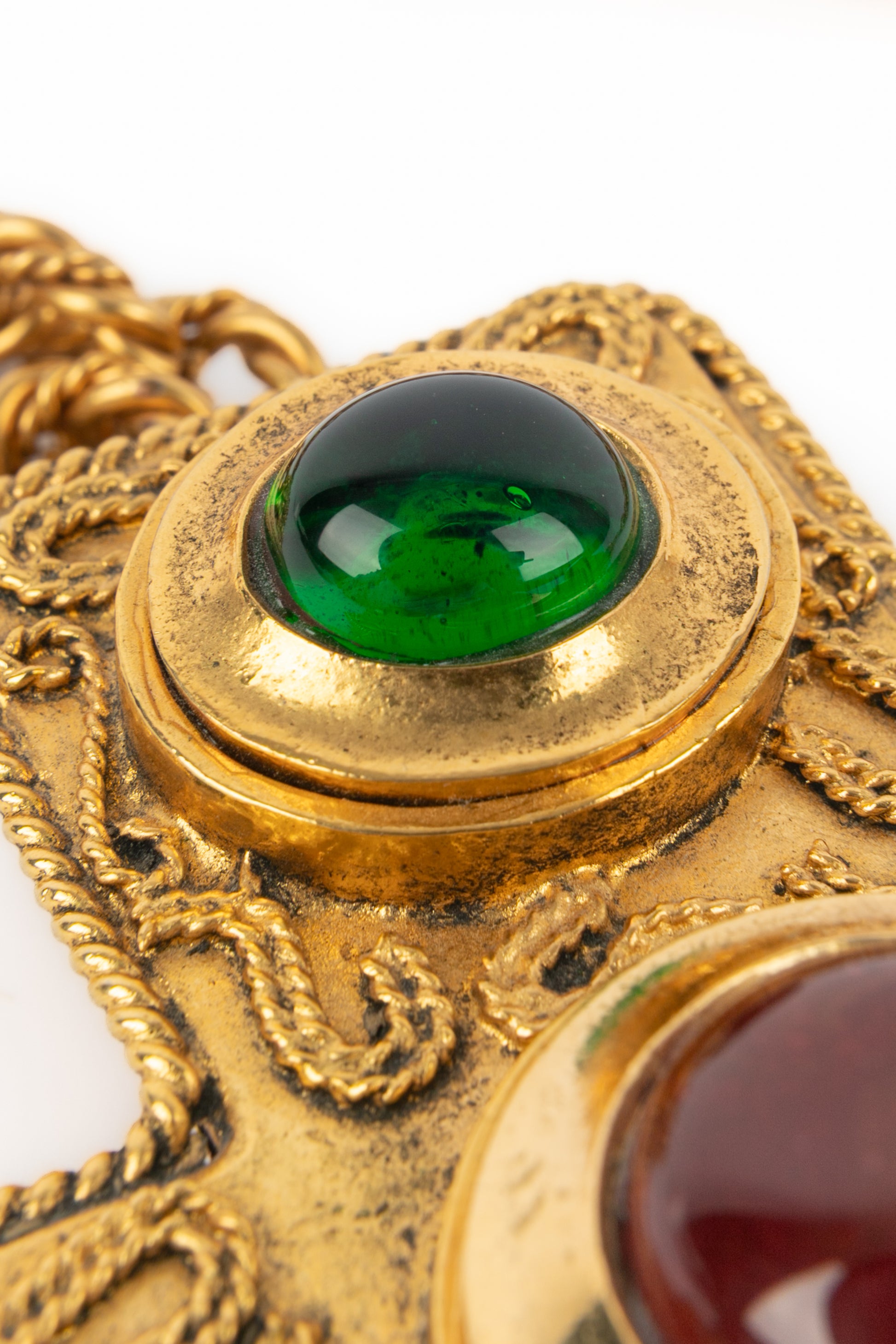CHANEL - (Made in France) Golden metal pendant necklace with glass paste and costume pearly drops. 1990/1991 Fall-Winter Collection under the artistic direction of Karl Lagerfeld.