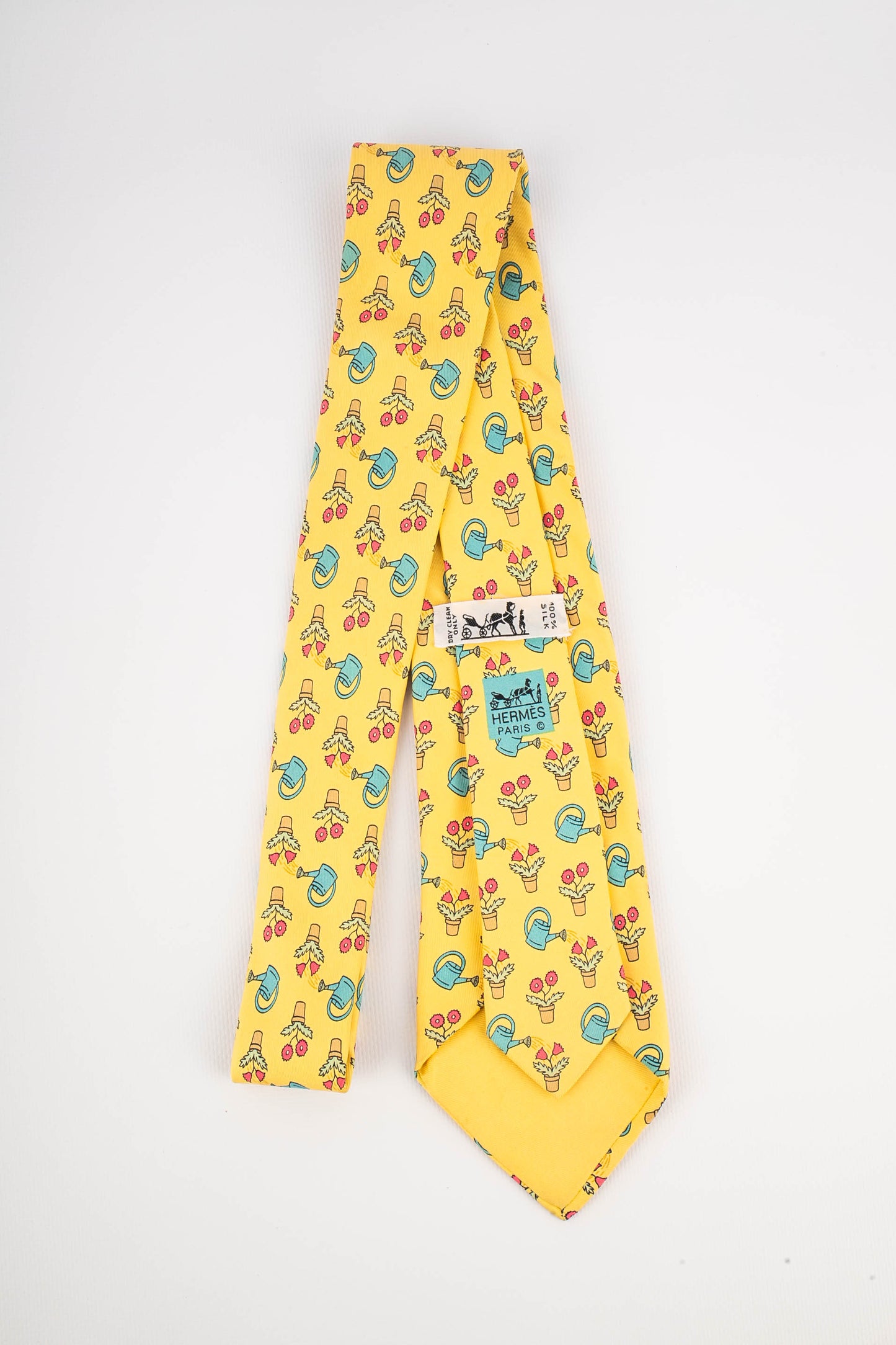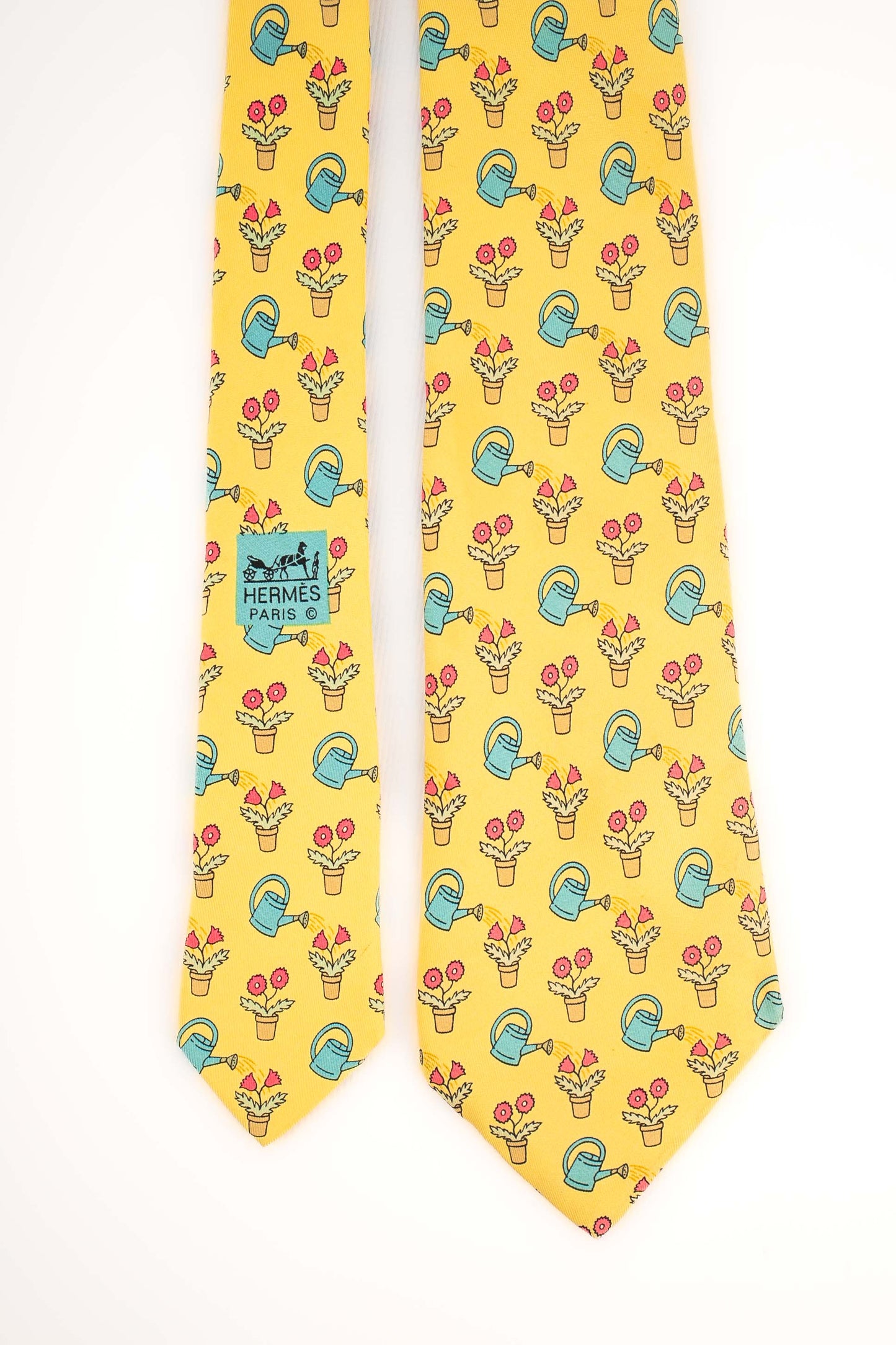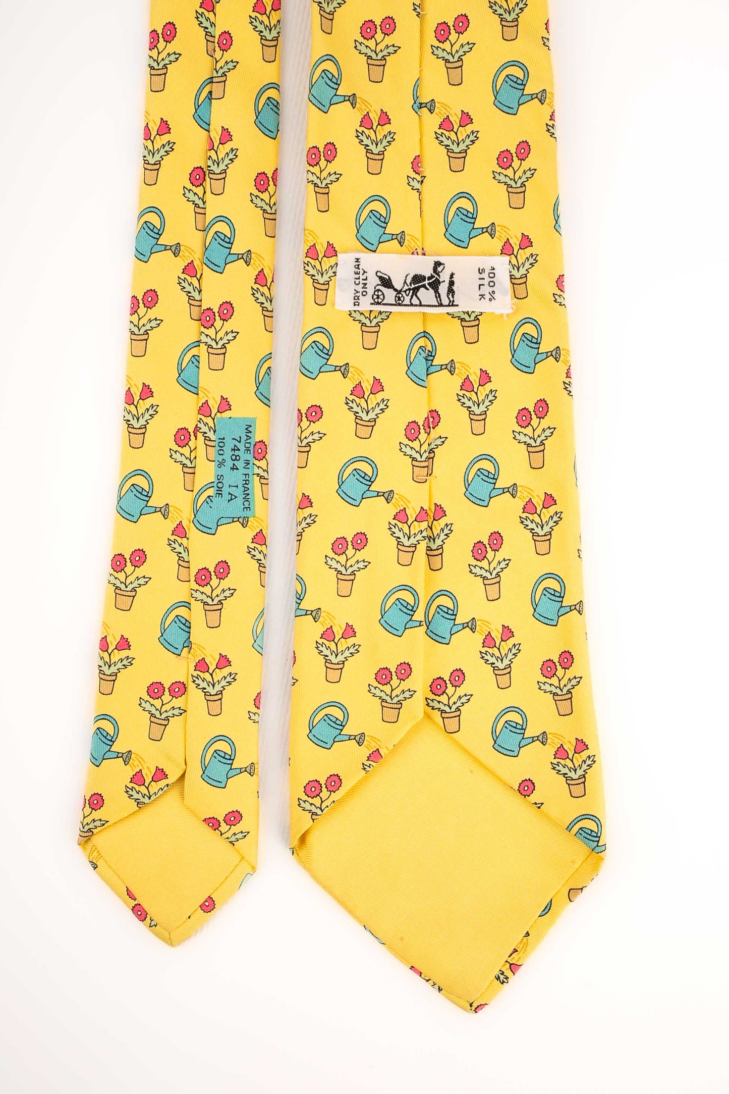 HERMÈS - (Made in France) Yellow silk tie illustrated with flowers and watering cans.
