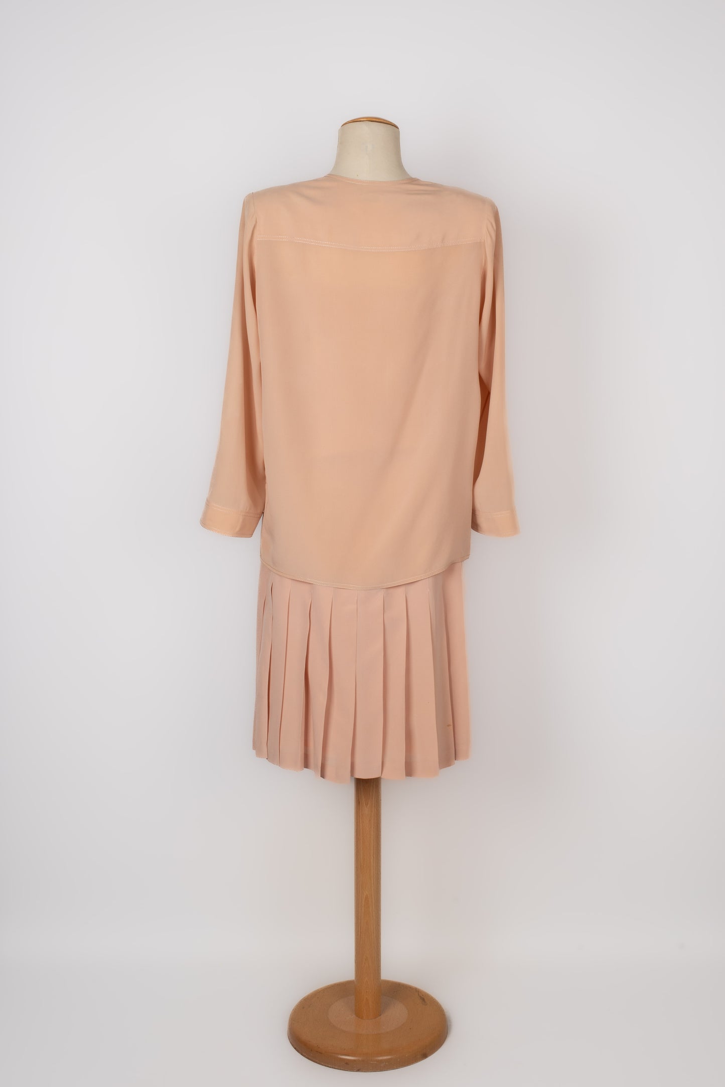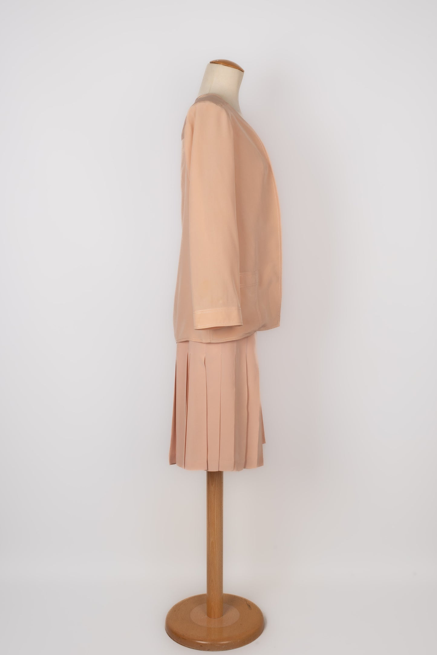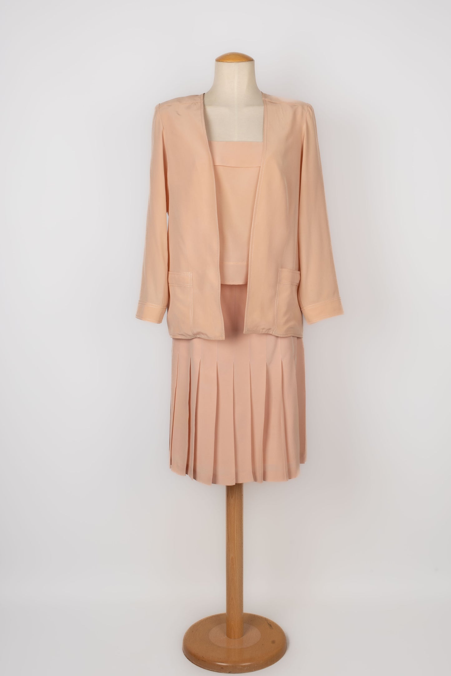CHANEL - (Made in France) Powder pink silk set composed of a skirt, a sleeveless top and a jacket. No size indicated, it fits a 34FR/36FR.