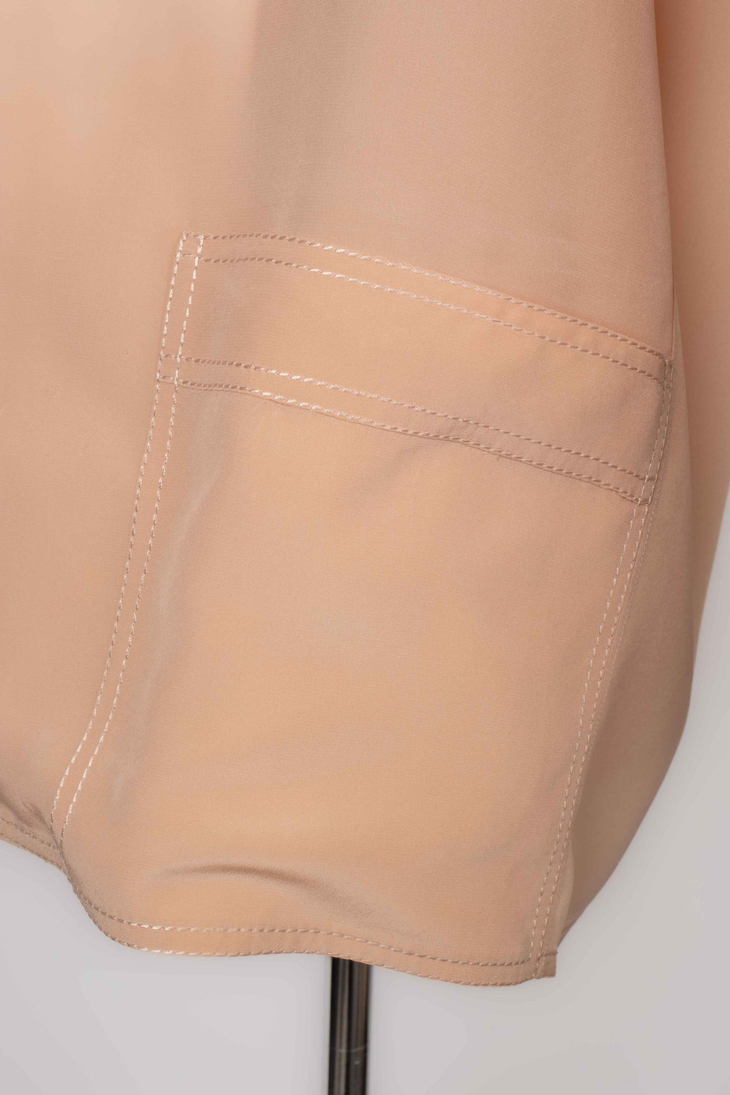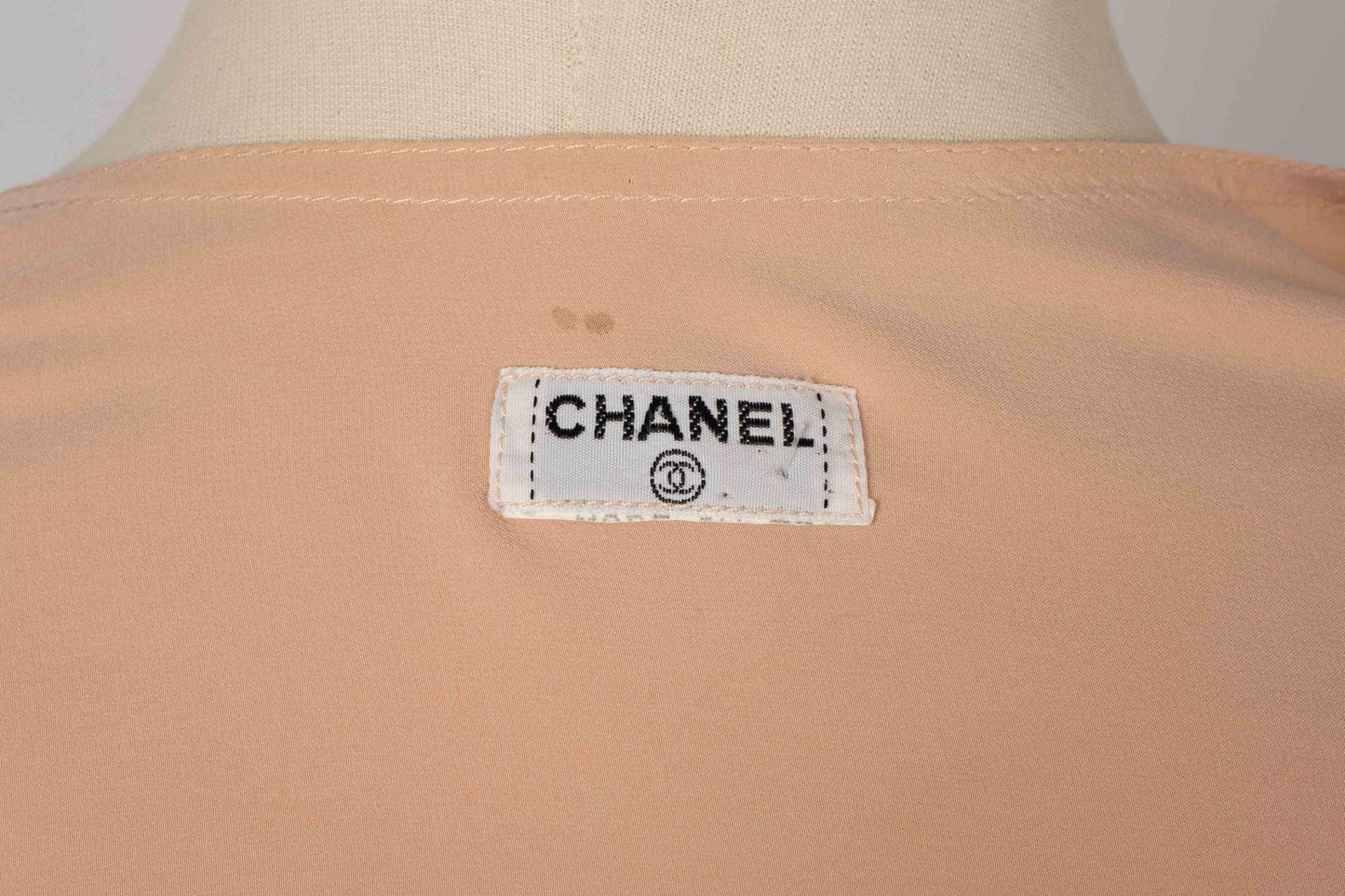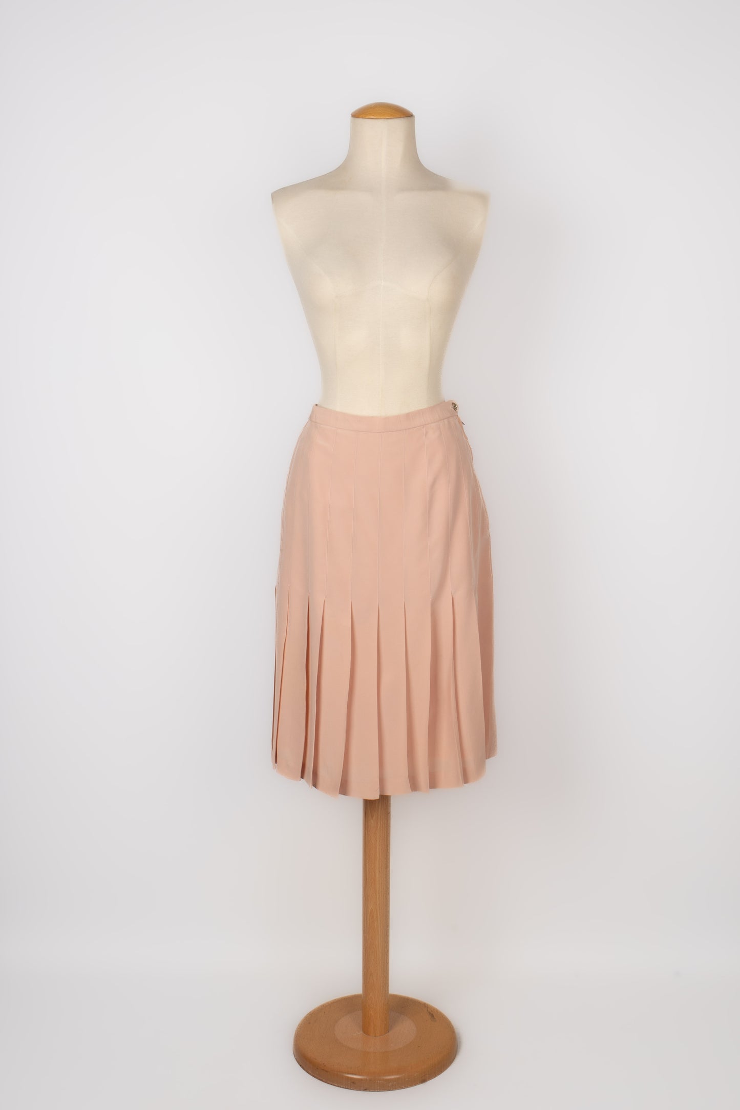 CHANEL - (Made in France) Powder pink silk set composed of a skirt, a sleeveless top and a jacket. No size indicated, it fits a 34FR/36FR.