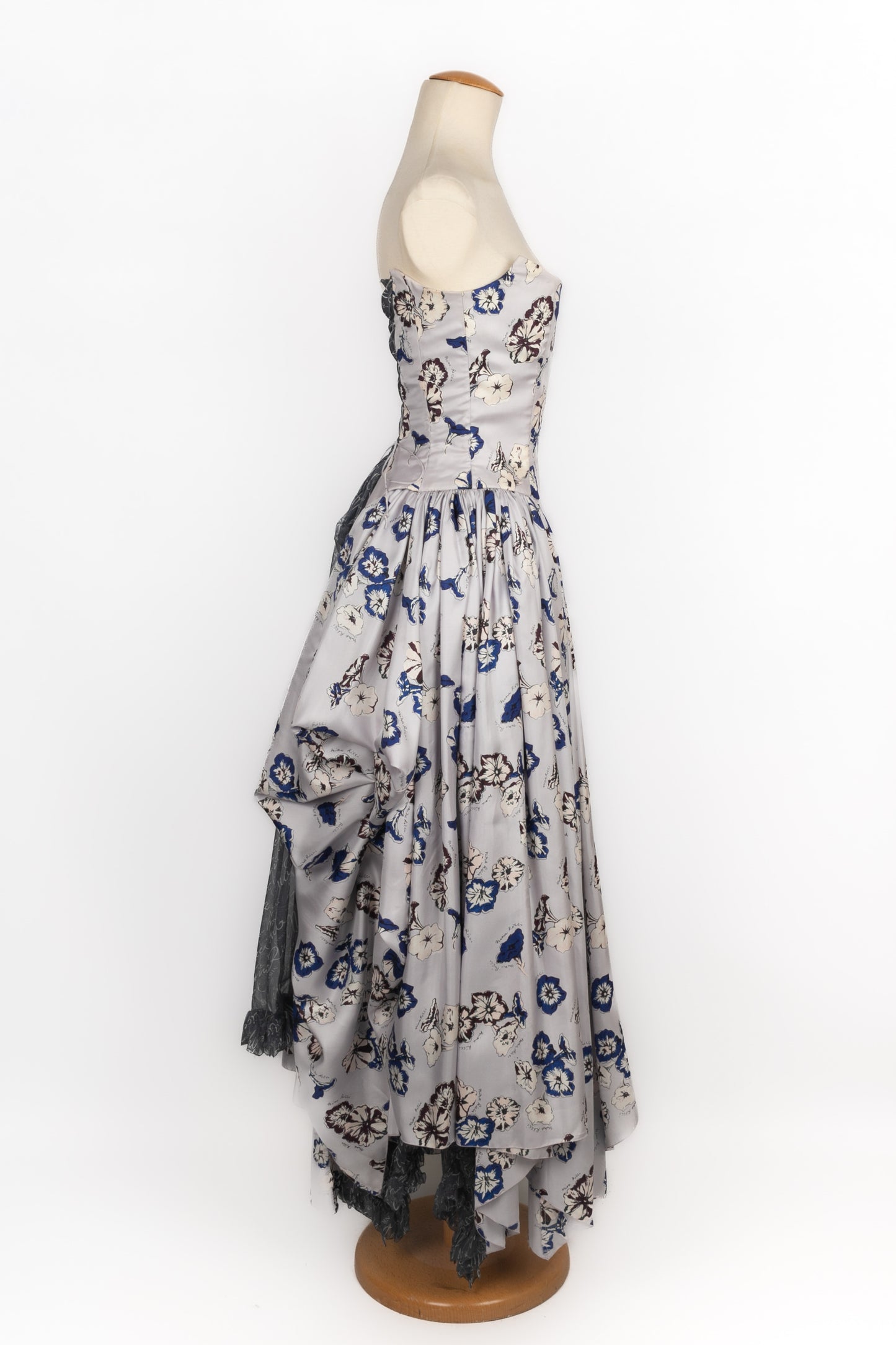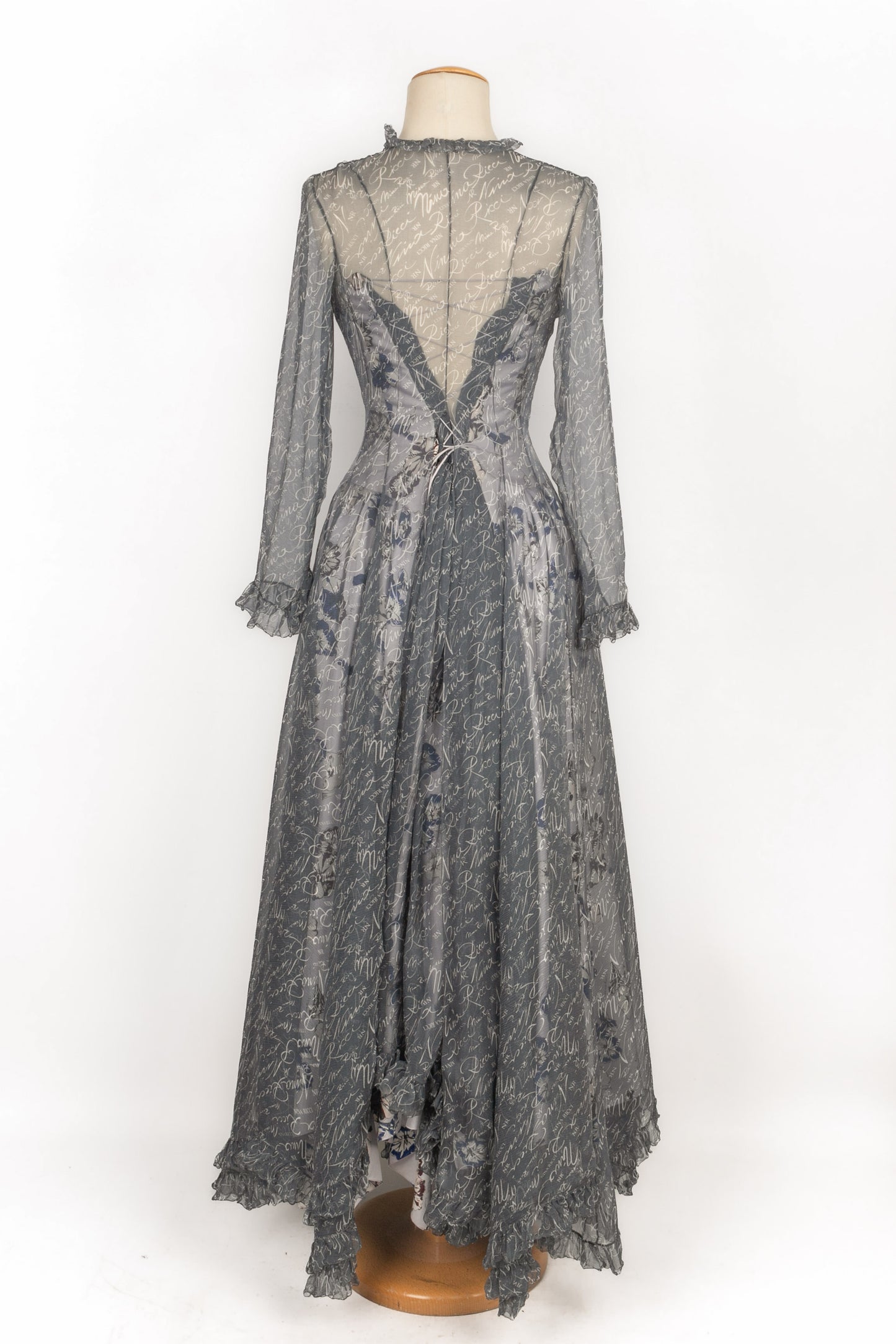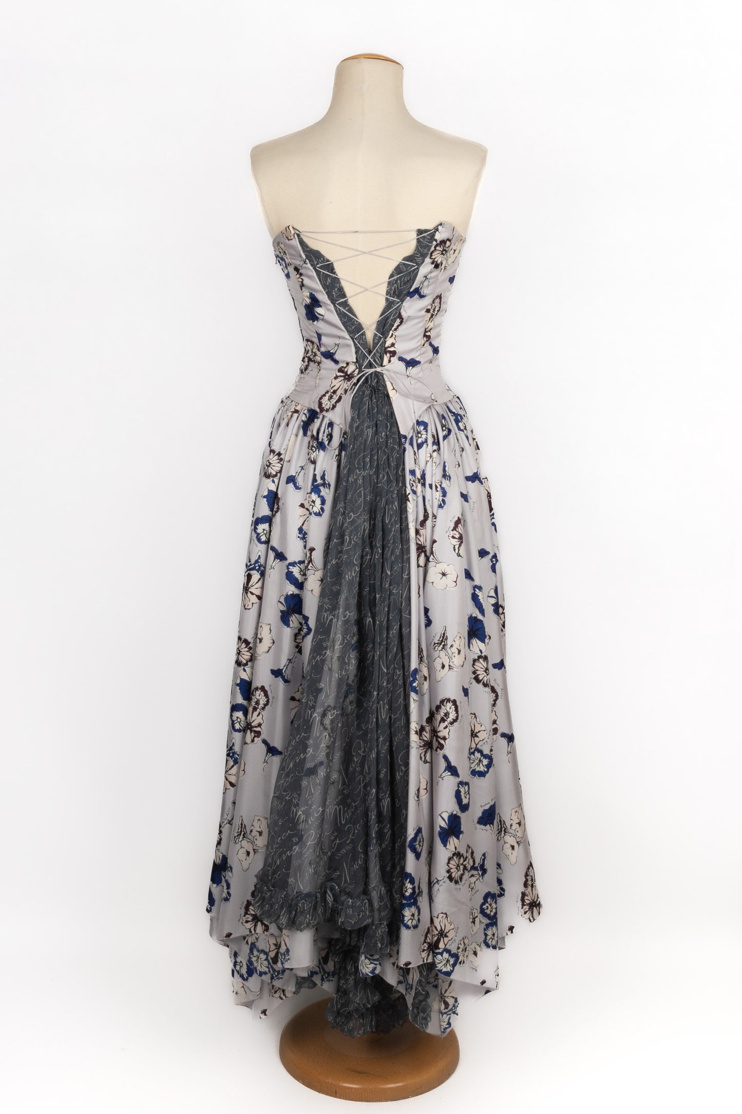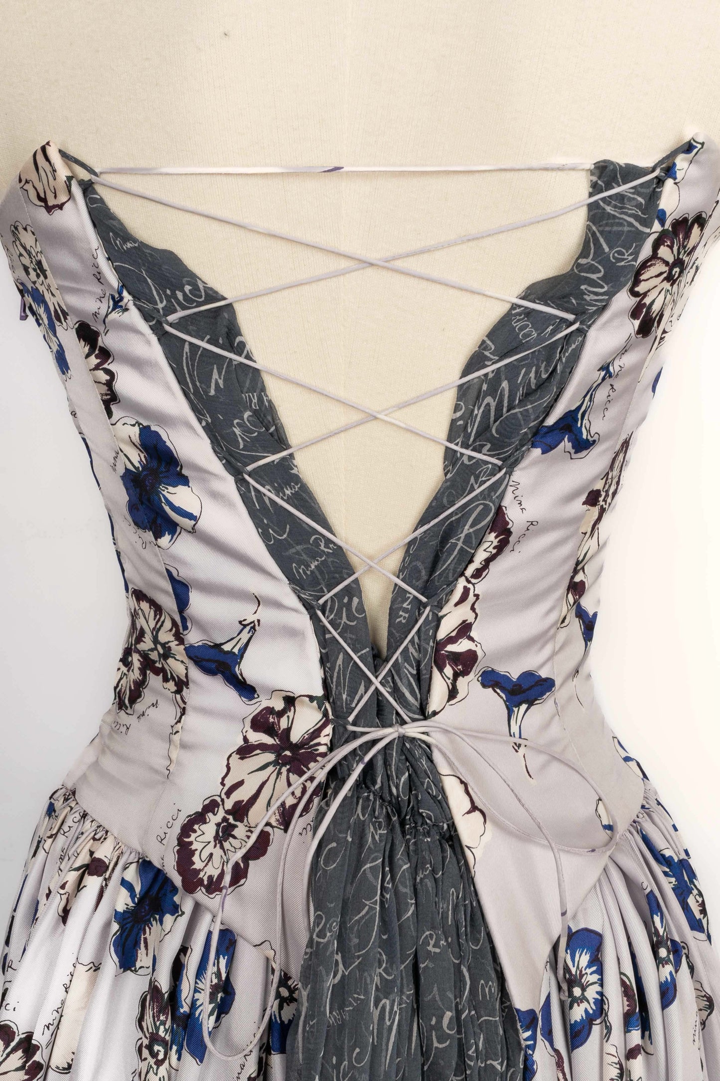 NINA RICCI - Set composed of a silk bustier dress and a muslin jacket printed with the House name. No size indicated, it fits a 34FR/36FR. 1995 Spring-Summer Collection, under the direction of Gérard Pipart.