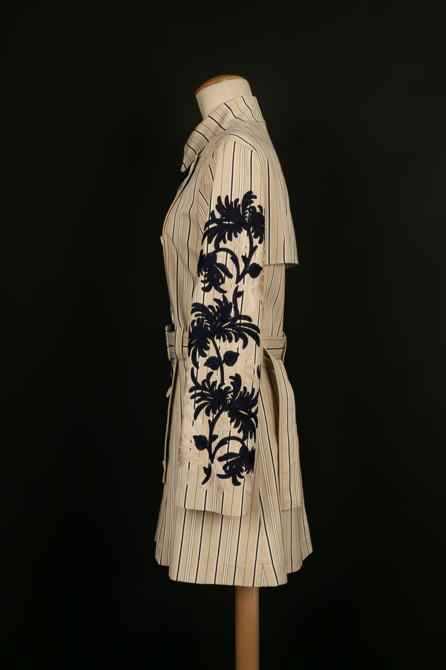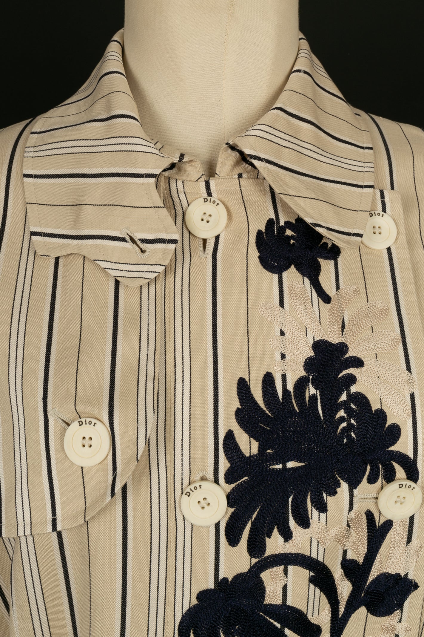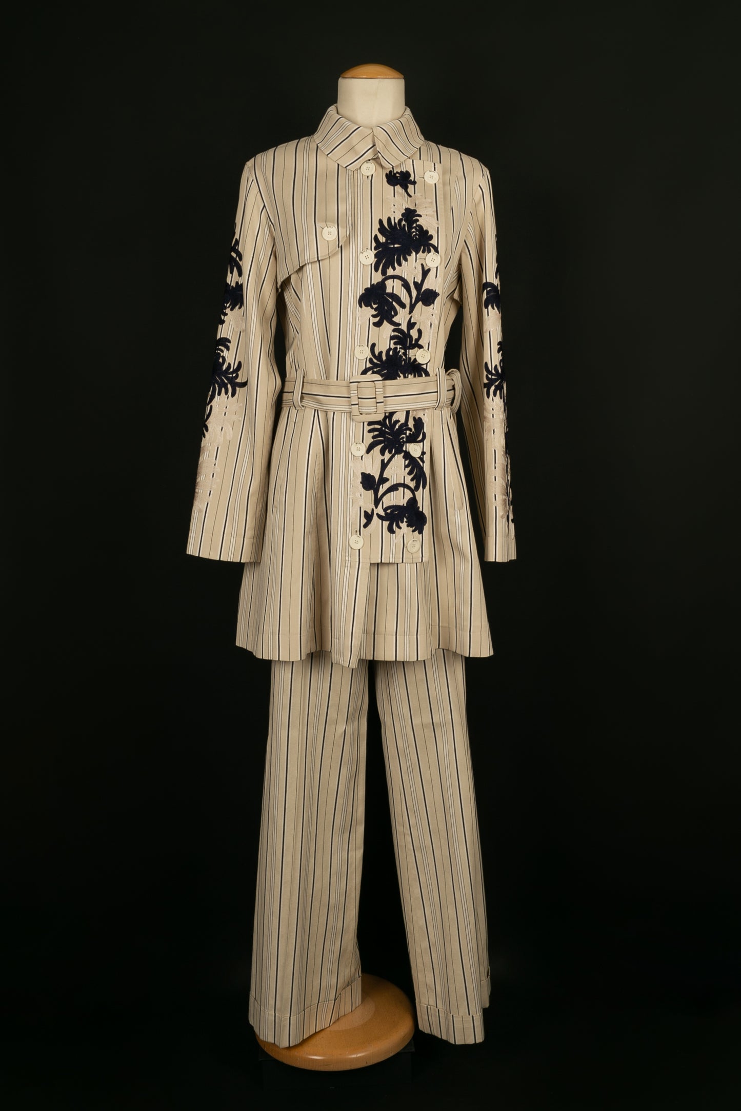 DIOR - (Made in Italy) Set composed of a coat and pants in silk and cotton, embroidered with plant patterns. Indicated size 38FR/40FR.