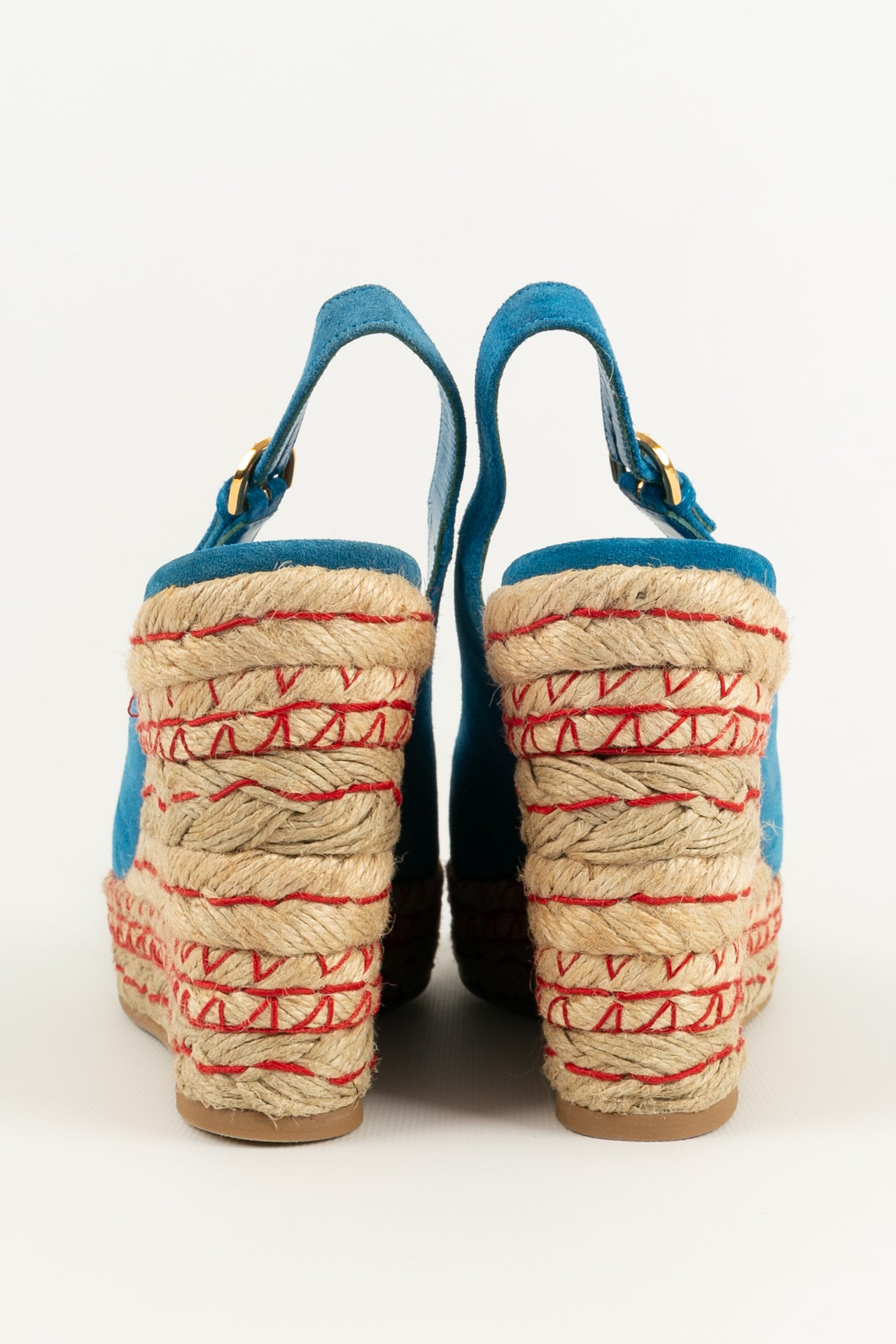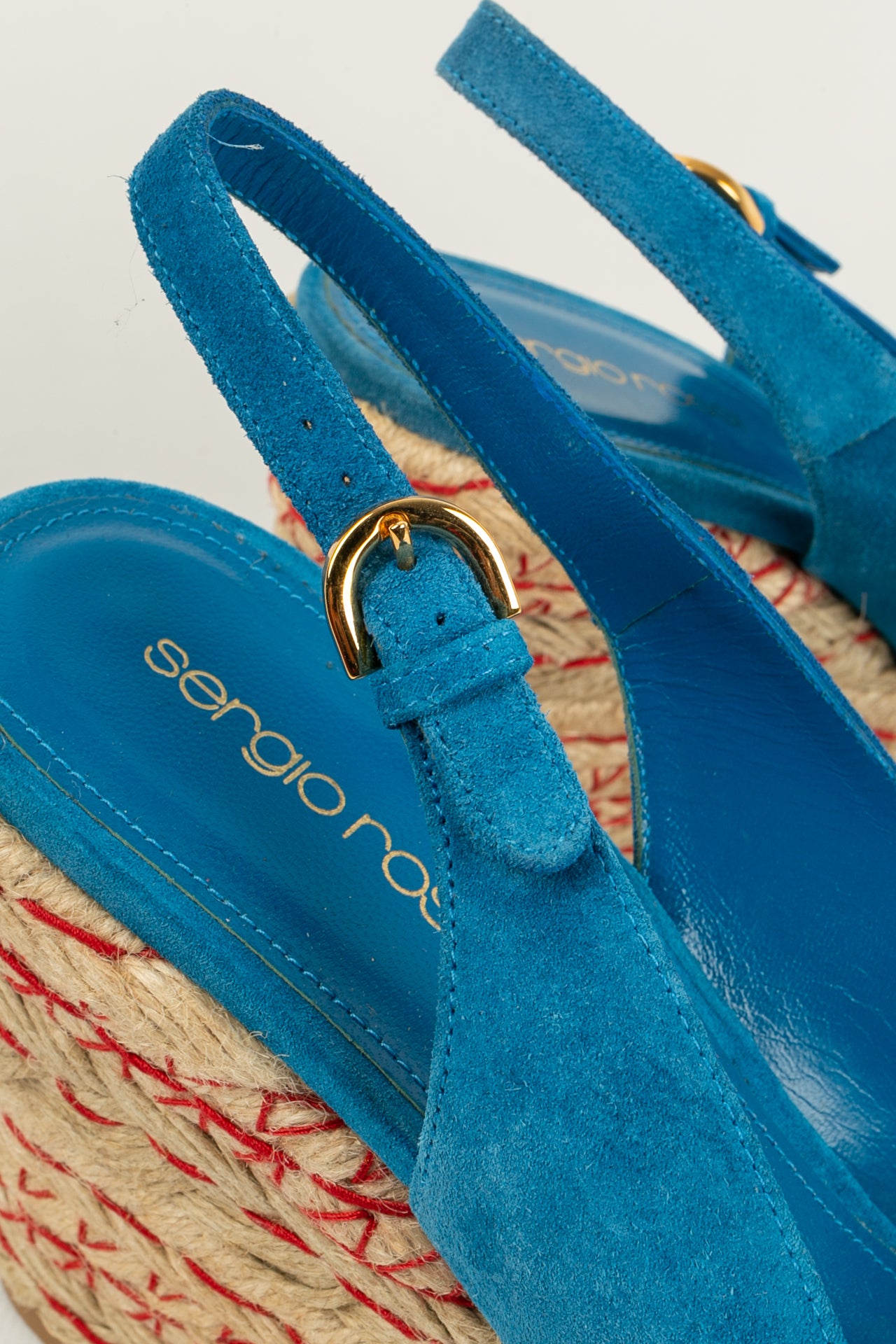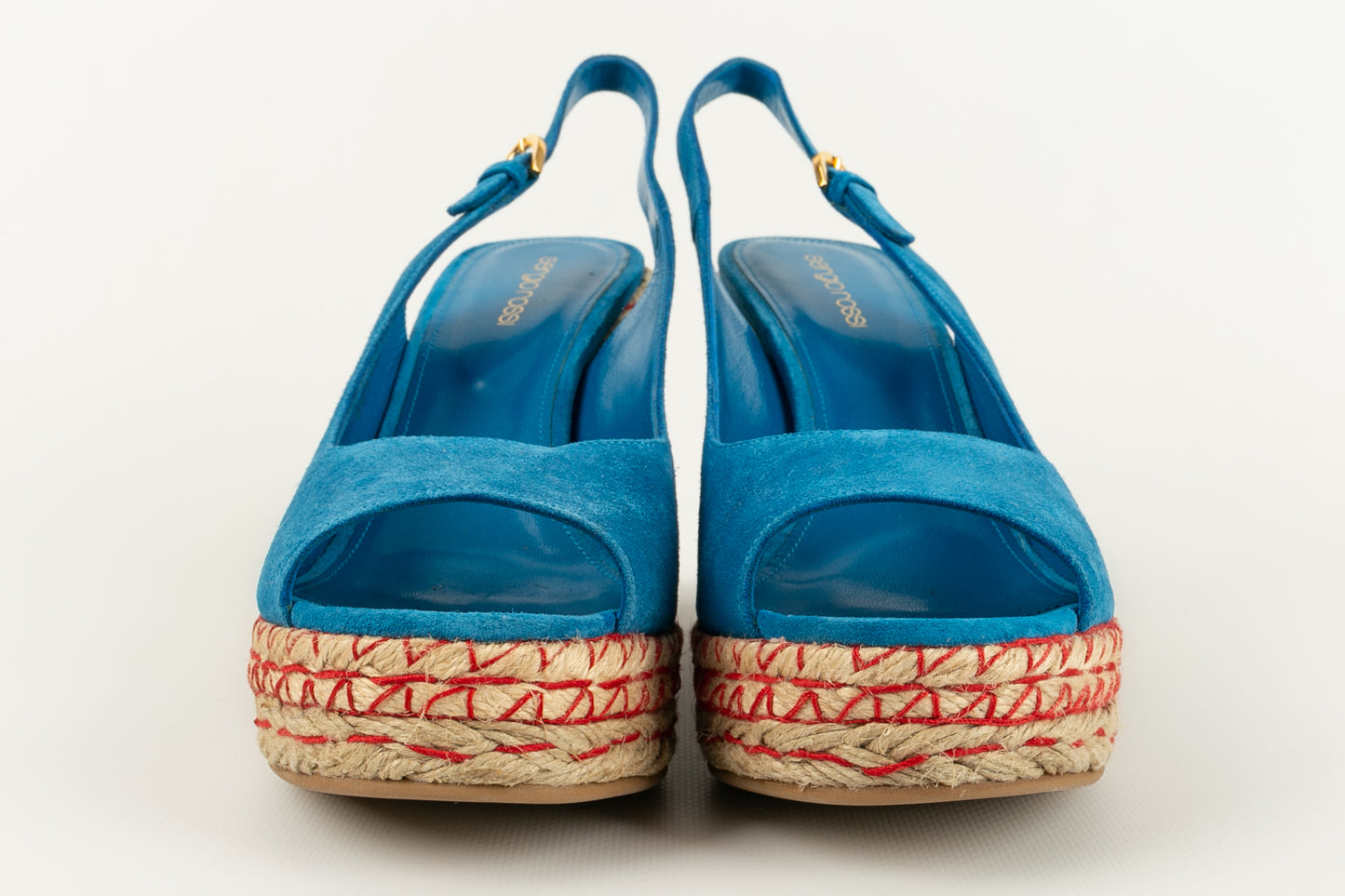 SERGIO ROSSI - (Made in Spain) Blue suede open-toe pumps. Size indicated 39EU.