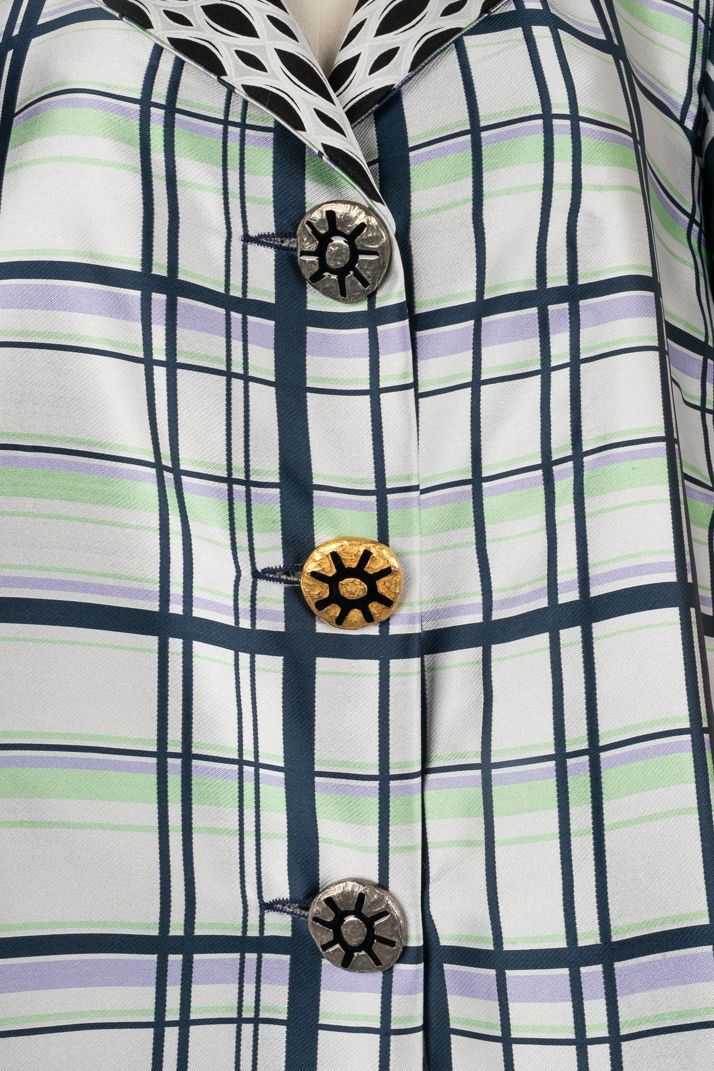 This clothing item, in very good condition, keeps its original quality and allure. The fabric is perfect, without any significant tear or stain, and the stitches are absolutely undamaged. The colours remain bright, and its refined finishes show its excellent maintenance.