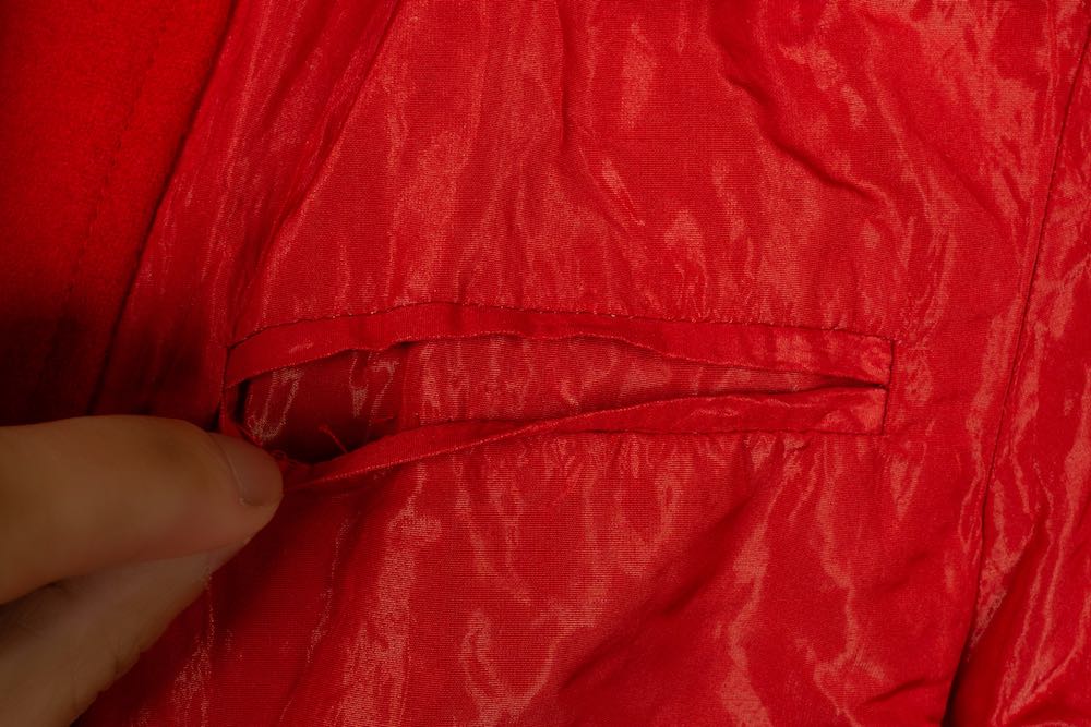 This clothing item, in very good condition, keeps its original quality and allure. The fabric is perfect, without any significant tear or stain, and the stitches are absolutely undamaged. The colours remain bright, and its refined finishes show its excellent maintenance.