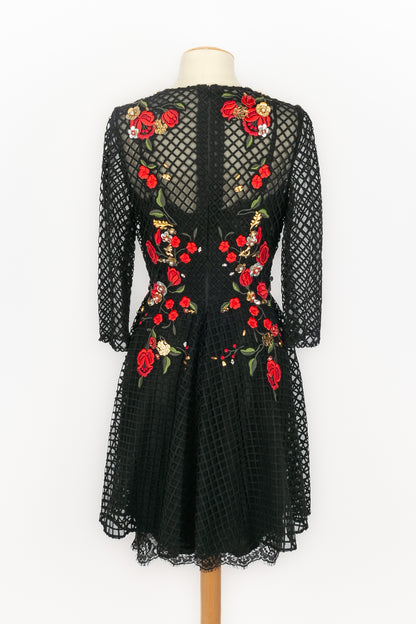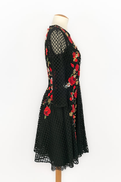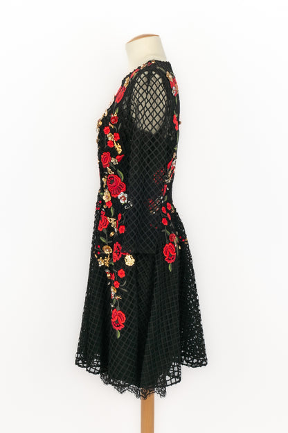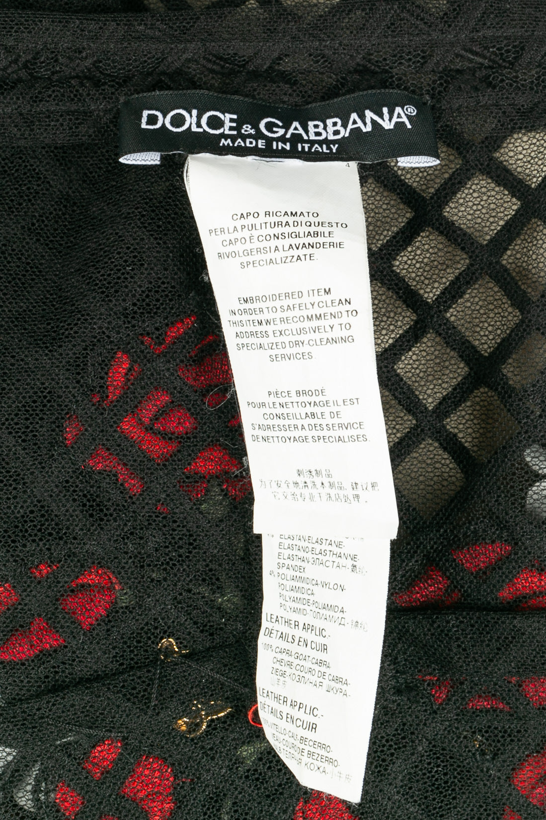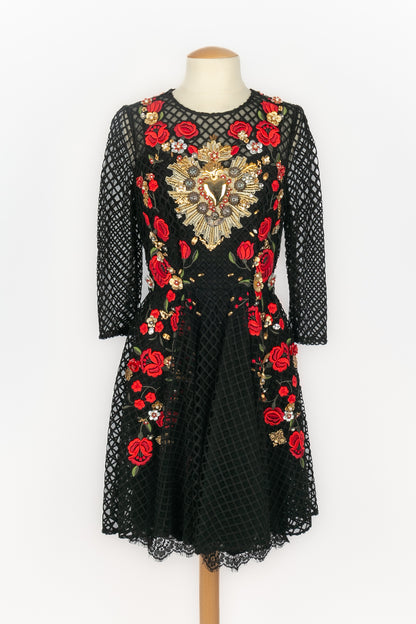 DOLCE & GABBANA - (Made in Italy) Black fishnet dress embroidered with red flowers and with leather and metal flowers. The dress center is decorated with a golden ex voto. No size indicated, it fits a 36FR. 2015 Spring-Summer Collection.