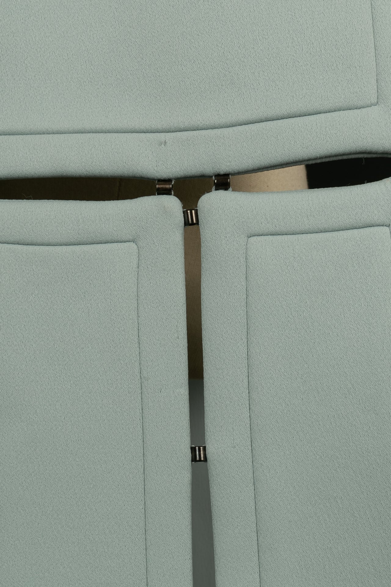 This clothing item, in very good condition, keeps its original quality and allure. The fabric is perfect, without any significant tear or stain, and the stitches are absolutely undamaged. The colours remain bright, and its refined finishes show its excellent maintenance.