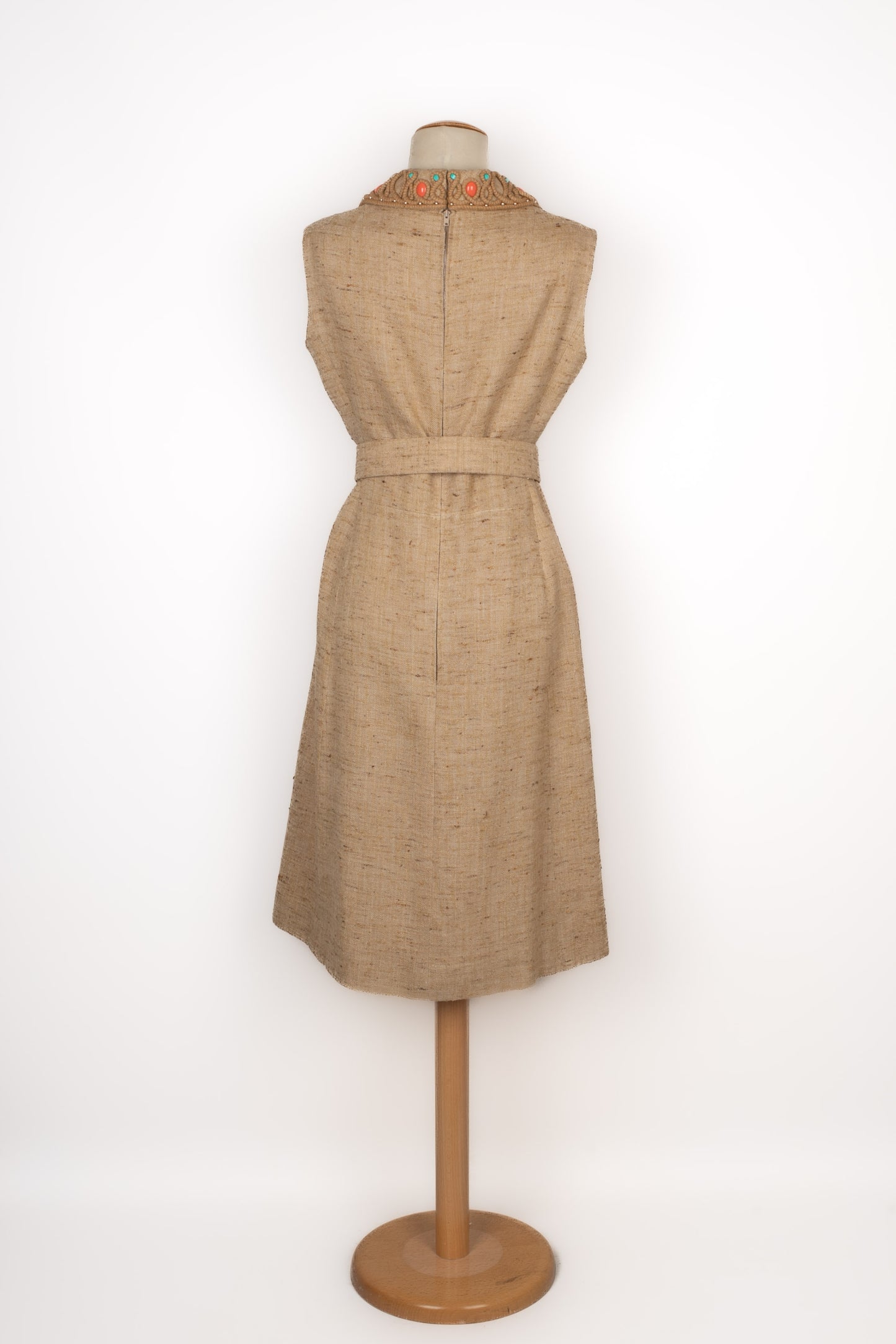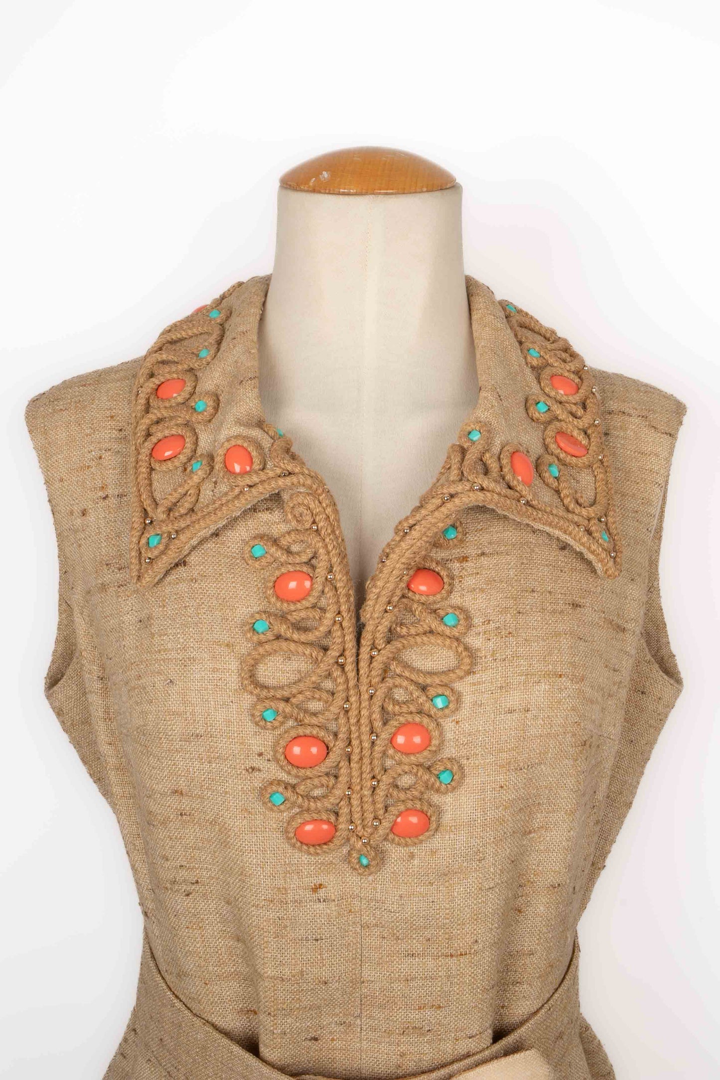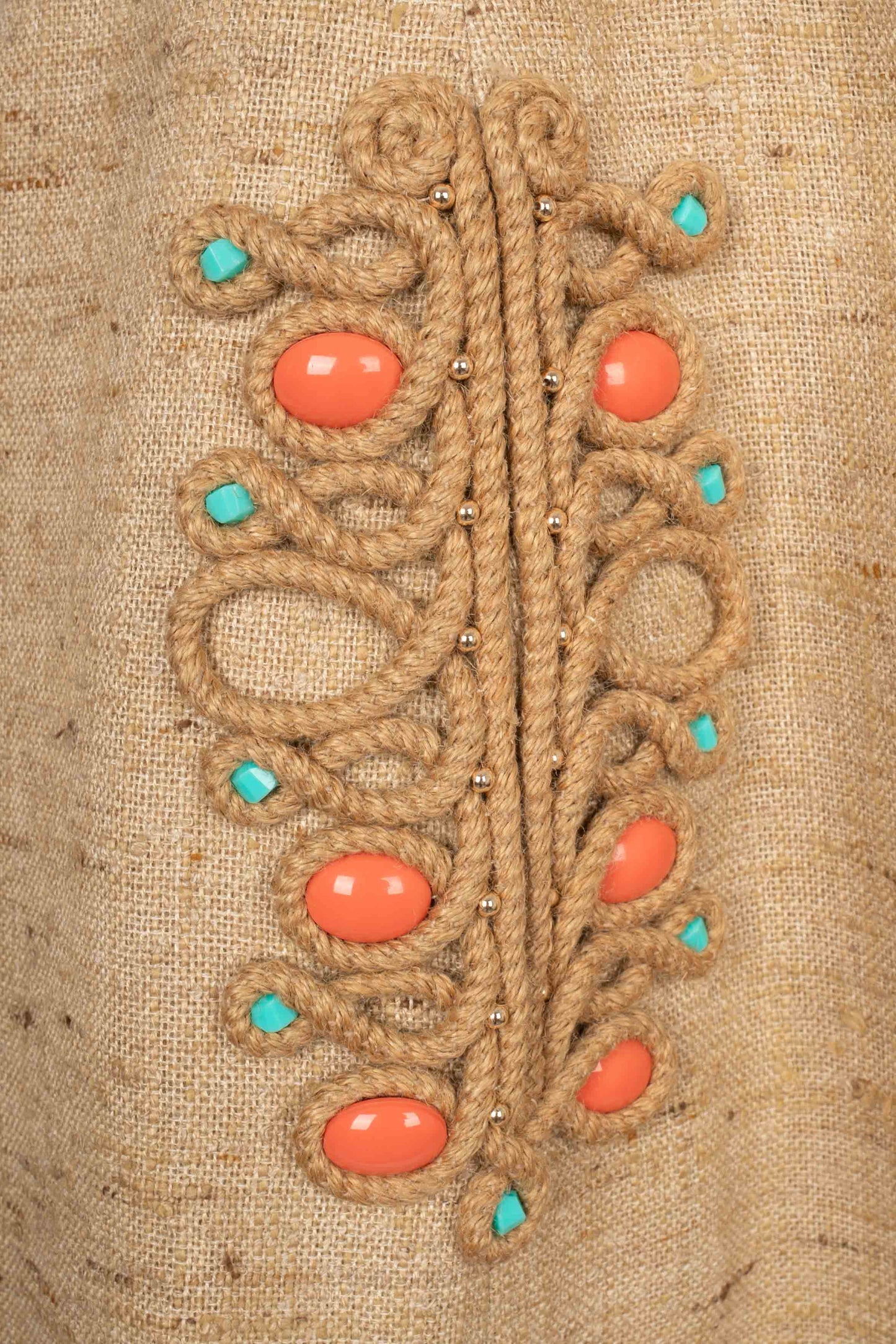 BALMAIN - Beige linen canvas dress, cord braid ornamented with turquoise-like and coral-like stones. Missing size and composition labels, it fits a 38FR.