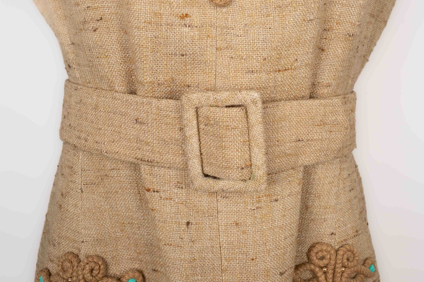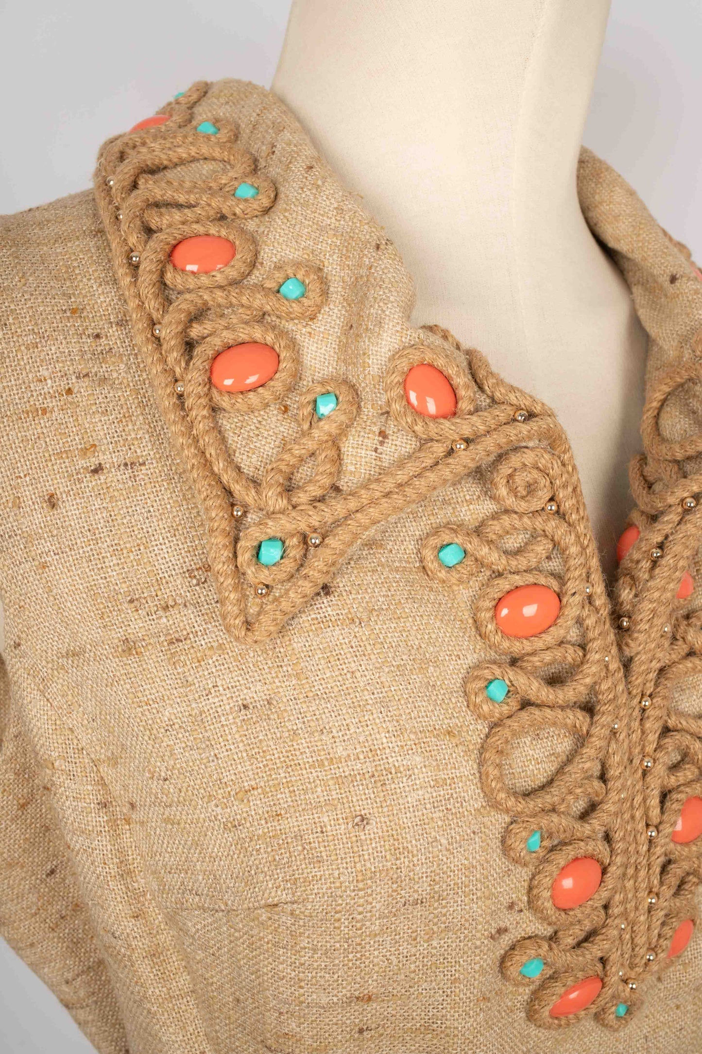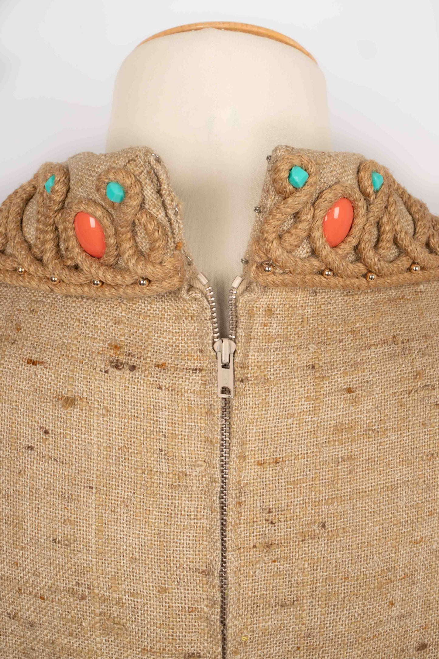 BALMAIN - Beige linen canvas dress, cord braid ornamented with turquoise-like and coral-like stones. Missing size and composition labels, it fits a 38FR.