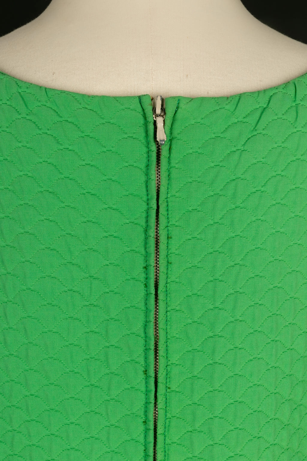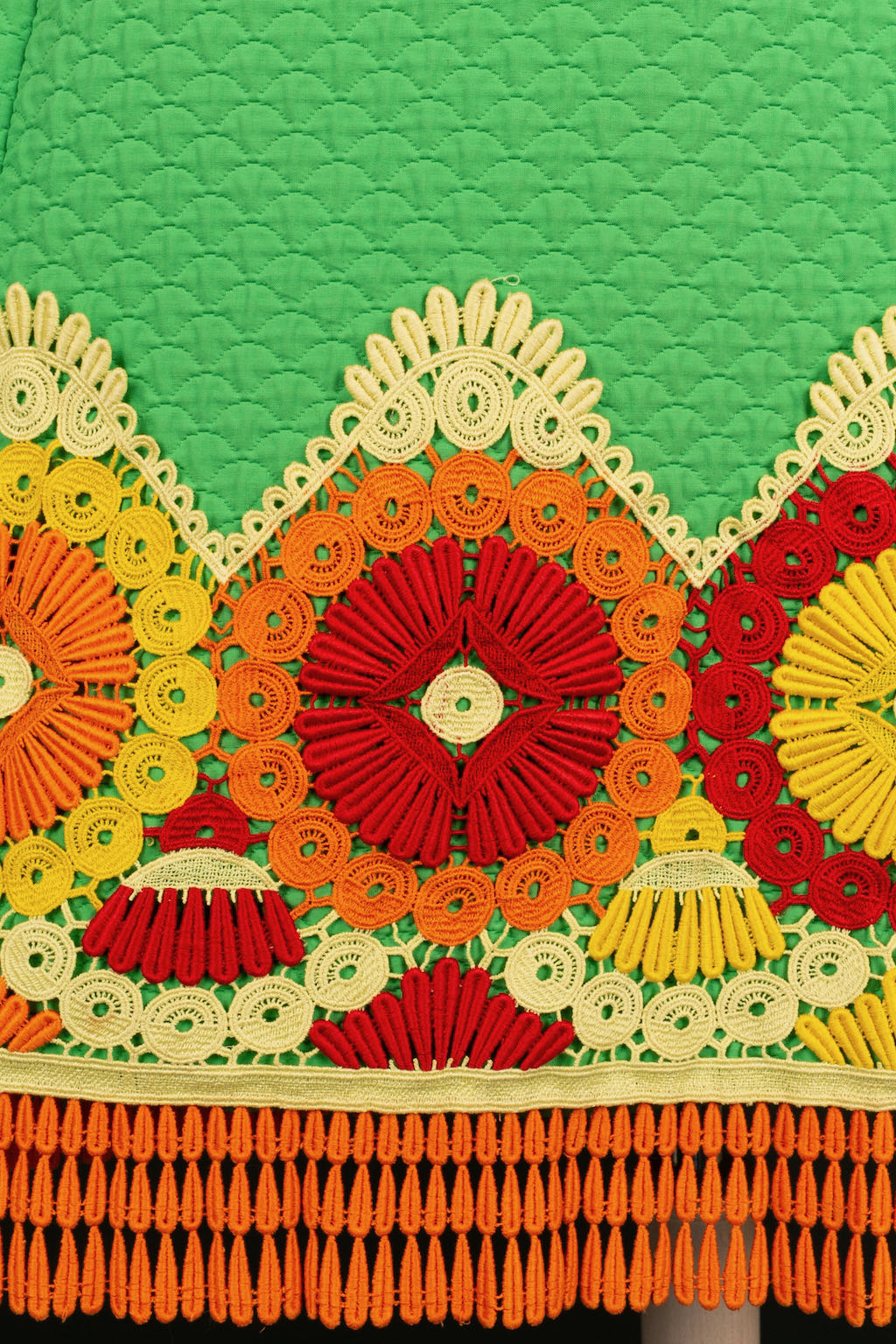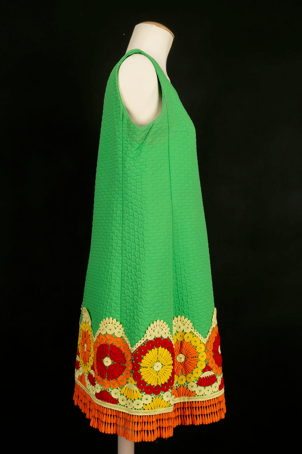 YVES SAINT LAURENT - Green cotton trapeze dress with red, orange and yellow guipure application. Model dating from 1966-67. No label of size or composition, it corresponds to a 40FR. Presence of discoloration on the lining. Similar model worn by Catherine Deneuve photographed by David Bailey in the catalog "La Révolution de la Mode", page 133.