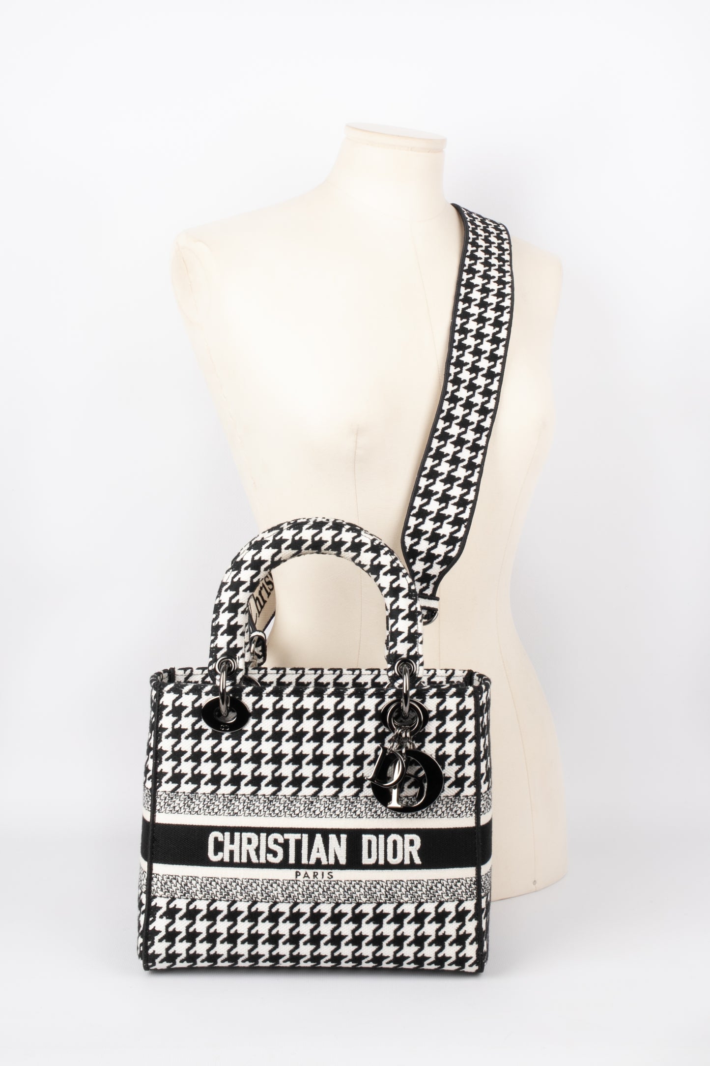 DIOR - Black and white houndstooth canvas Lady Dior bag with a double handle holding charms representing the letters of the House and with a removable strap. 2022 Collection, sold with a serial number.