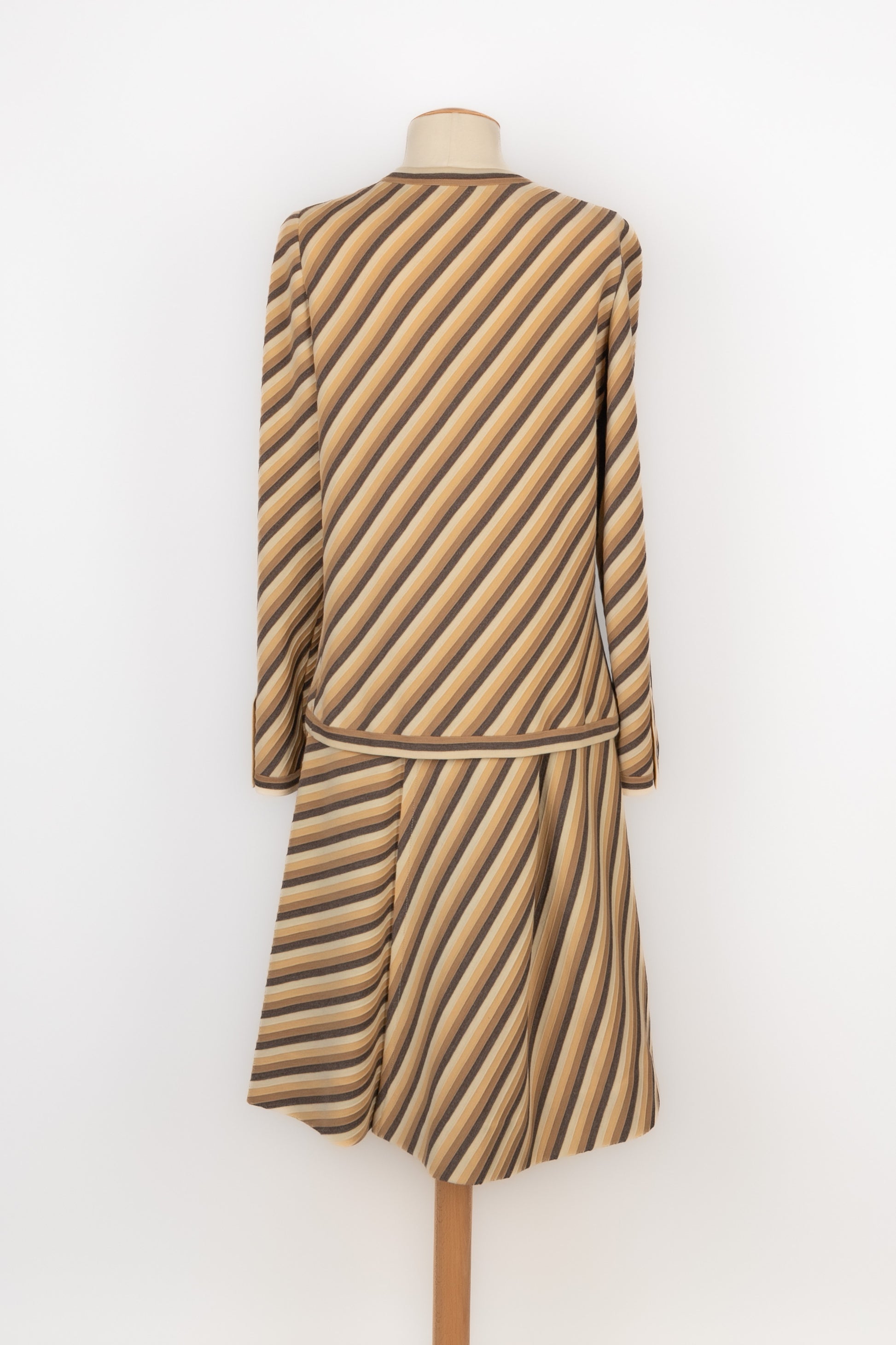 CHANEL - (Made in France) Jersey suit composed of a jacket and an A-line skirt. Size and composition labels missing, it fits a 36FR/38FR. To be mentioned, the lining was replaced.