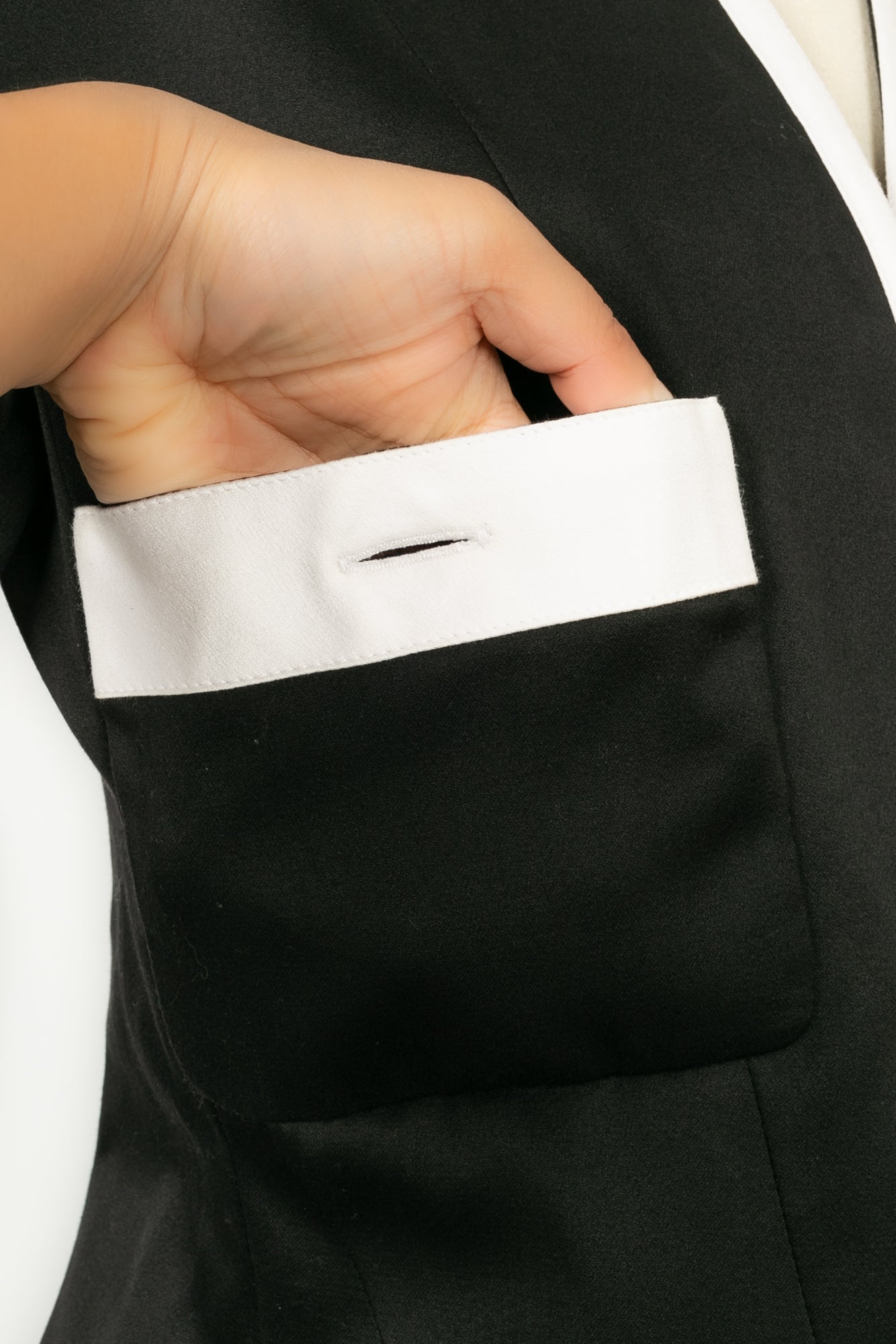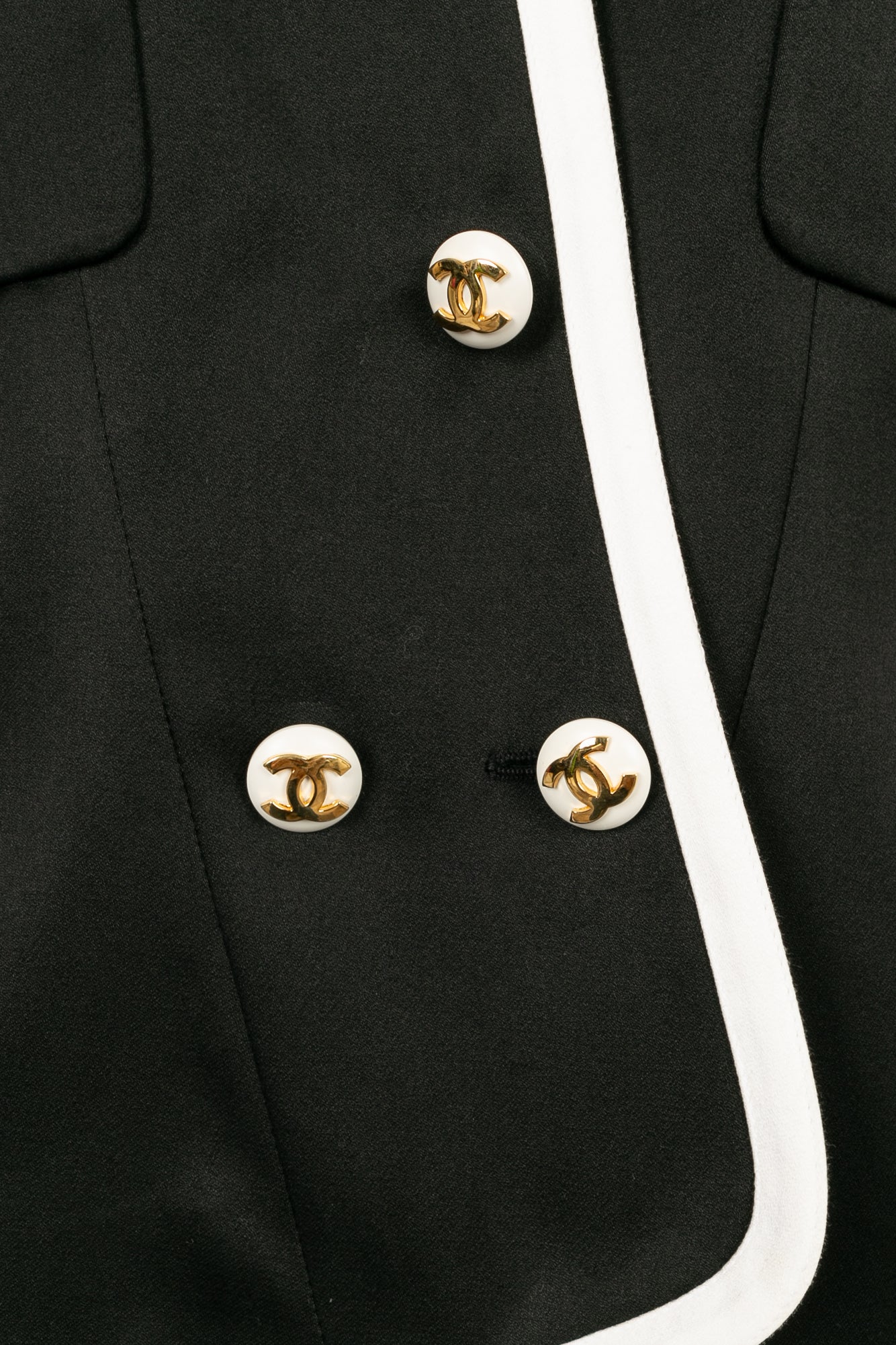 CHANEL - Short-sleeved jacket in black satin edged with white satin. No size indicated, it fits a 40FR/42FR.