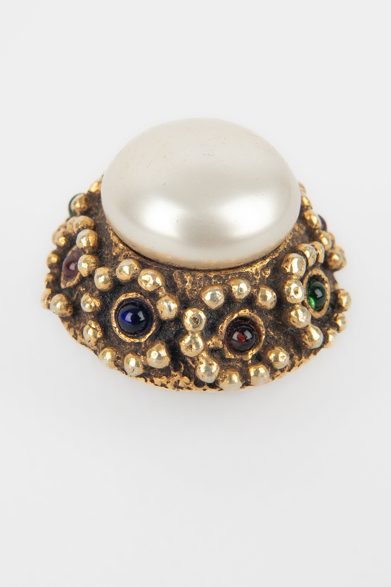 CHANEL -(Made in France) Boucles d'oreilles clips en métal doré, cabochon de nacre et pâte de verre.