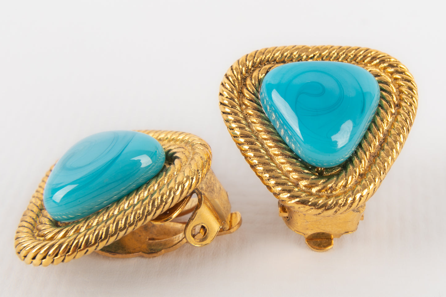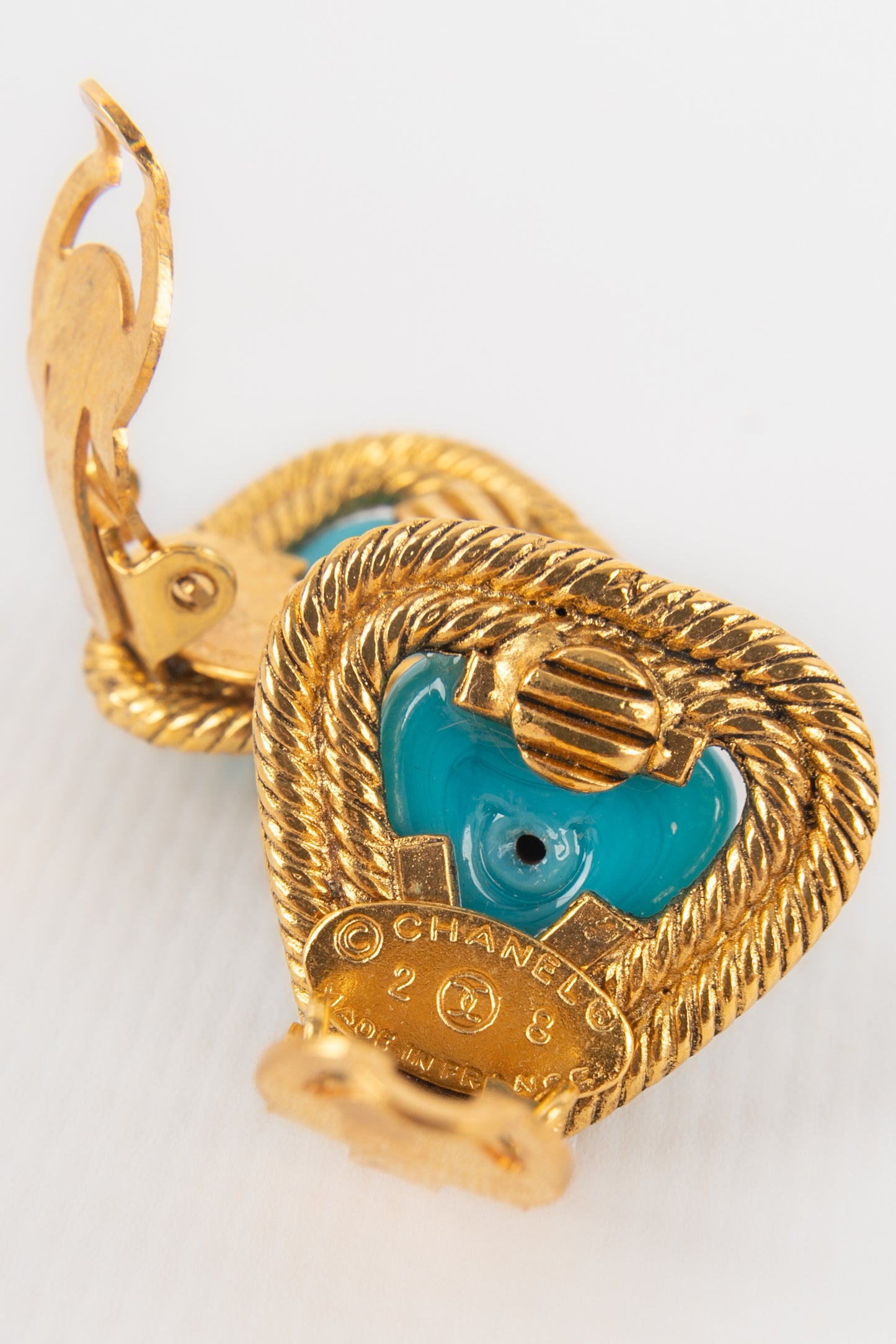 CHANEL -(Made in France) Boucles d'oreilles en métal doré et pâte de verre bleu. Collection 2cc8.