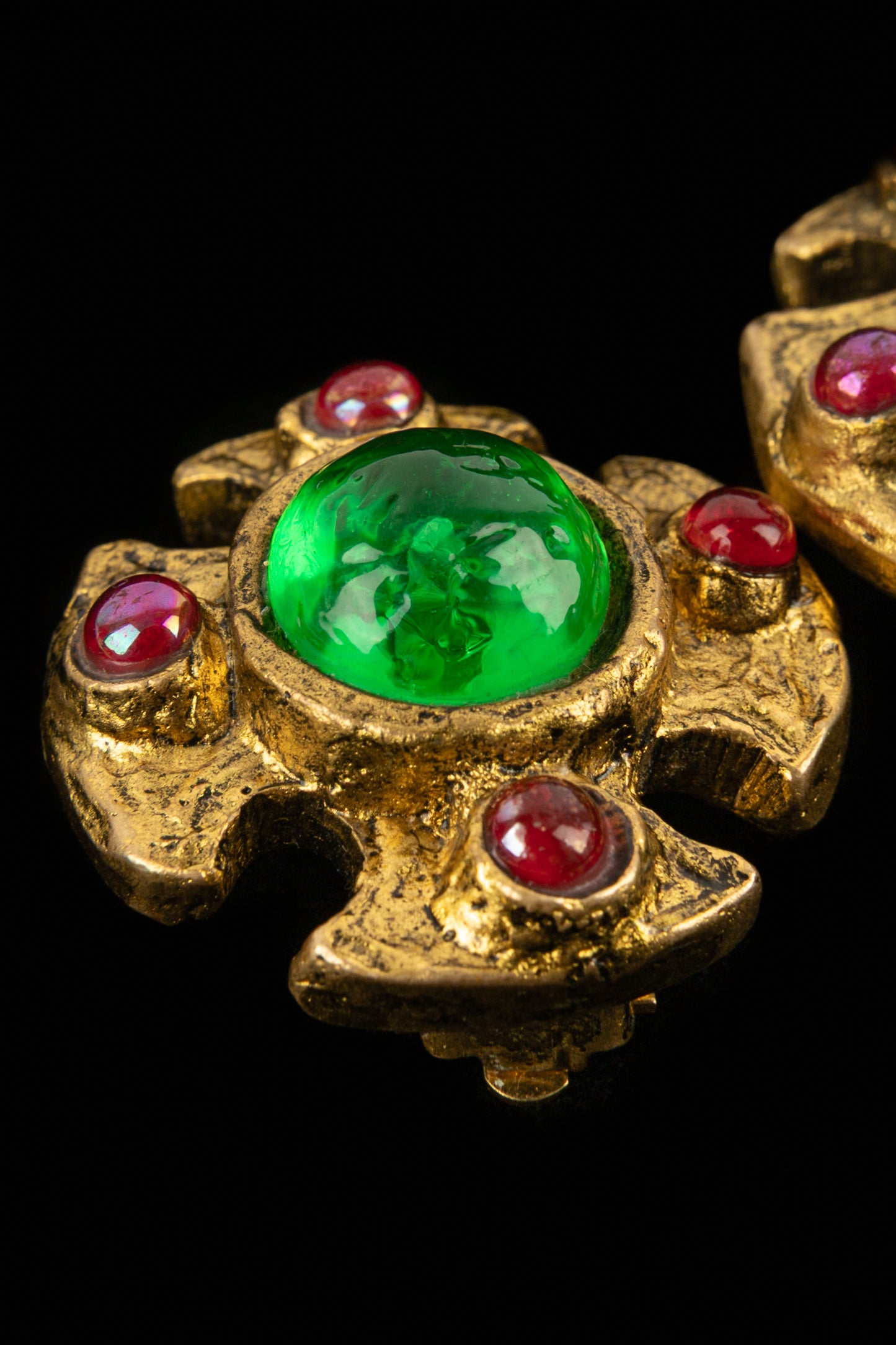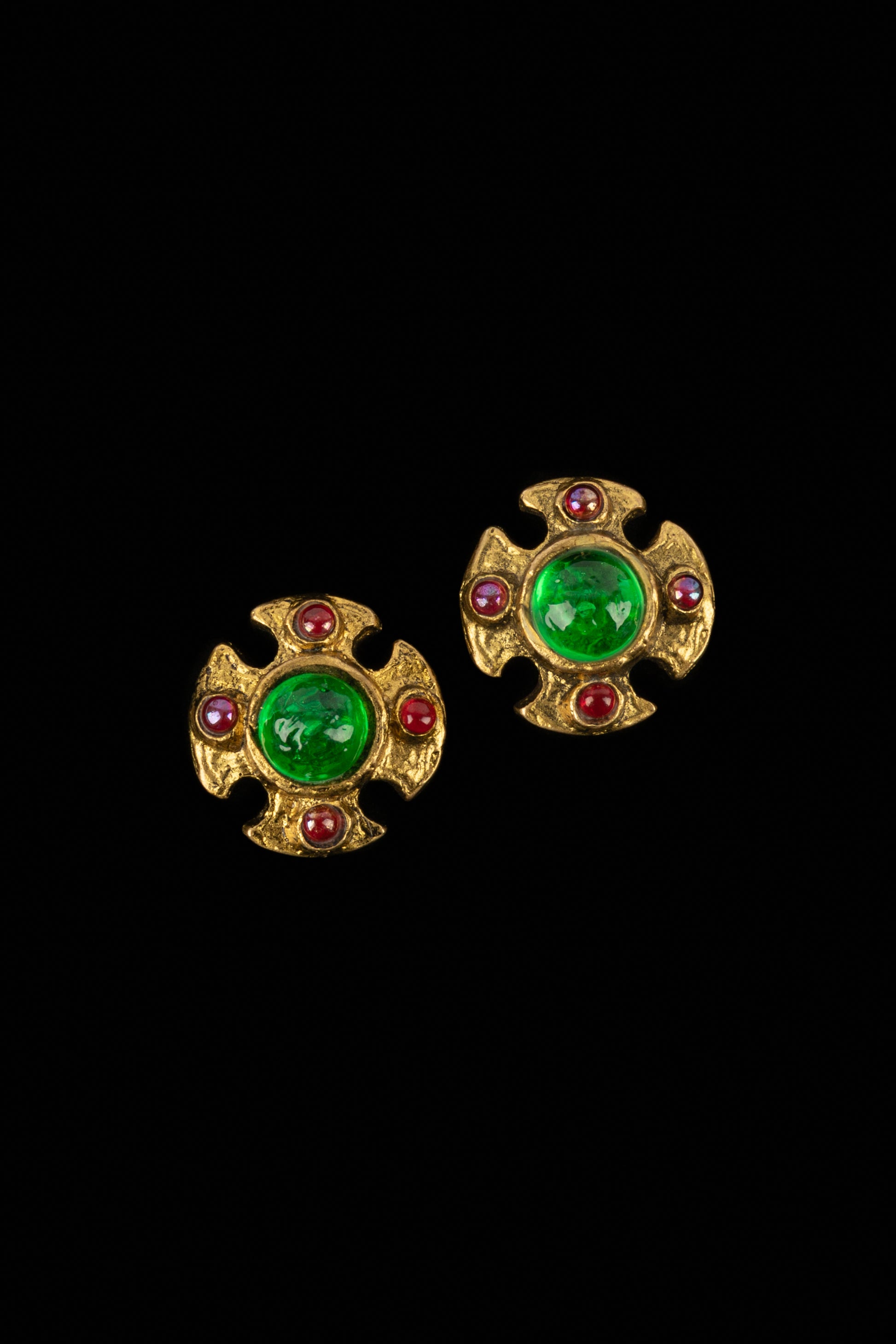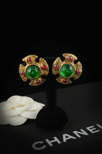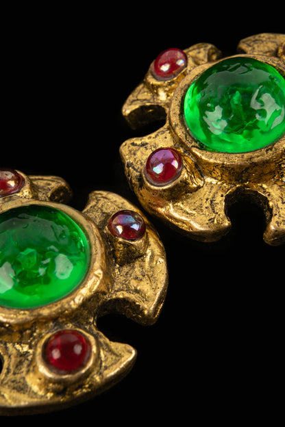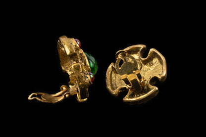 CHANEL - (Made in France) Boucles d'oreilles clips en métal doré et pâte de verre de couleur rouge et verte. Collection Haute Couture datant de la période de Coco Chanel.