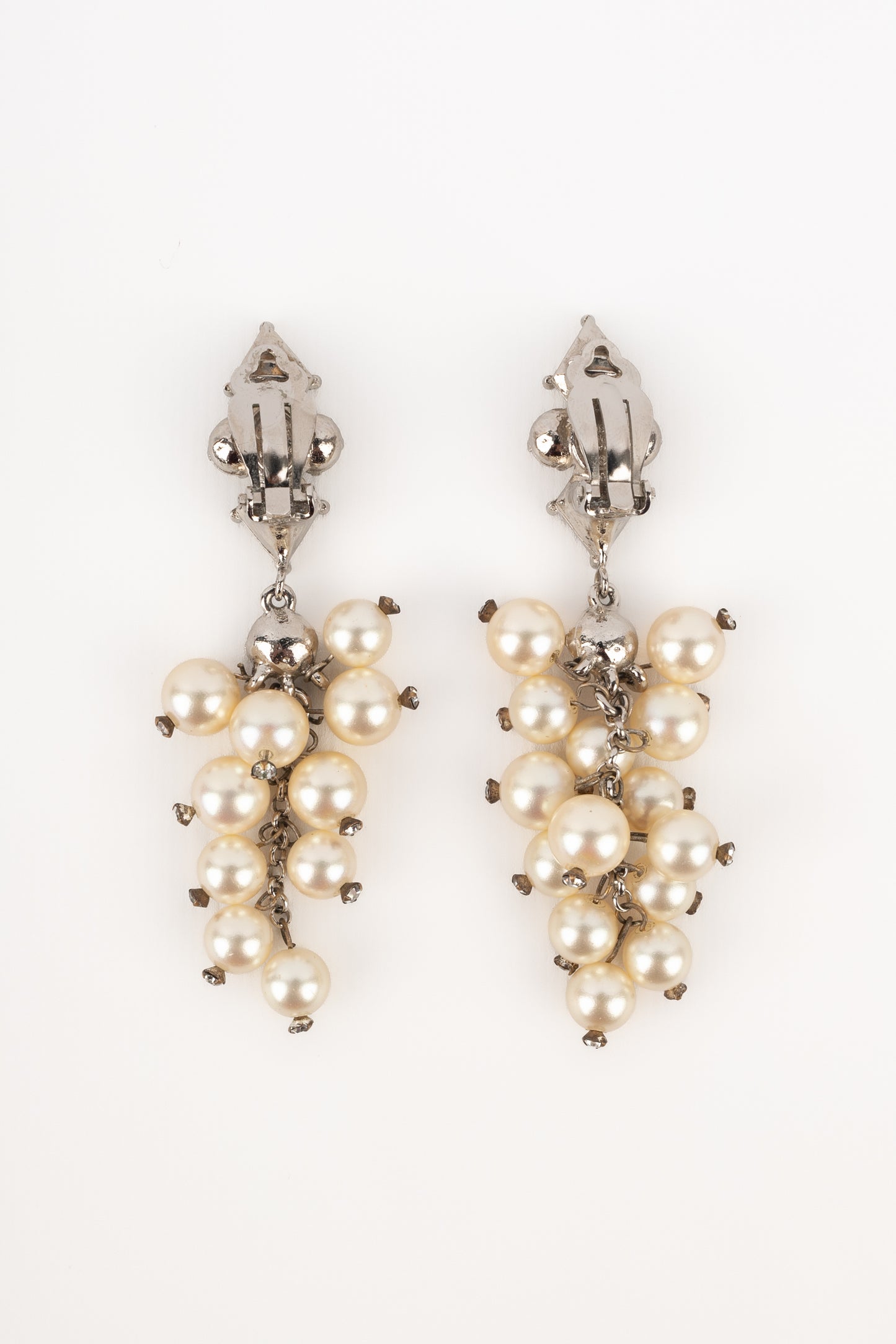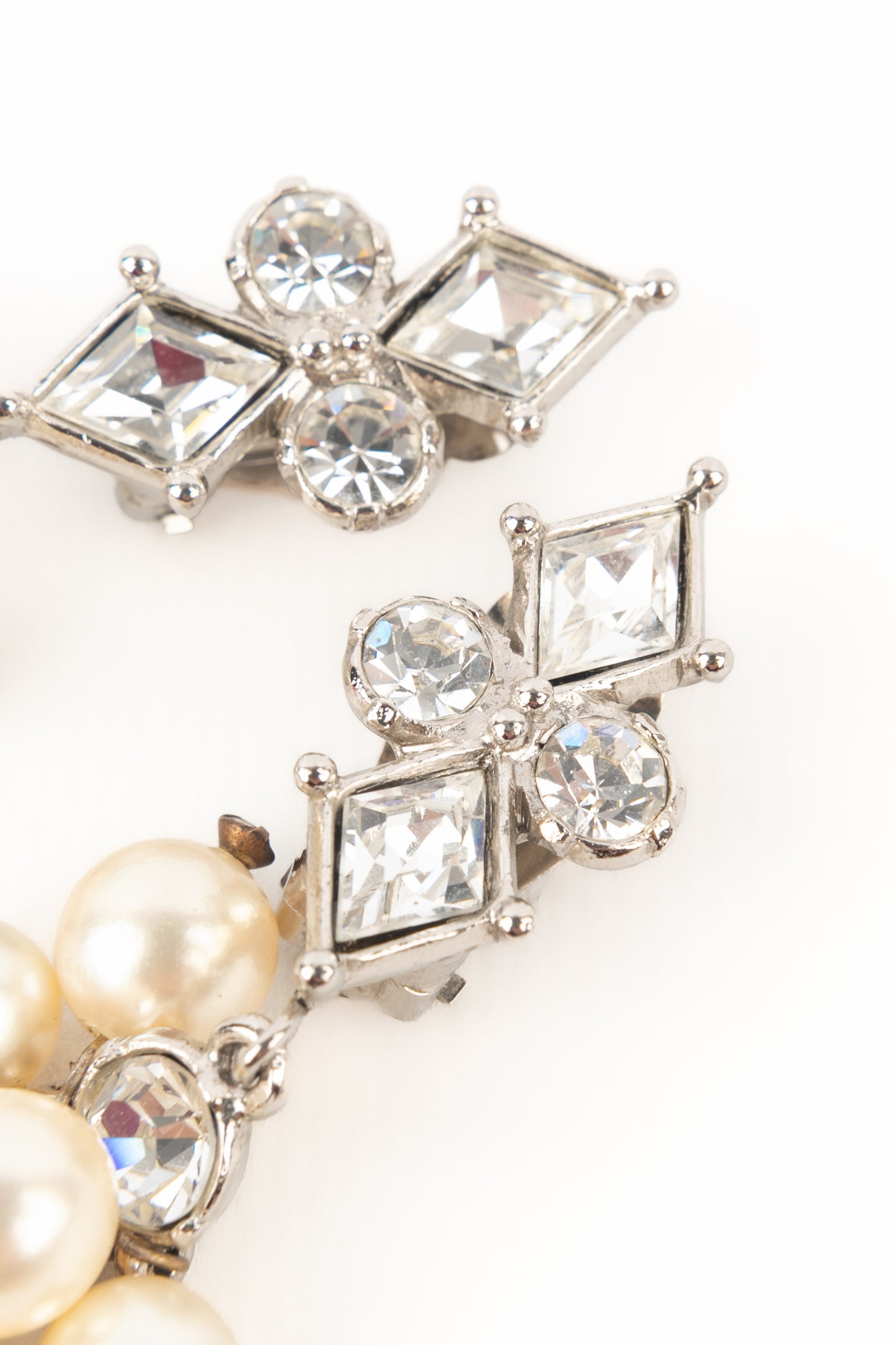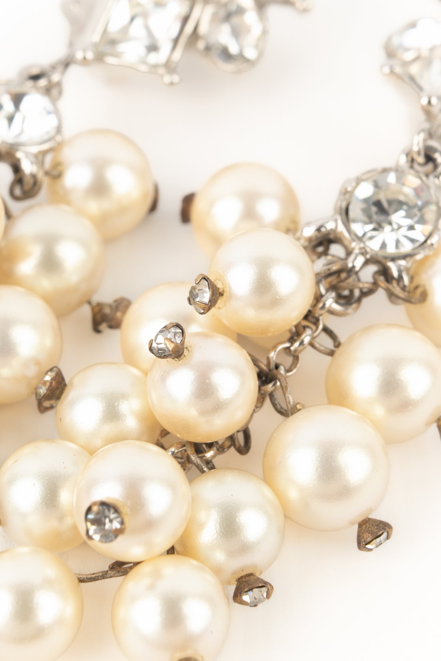 DIOR -Boucles d'oreilles en métal argenté pavé de strass, retenant une cascade de perles de nacre fantaisie.