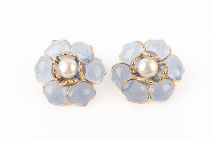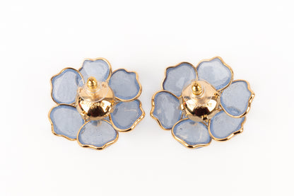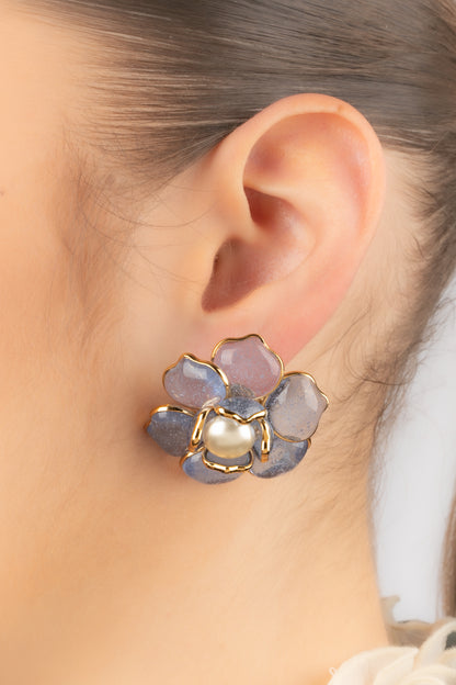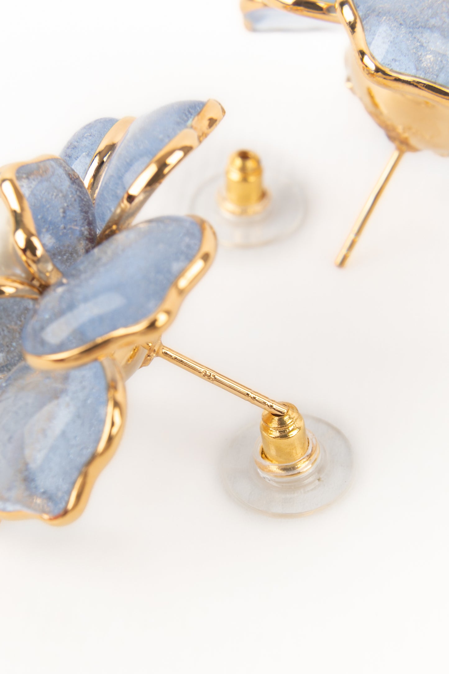 AUGUSTINE - (Made in France) Boucles d'oreilles fleurs en métal doré et pâte de verre bleu lavande. Le coeur est un cabochon de nacre fantaisie.