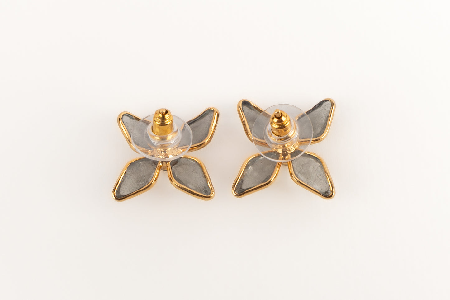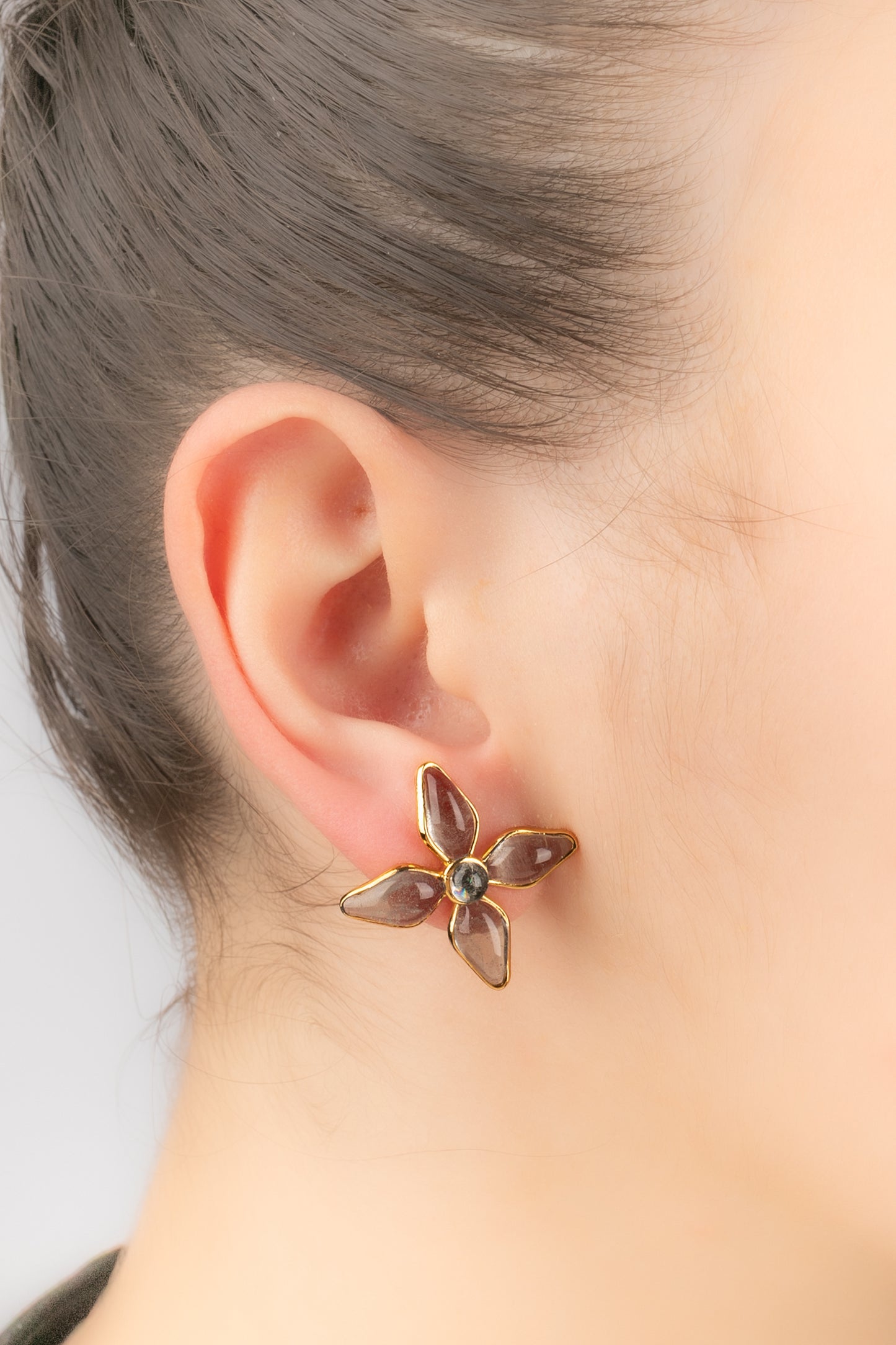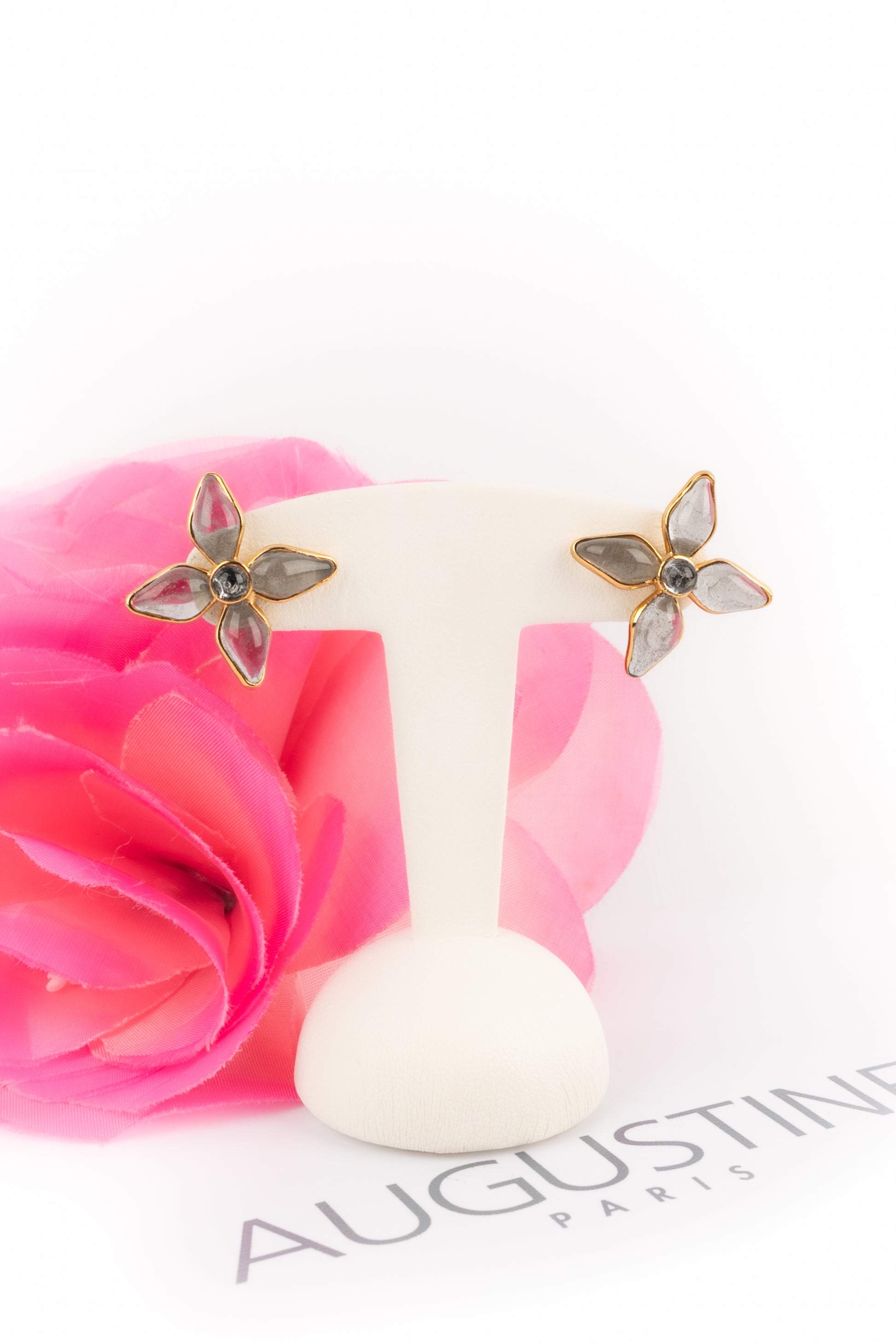 AUGUSTINE - (Made in France) Boucles d'oreilles fleur en métal doré et pâte de verre gris fumé.