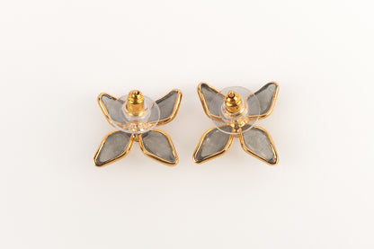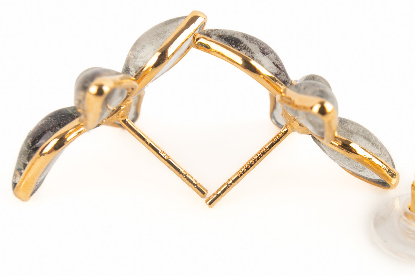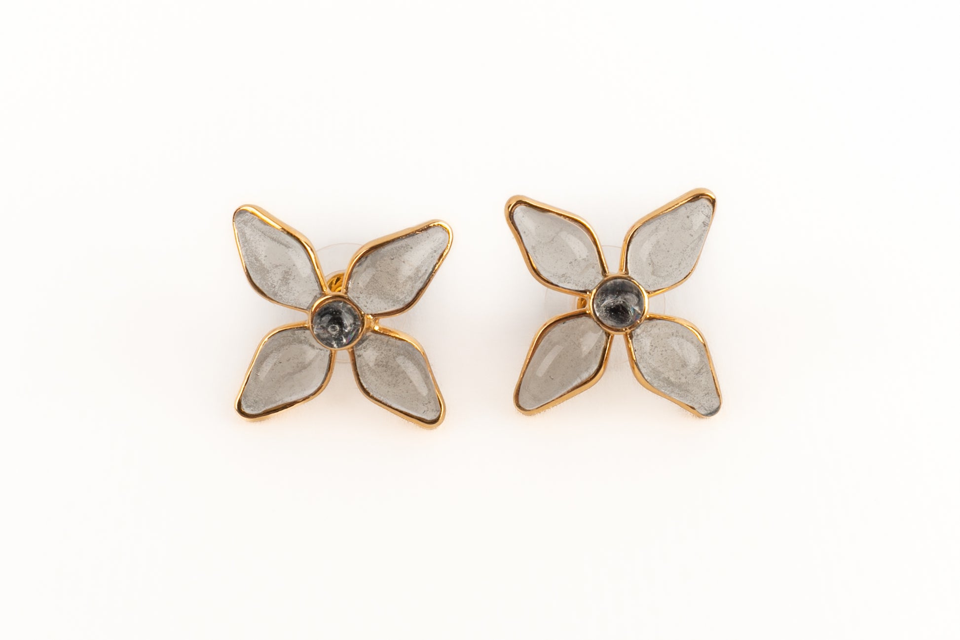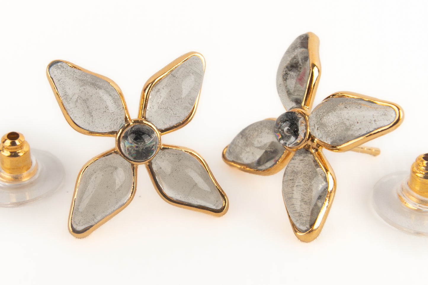 AUGUSTINE - (Made in France) Boucles d'oreilles fleur en métal doré et pâte de verre gris fumé.