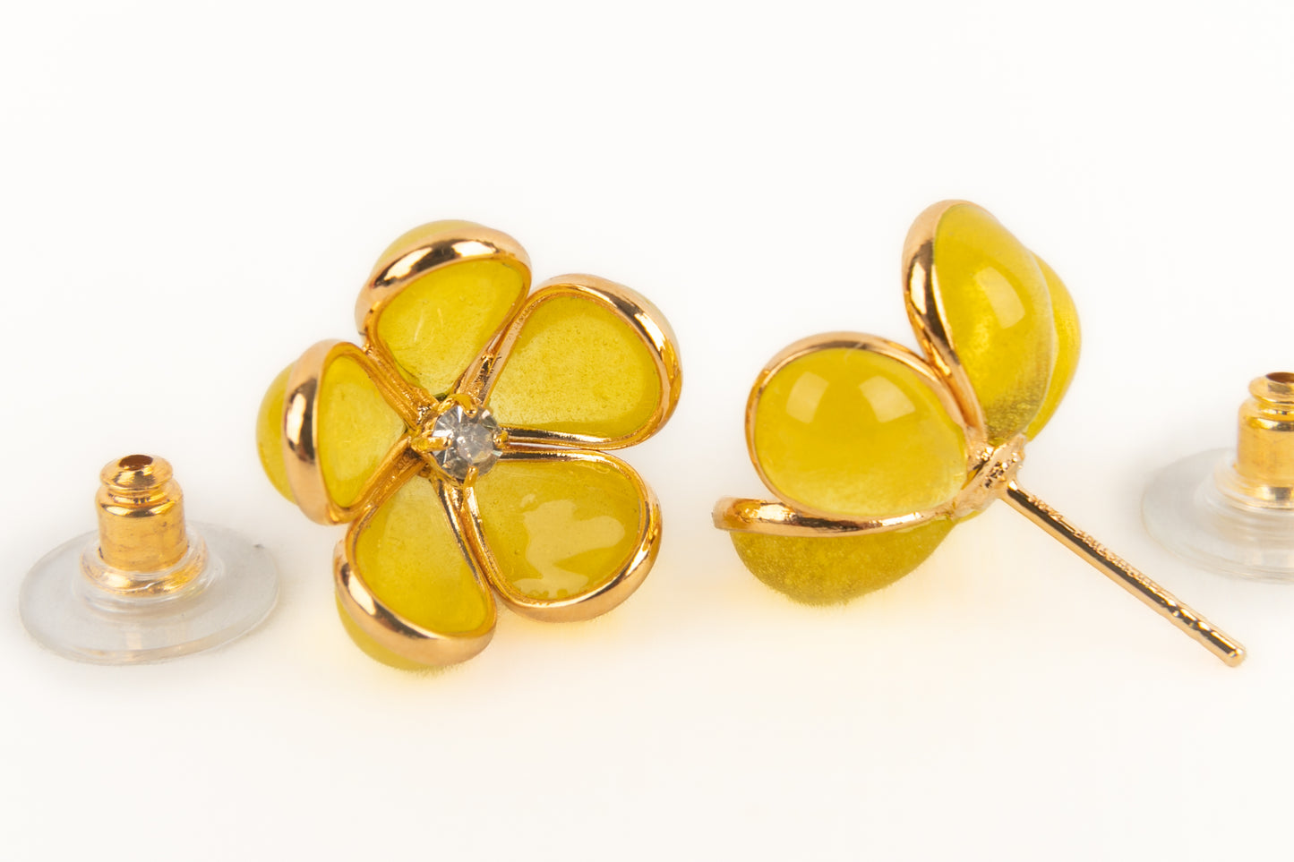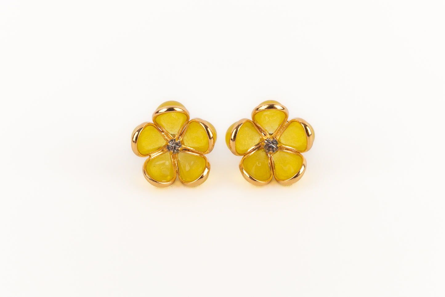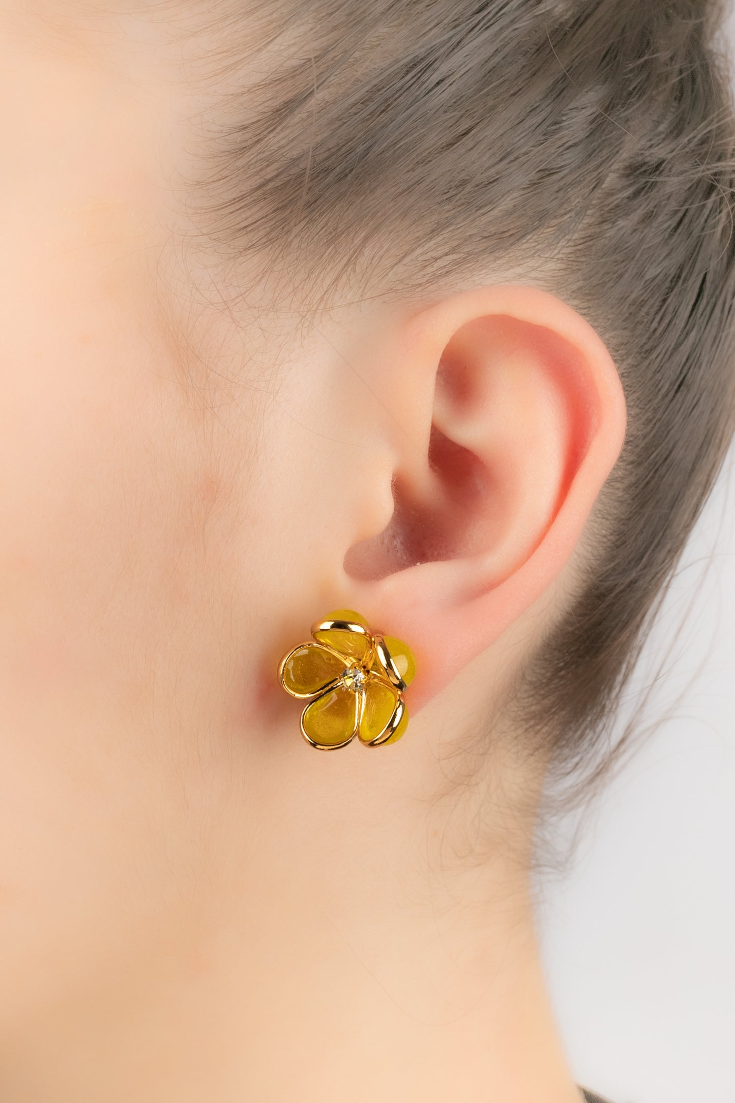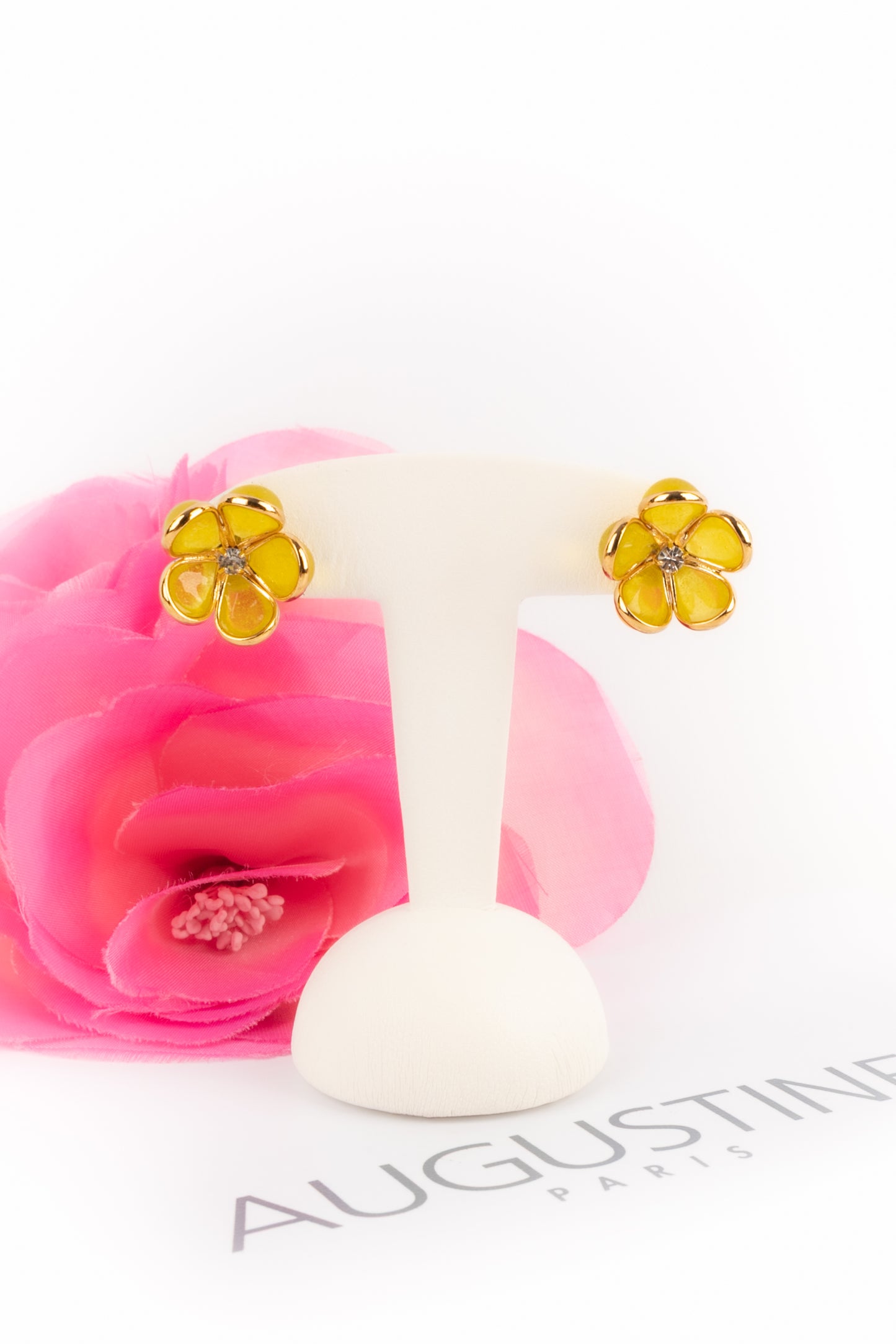 AUGUSTINE - (Made in France) Boucles d'oreilles fleurs en métal doré et pâte de verre jaune.