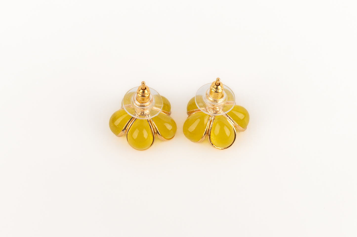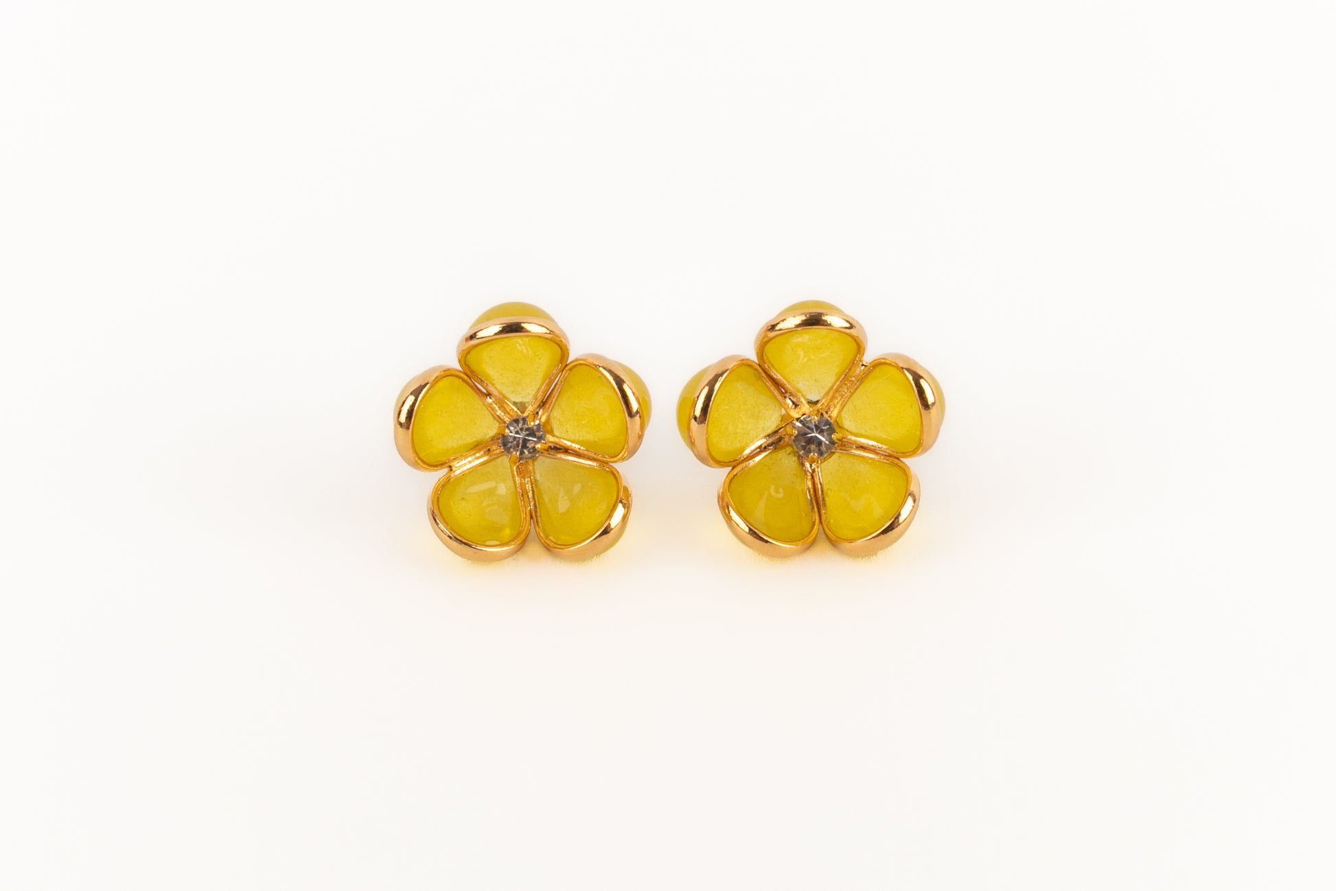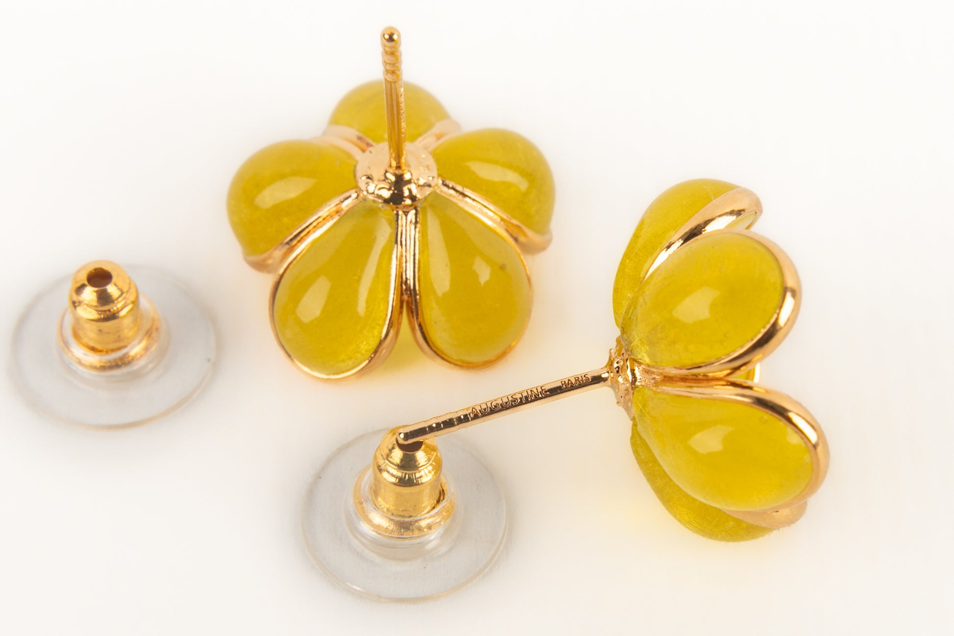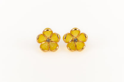 AUGUSTINE - (Made in France) Boucles d'oreilles fleurs en métal doré et pâte de verre jaune.