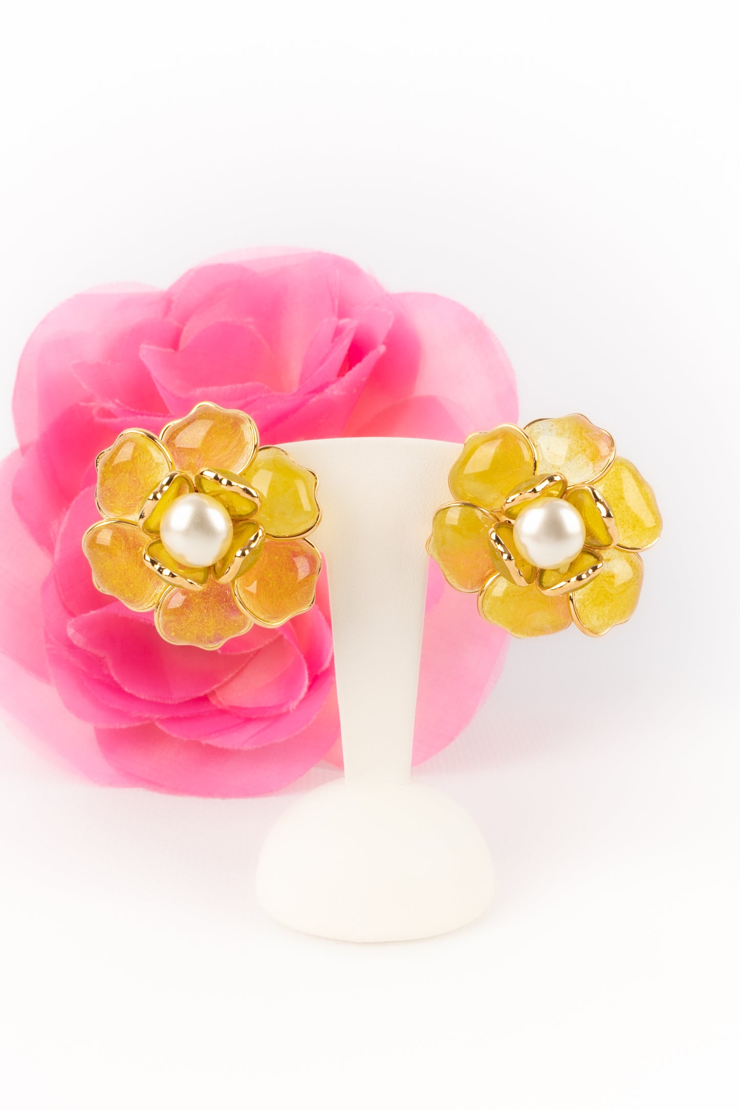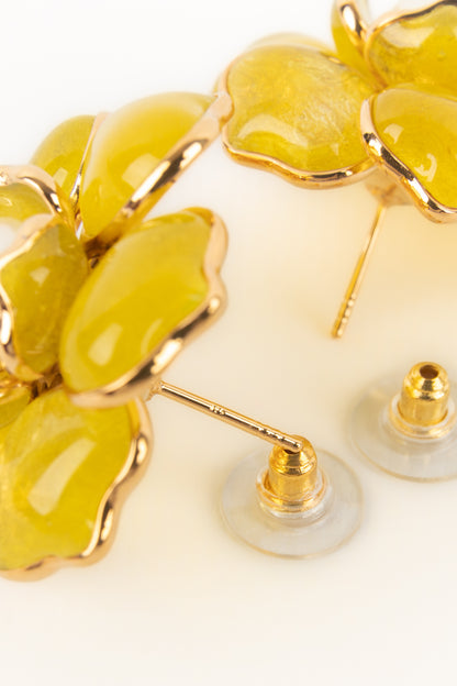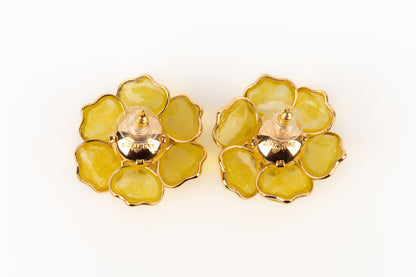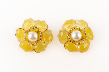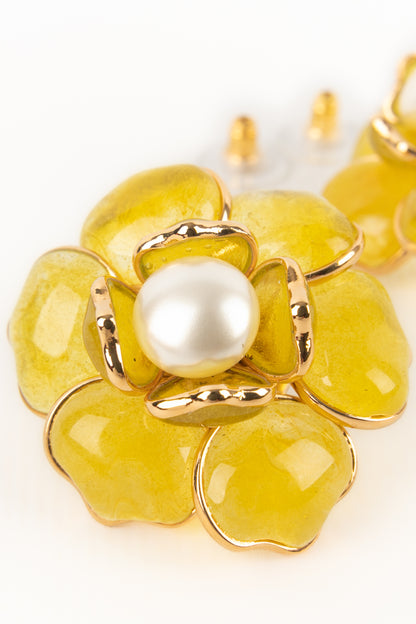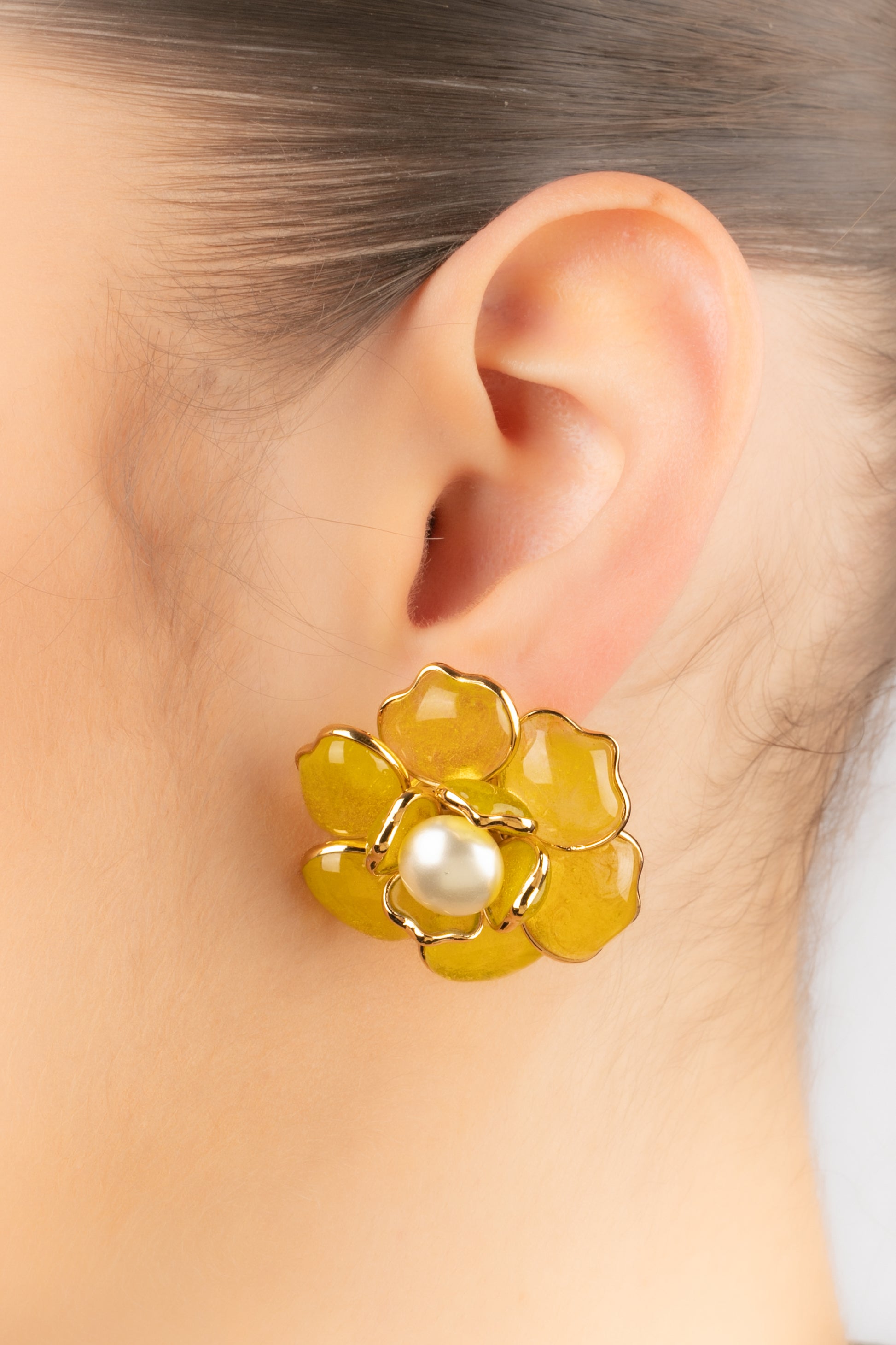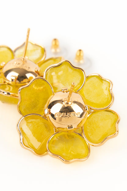AUGUSTINE -(Made in France) Boucles d'oreilles fleurs en métal doré et pâte de verre jaune. Le coeur est un cabochon de nacre fantaisie.